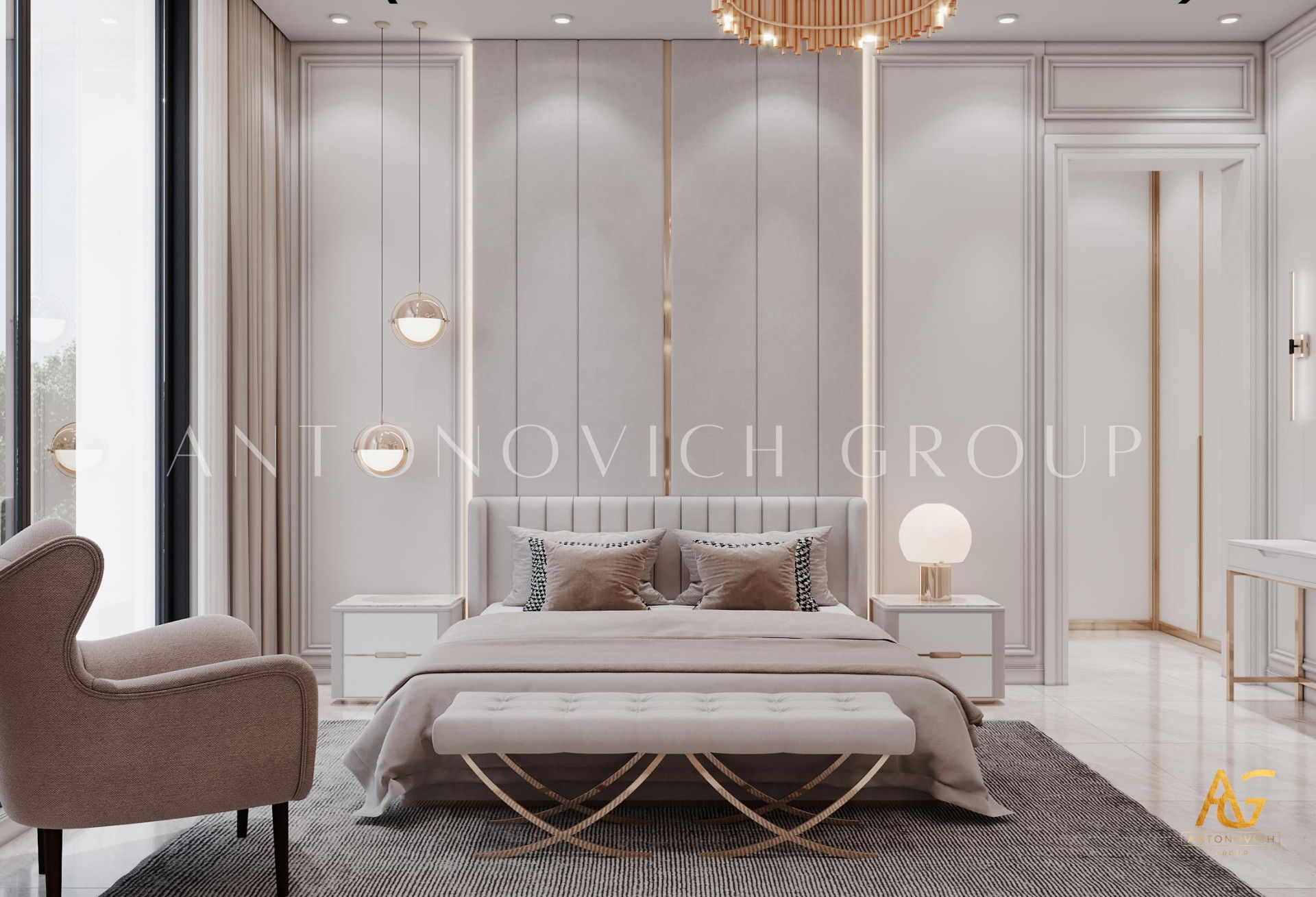 In this bedroom interior design, Luxury Antonovich Design has performed the best decorating techniques wherein every hues and texture that has been implemented has in consistency in style and quality. To become the top interior design company UAE, it has been always a must for Luxury Antonovich Design to keep the high standards towards in every furniture selections, likewise, this bedroom interior design which has the most glamorous setting of exquisite furniture and decoration. Since that the bedroom has a very spacious interior, Luxury Antonovich Design has executed a very artistic setting towards every walls, A set of geometrical shapes using a gold plated accent creates the finest art design that enhances the style and modernity of the bedroom. Dark beige, white and gold was indeed such a luxurious fusion which has been perfectly achieved in this bedroom interior design.