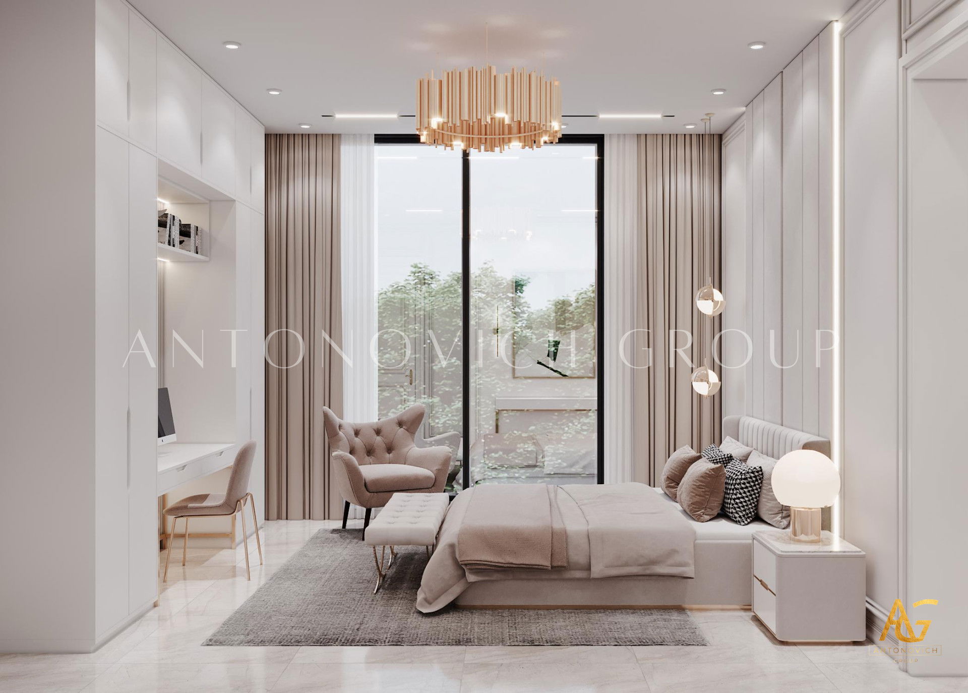 The ceiling scheme of this bedroom has the most wonderful details that aside from having the most luxurious chandelier design, Luxury Antonovich Design performed an amazing scheming towards ceiling details and secondary lighting effect that creates very cozy and calm atmosphere. The chandelier design with a luxurious touch of modern style has black cones covering luxurious details of the base and stem in white and gold color. As the top interior design company UAE, Luxury Antonovich Design keeps on discovering new style and decoration setting that makes the bedroom looks more sophisticated and stylish and with this luxury modern bedroom interior design, Luxury Antonovich Design installed a wall hanging side lamps towards the bed with a matching details of design in the chandlers which achieves the most fascinating result. Luxury bedrooms for expensive villa design have indeed a very remarkable interior setting and as the top interior design company UAE, Luxury Antonovich design always sets the highest standards and new design trend to achieve the best bedroom decoration.