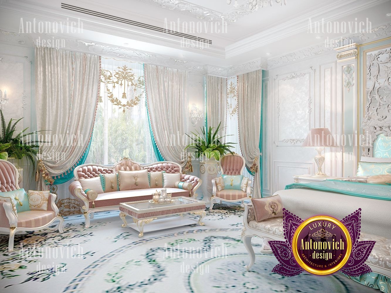Luxury classic style in the interior attracts by the use of most daring designers improvisations. You can play with a palette of shades, materials, a geometry of shapes and lines. The main thing is to create exactly the ideal space that will reflect the character of the owner of the house. This is the only way to achieve perfect harmony. After all, no matter how the designers designed the interior the design studio Antonovich Design is always dedicated to the client, his dreams and hopes to get something unique and exceptional. Looking at this beautiful spacious bedroom you can give definitions for the character of its owner. This is a man with an easy character, an open mind and the ability to see the important small things. It would seem that a discreet range of cool colors in this interior of a beautiful bedroom plays absolutely unexpectedly bright and attractive. Soft velvet of a muted gray shade became the basis of textile design in the interior. The large headboard of the bed and its footboard are upholstered with a soft velvet panel with shallow shrinkage in a geometric ornament. This softness of silvery color continued in the decoration of the large window. Direct folds of the curtains perfectly combined with the white tulle. Even without that, the spacious room has an interesting effect of the infinity of luxurious space. This effect interior designers Dubai achieve with the help of mirrors in the decor, as well as multifaceted ceiling decor. The decorative mirror panel on the wall behind the headboard reflects the beautiful interior dividing it into many beautiful moments.