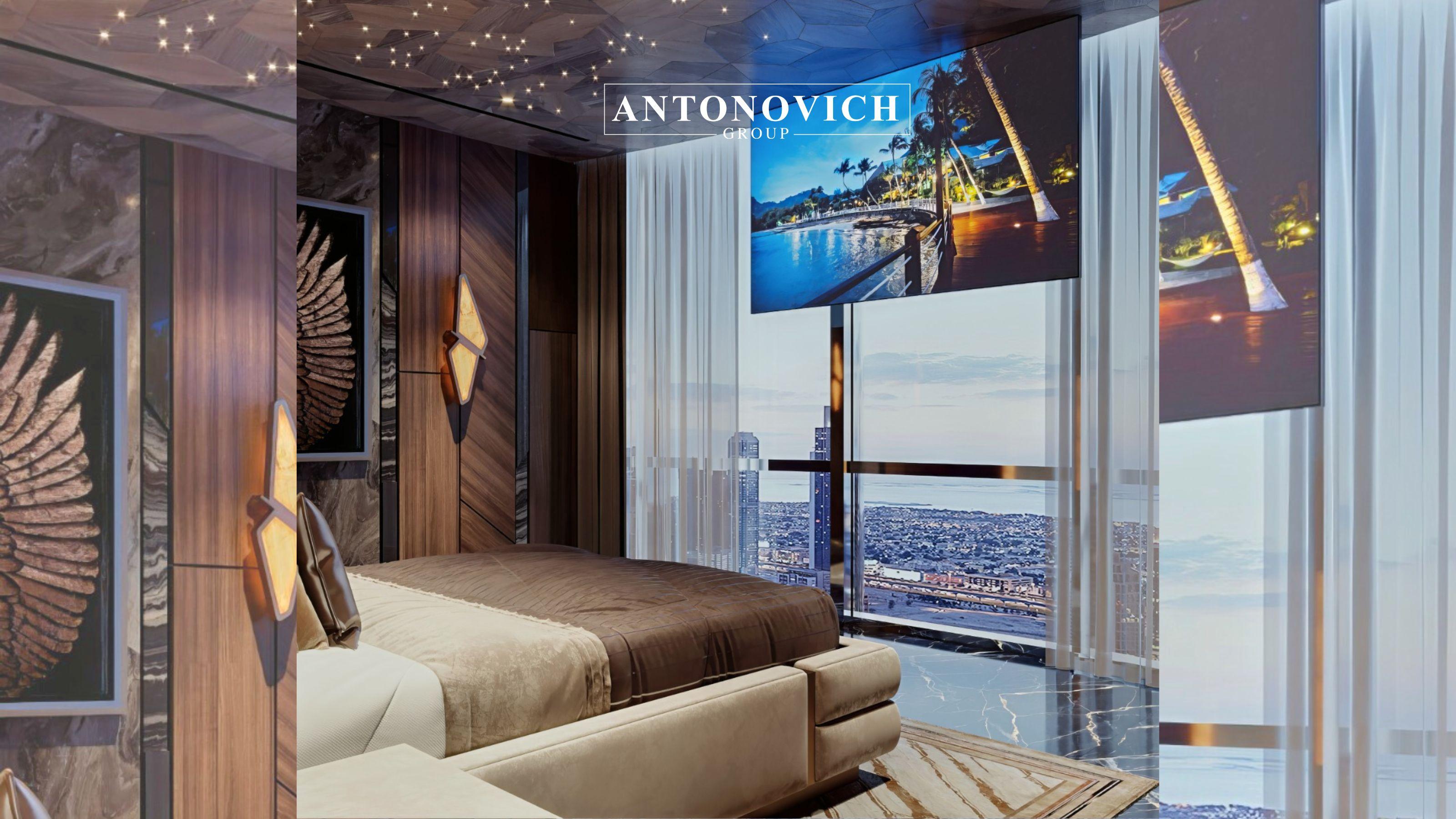 Antonovich Group begins each project with meticulous space planning to enhance openness and functionality. In spacious penthouse bedrooms, the layout is designed to accommodate sleeping, lounging, and dressing areas without visual clutter. Floor-to-ceiling windows are emphasized to frame panoramic views of Downtown Dubai, while architectural elements subtly define each zone.