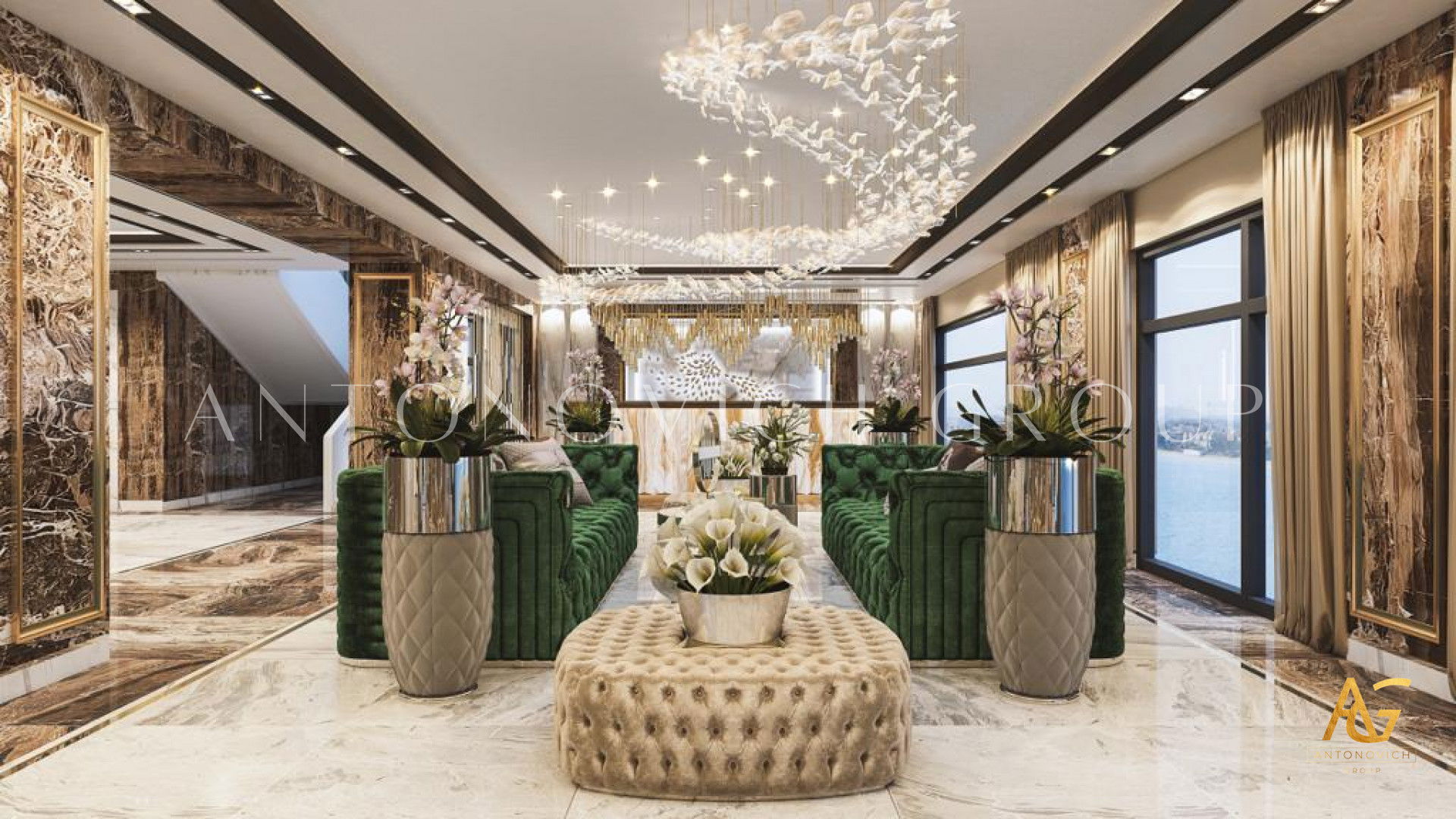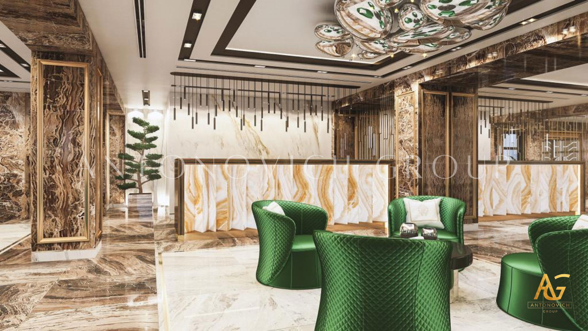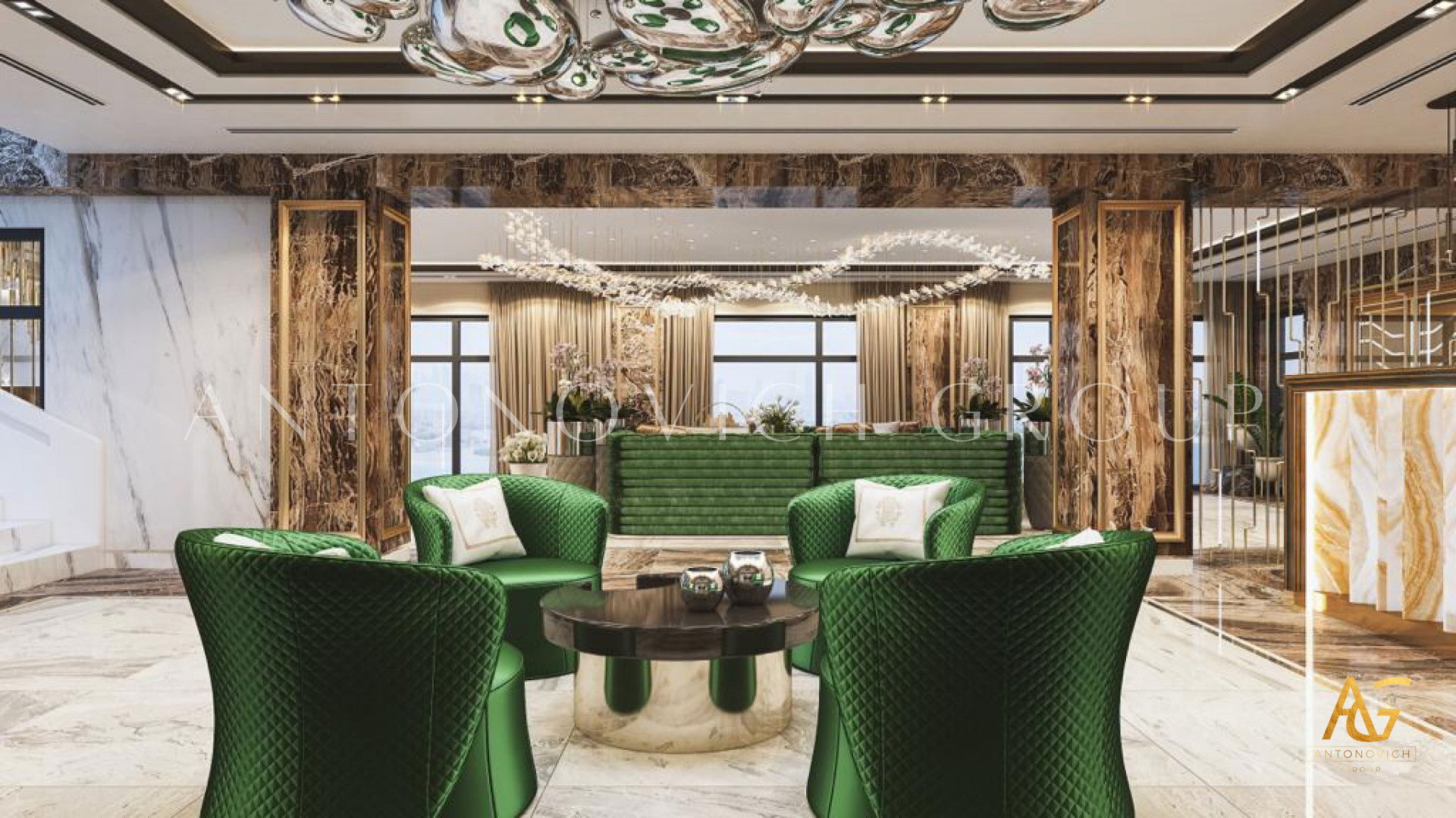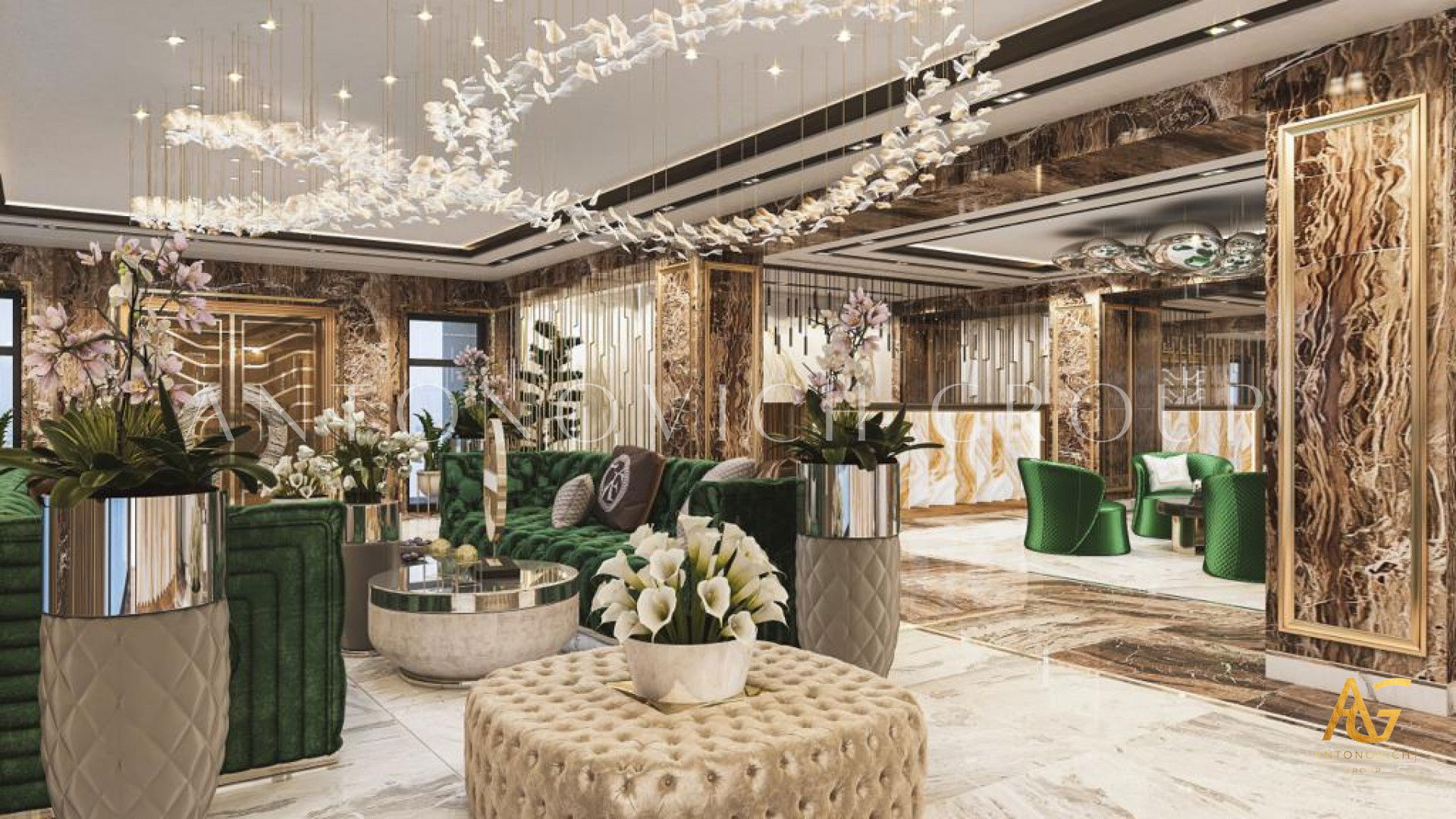 Many people dream of having a soothing lobby Hotel interior design in Riyadh. Take inspiration from this stunning gold and cream decor, which was created for the neighborhoods most affluent residents! The lovely Hotel interior design in Riyadh features a spherical ceiling, which gives the chandelier a great focal point. Below it is a beautiful chair with a gold accent and chair that make this a wonderfully pleasant lobby Hotel interior design in Riyadh. The chair frame is one-of-a-kind as well, with a soft texture for added comfort. The curtains are thick, and a window with a view is meant to wake you up every day. The walls and flooring have been designed with such elegance and refinement. The patterns are lovely and circular, which complement the round-shaped ceiling perfectly. A magnificent table can be found on the other side of the room. With Luxury Antonovich Design, creating a soothing lobby Hotel interior design in Riyadh is simple. Their knowledgeable staff will assist you in achieving your ideal Hotel interior design in Riyadh in Riyadh. There are a variety of styles to fit your business, including this one!