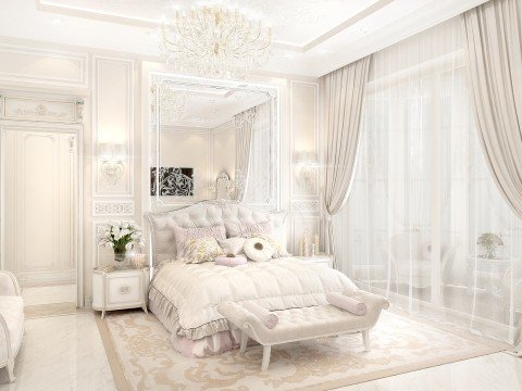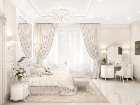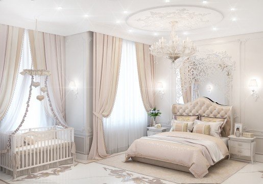 Majority of the items used in this design are made up of soft fabrics, and the round edges of the couch, dresser and the bed itself for a safe environment. The supple bed, couch, carpet and the silky curtains are luring you to go to lie in bed. The baby’s cradle is placed in an area that is near to the bed so the parents can attend to their young ones need instantly. Looking at the bedroom, the hue that was used is like entering a serene room, with the scent of powder and a hint of chamomile and fresh linen. The flooring is made up of polished and sealed Carrara white marble which bounces the lights around the room. White geranium is also placed in vases to promote a soothing effect on the human body while e sleep.