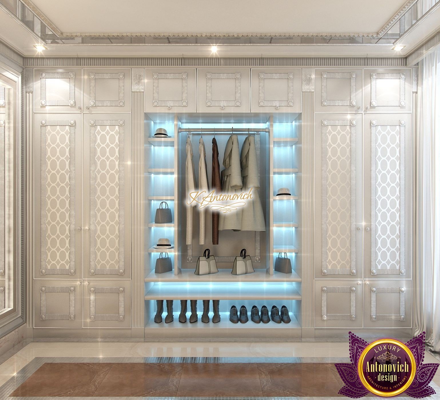 The interior design of the dressing room in the elite house has become a very interesting project. A fairly large room in the building was allocated for the design of the dressing room.That opened up scope for creativity for the interior designers. To ensure proper lighting, the authors of the project proposed to decorate the ceiling with modern lighting fixtures.In general, the design of the dressing room is made in the style of minimalism. The premise is organized as comfortably and functionally as possible.The windows were decorated with modern Roman curtains and blinds. For comfort near the window is a sofa with soft pillows. For convenient storage of accessories, a small insular construction is provided.The bright palette of hues visually expands the space, as well as glossy facades of furniture. In the design of furniture, open shelves with illumination predominate. Thus, the choice of clothes is much simplified.After all, you can visually cover the entire dressing room with a glance. The highlight of the design of the dressing room project become a small work area.This is a great place to relax and think about your ideas. Such a wish of the owners of the house found its perfect embodiment in the dressing room design.