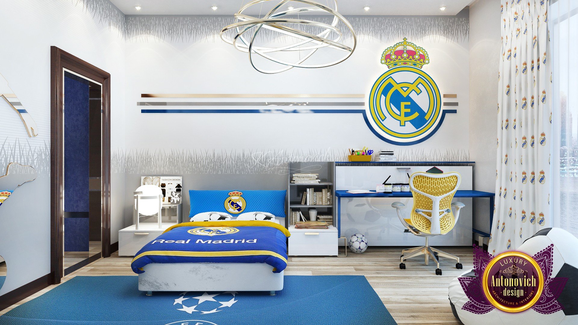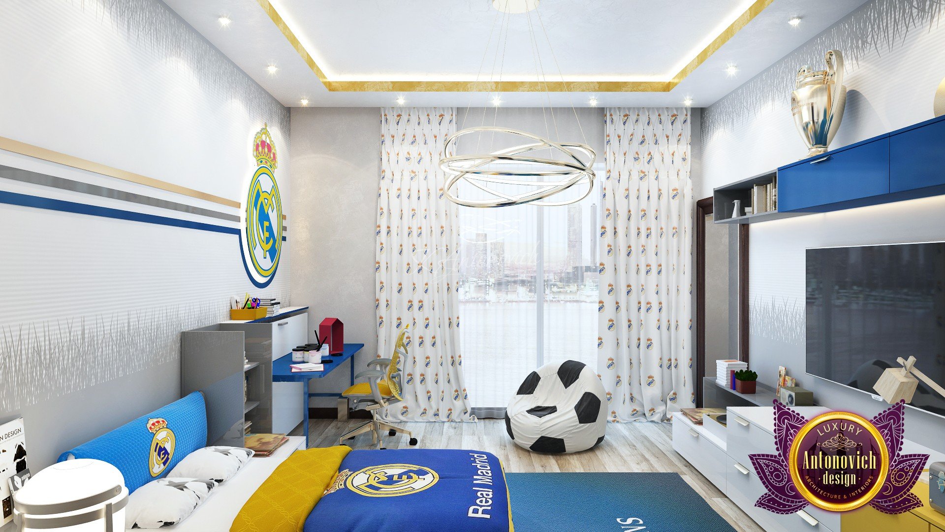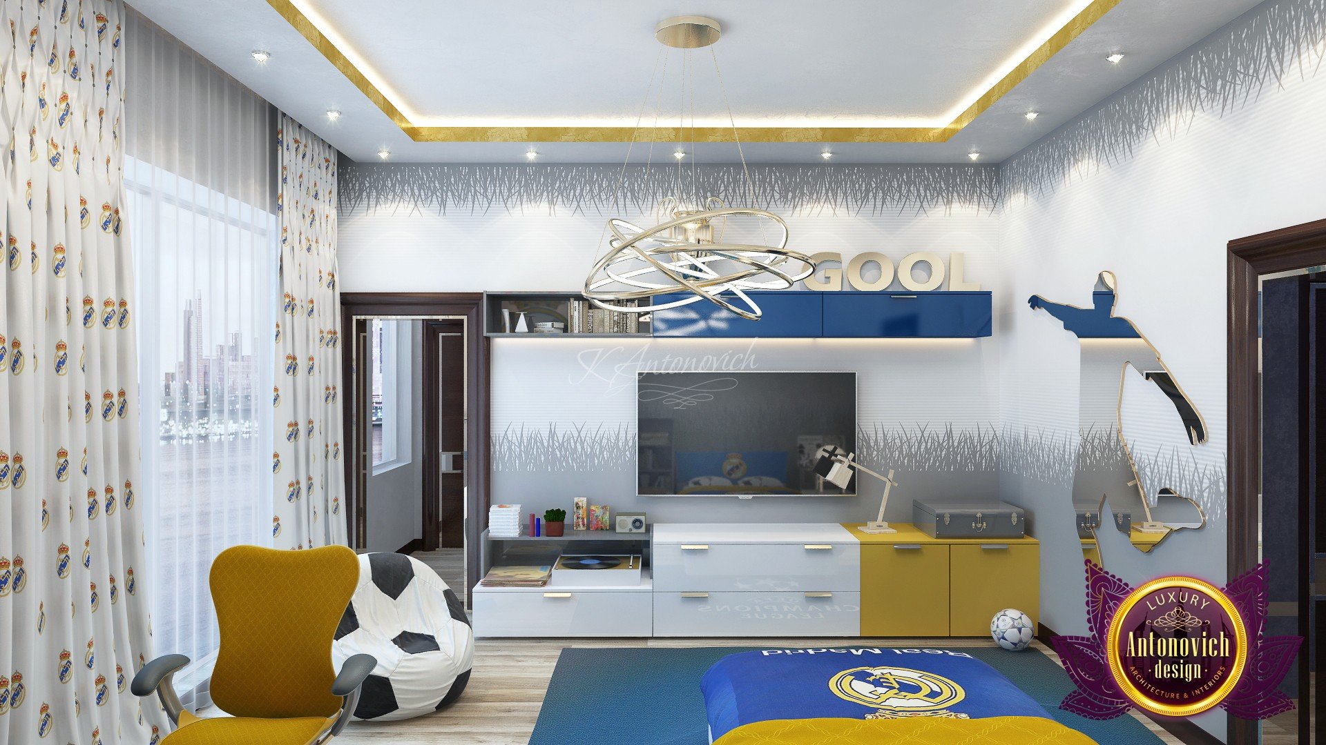 Taking the sporty approach. This soccer-inspired boy’s room, by Luxury Antonovich Design, is the perfect mixture of fun and sophistication, the team made sure to incorporate soccer elements such as the soccer ball customized chair, the soccer player decal also adds a fun and sporty look to the room. The bright paint of yellow and blue creates a fun theme that is warm and still elegant. This bedroom has a modern design that is just perfect for boys. Your child will be lucky to have this sports-themed boy’s bedroom because of its cool details that they will surely love. The design is elaborately decorative which indicates that your child has a passion for sports and games. The beautiful and comfortable bedding has a print of your childs favorite theme to keep it as a reminder to strive hard with their passion for soccer. We make sure to provide the perfect place for your little guy which coordinates well with the entire theme of your childs bedroom. Having his own bedroom is a perfect place for your kids to let explore their creativity and showcase their beautiful personality. Our team offers a lot of different bedroom designs for your kids., from sports design to space inspired. Whatever design you have in mind we can recreate it for your kids. We add a pop of color to your boys bedroom by painting it with yellow and blue with a base color of white for a more bright and relaxed look. If your big kid is growing up becoming a sports fanatic, then it is perfect to apply it with their bedroom design to remind them about how much they love this sport. Send us a message if youd love to spice up your kids bedroom to something better and brighter. Feel free to let us know about your needs and well gladly help you achieve it.