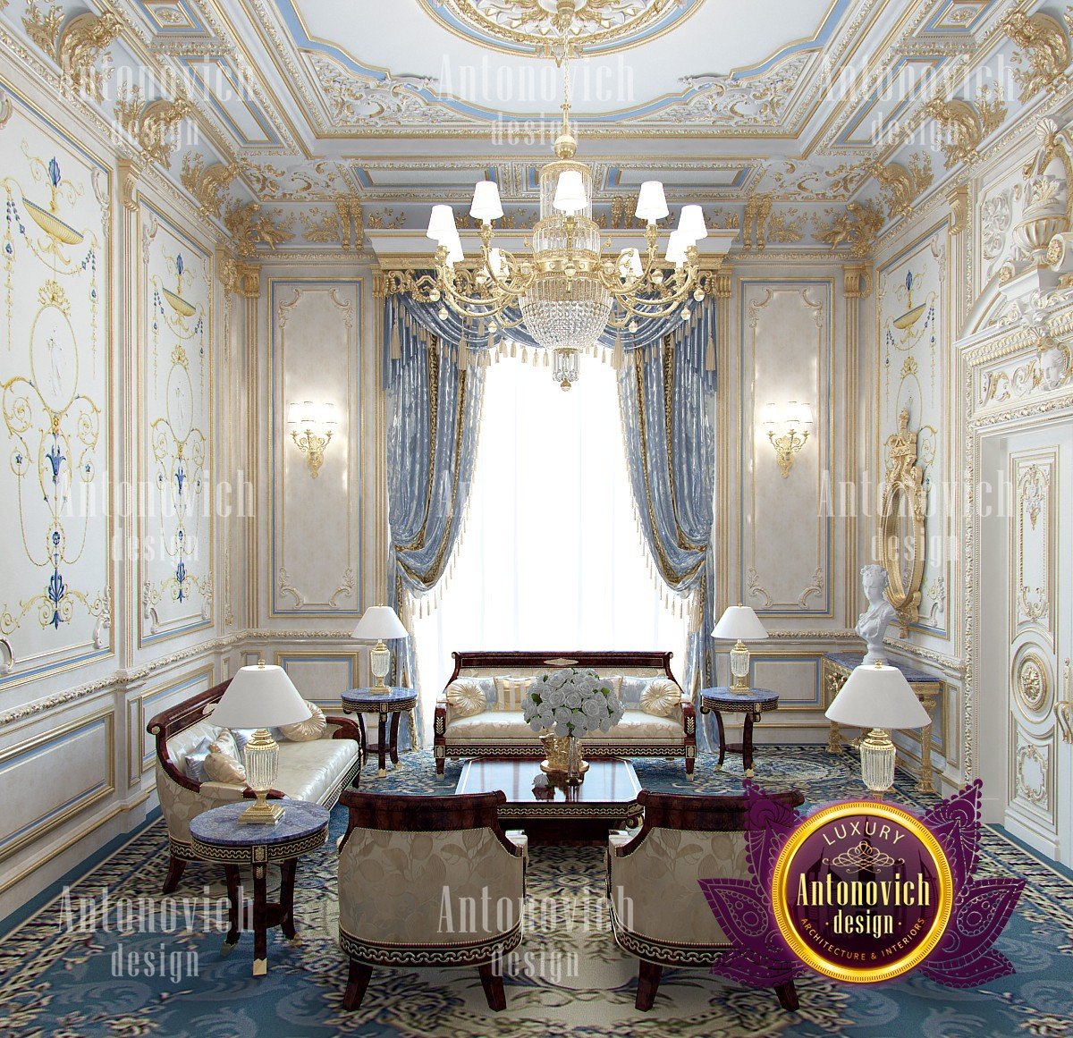 If you drew your own palace in dreams, then surely the image was similar to this royal living room. Baroque, rococo and classical style have merged here together. Designers of the studio Luxury Antonovich Design have developed a project of an elite villa in the classical style. Each room in the house is a celebration of beauty, luxury, and splendor. The rich decor of walls, ceilings, and floors fully corresponds to the best traditions of these three styles. The relatively small space of the living room interior has the advantage of high ceilings. This moment allowed the designers to use the magnificent decor in the form of stucco molding, gilding, and decorative plaster. The combination of white hue, blue and gold is the best exquisite option for such interiors. In the decoration of the walls, the Buiseri are filled with exquisite motifs of artistic painting. To provide the interior with the maximum sense of warmth of home comfort, along with the entire perimeter, the floor was decorated with a luxurious Persian carpet of blue tones. Design curtains for the living room in the classical style have become one of the most elegant moments. Silk velvet of blue color perfectly blended into the interior. A soft wave of lambrequin is supplemented with brushes. With the help of soft holders, beautiful creases of drapery are formed. And finishes this beautiful picture of the interior of the living room with beautiful furniture in classic style. Sofas and armchairs from a dark valuable wood looking gorgeously with noble textiles in light colors with printed ornaments. And the interior is illuminated by a beautiful chandelier with crystal pendants.