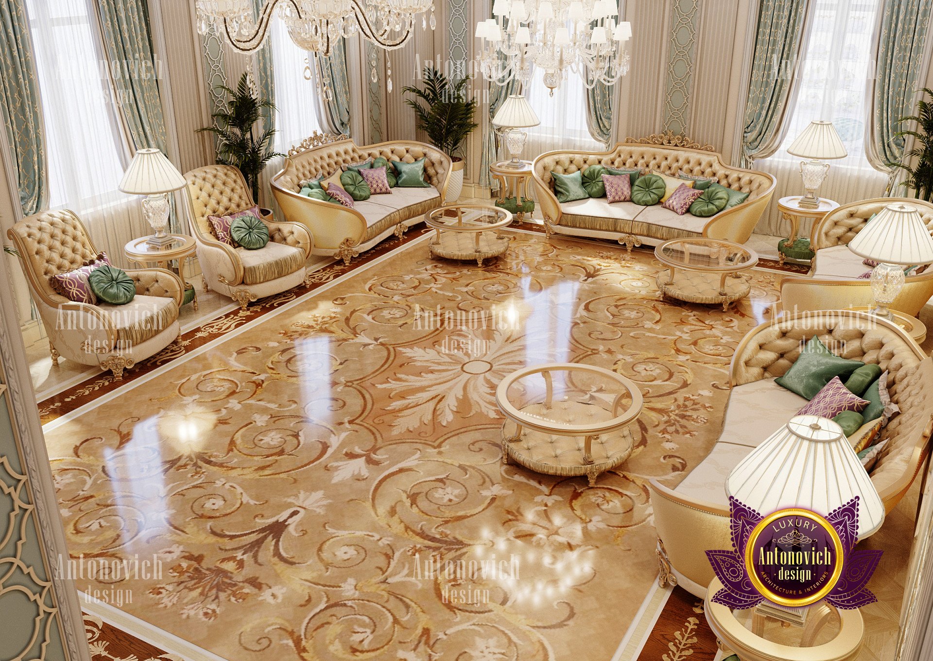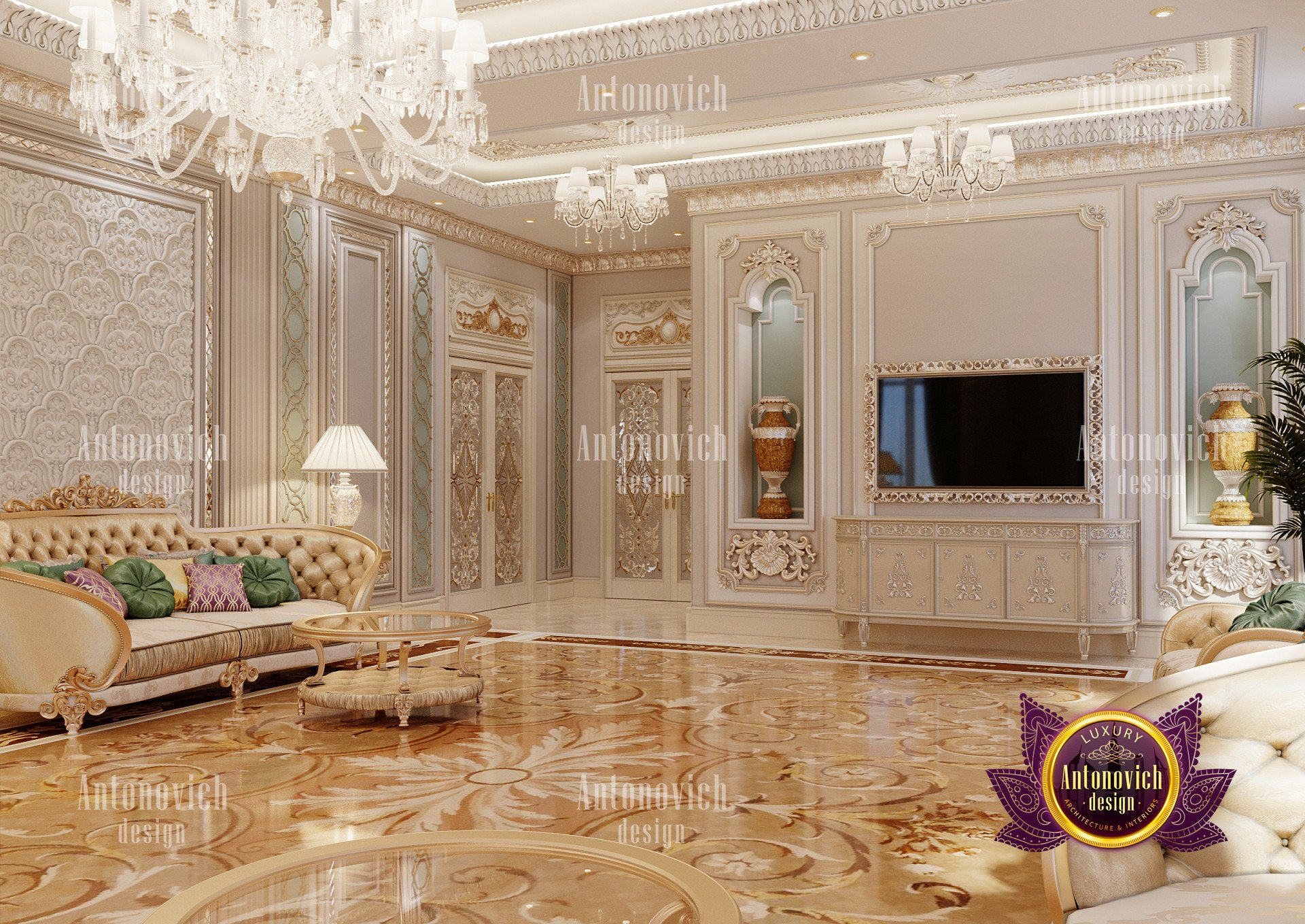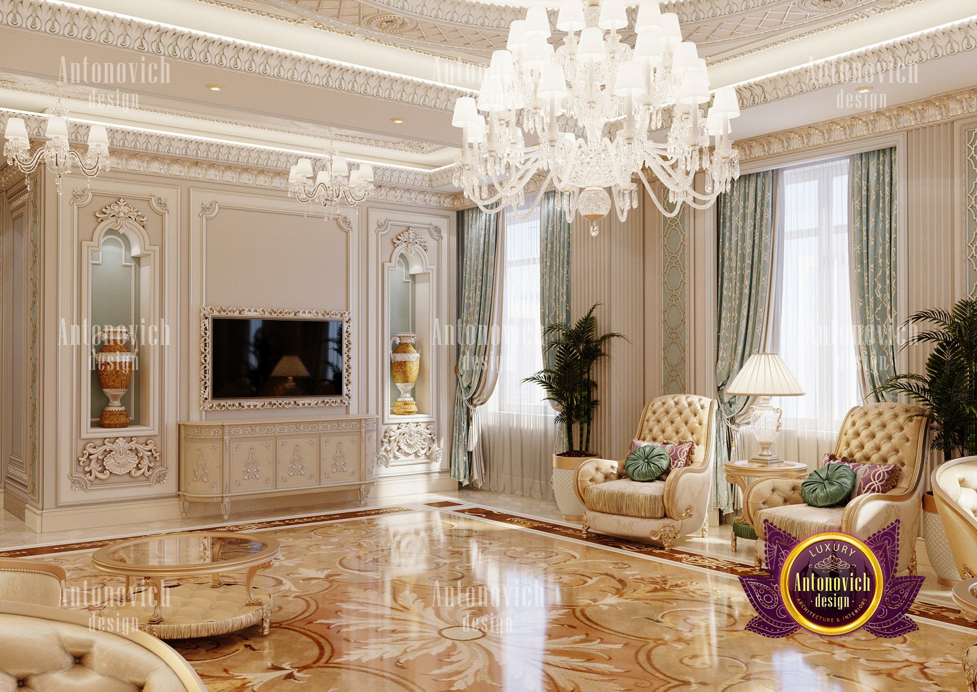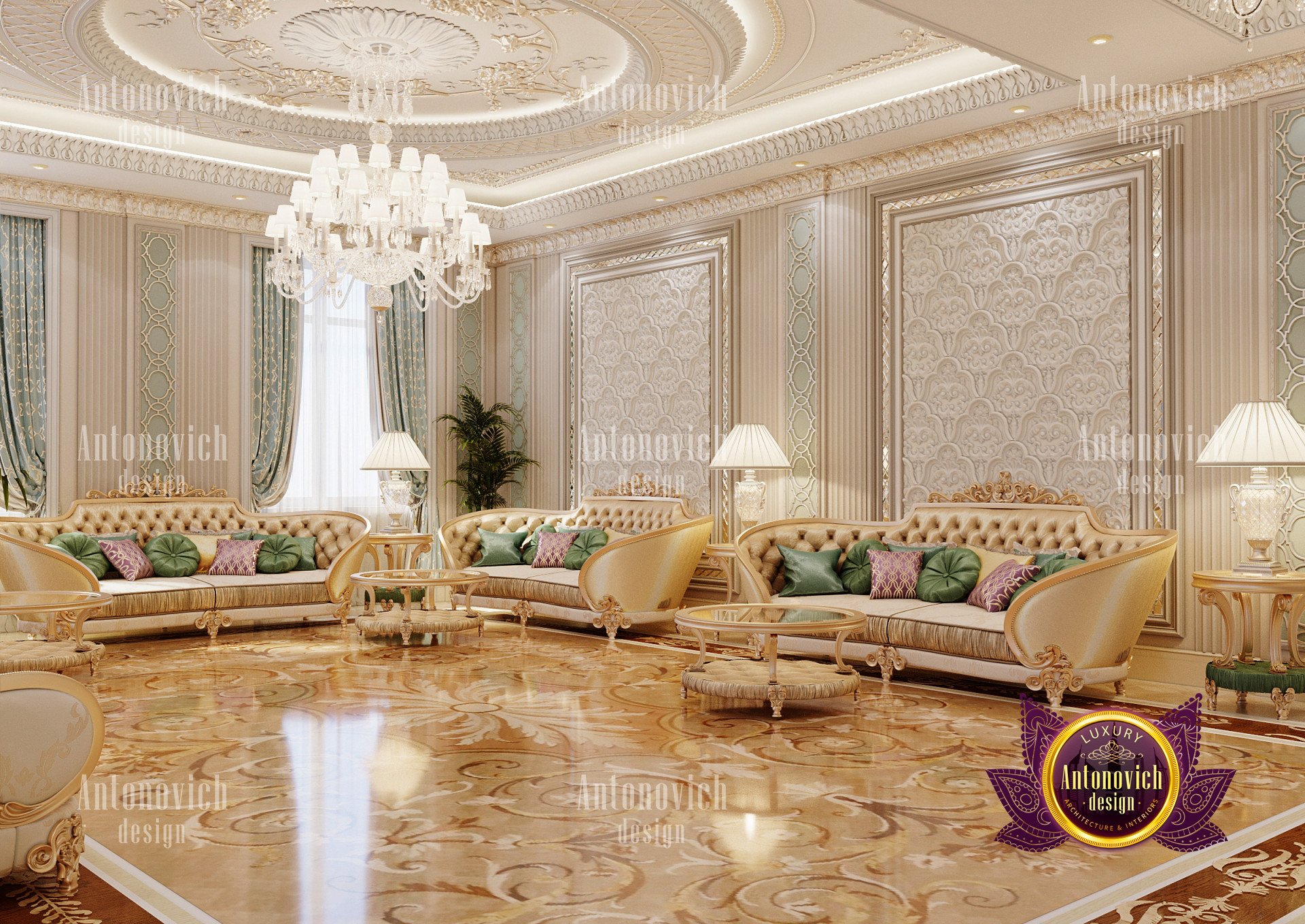A large living room with a fantastic color scheme. This great luxury living room interior design and decor are top-notch, with elegant furniture that complements the rooms luxury atmosphere. The interior design incorporates premium features and furniture that complement Dubais natural beauty. The color, like the rest of the luxury living room interior design, is incredibly relaxing. The room is designed to exude class and luxury throughout the space, adding to the elegance of the beautiful room.
