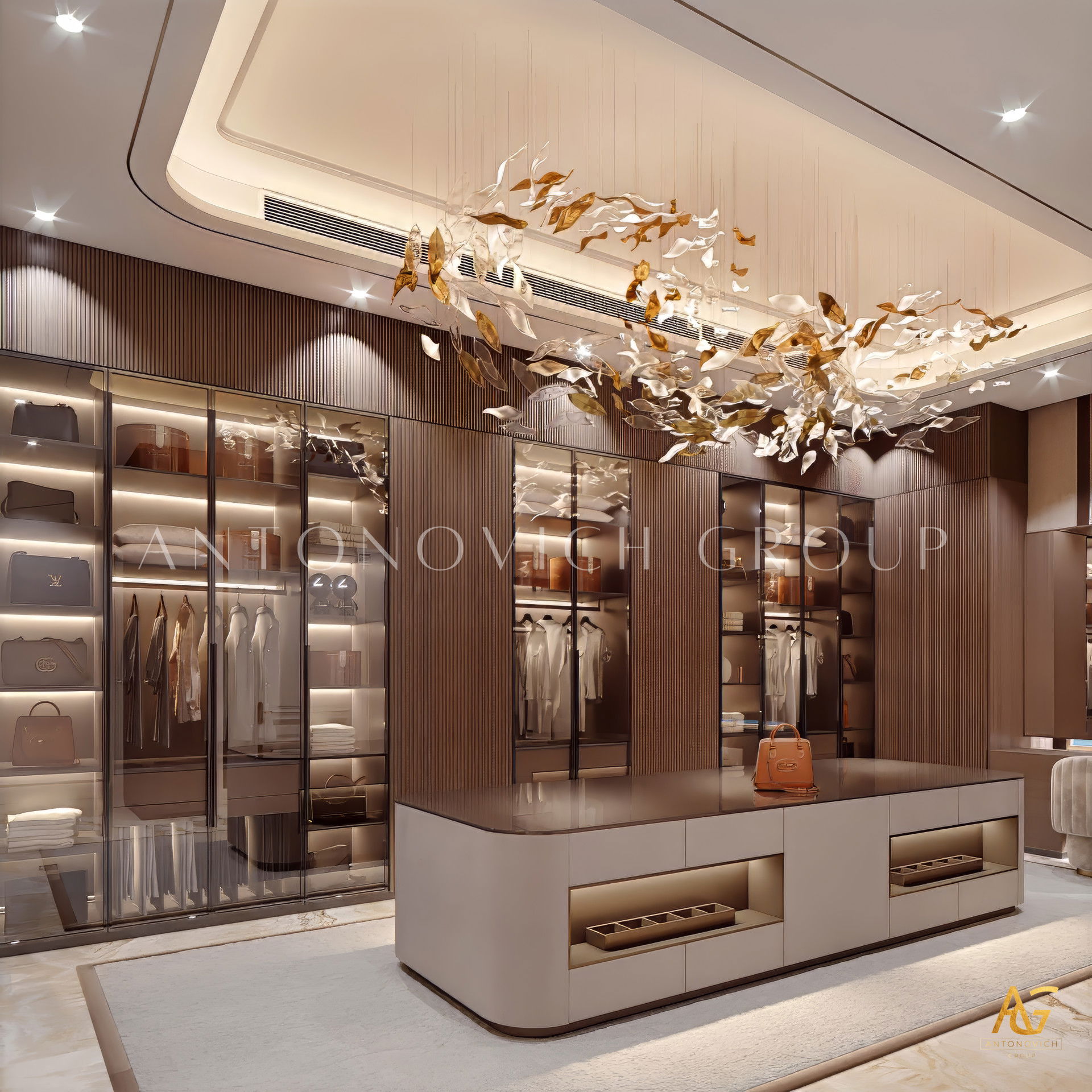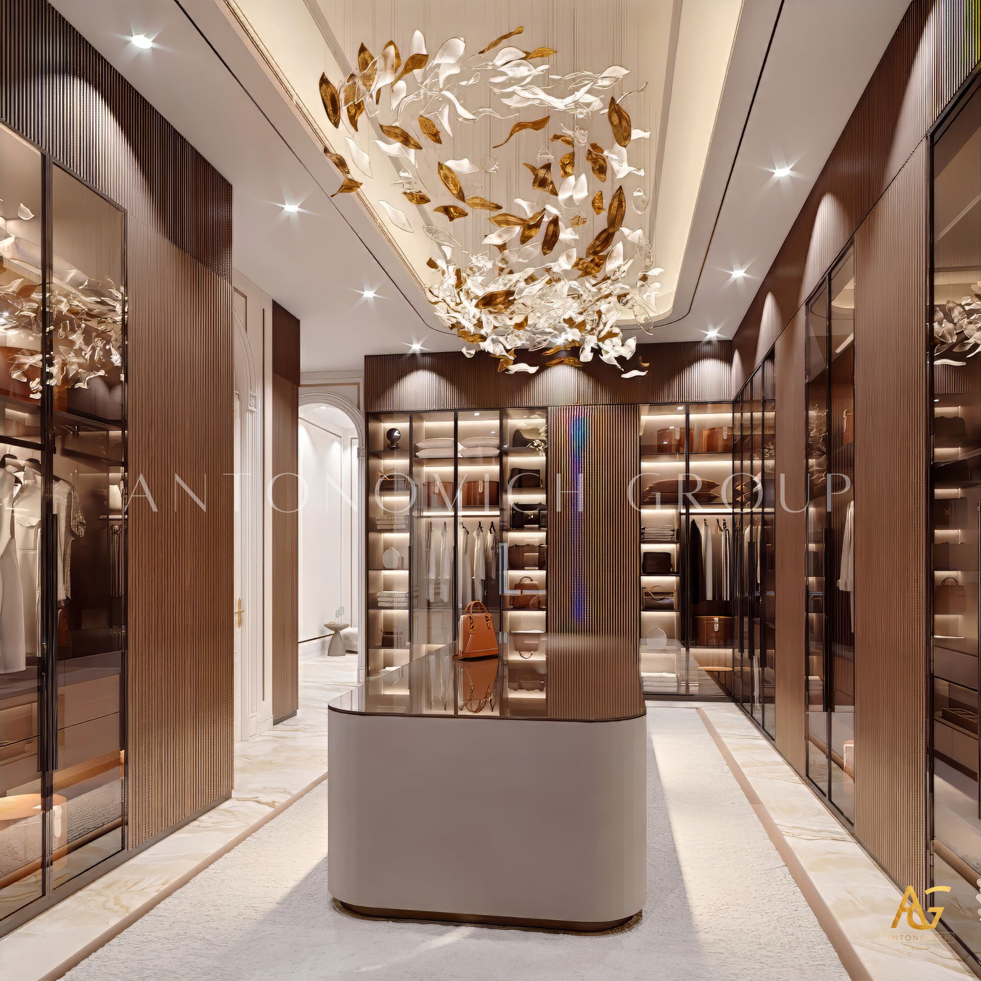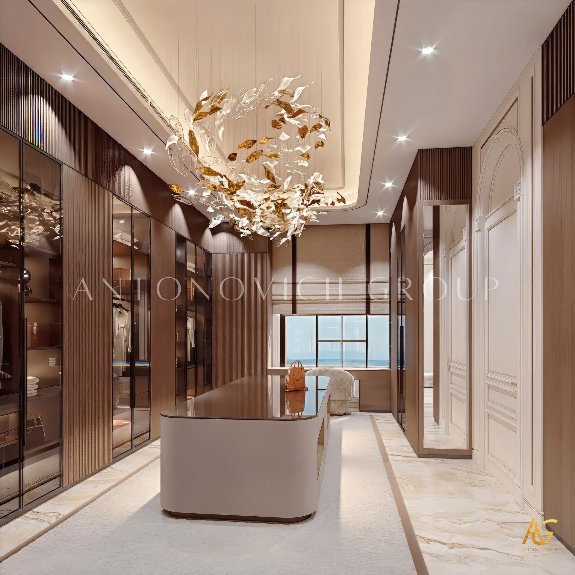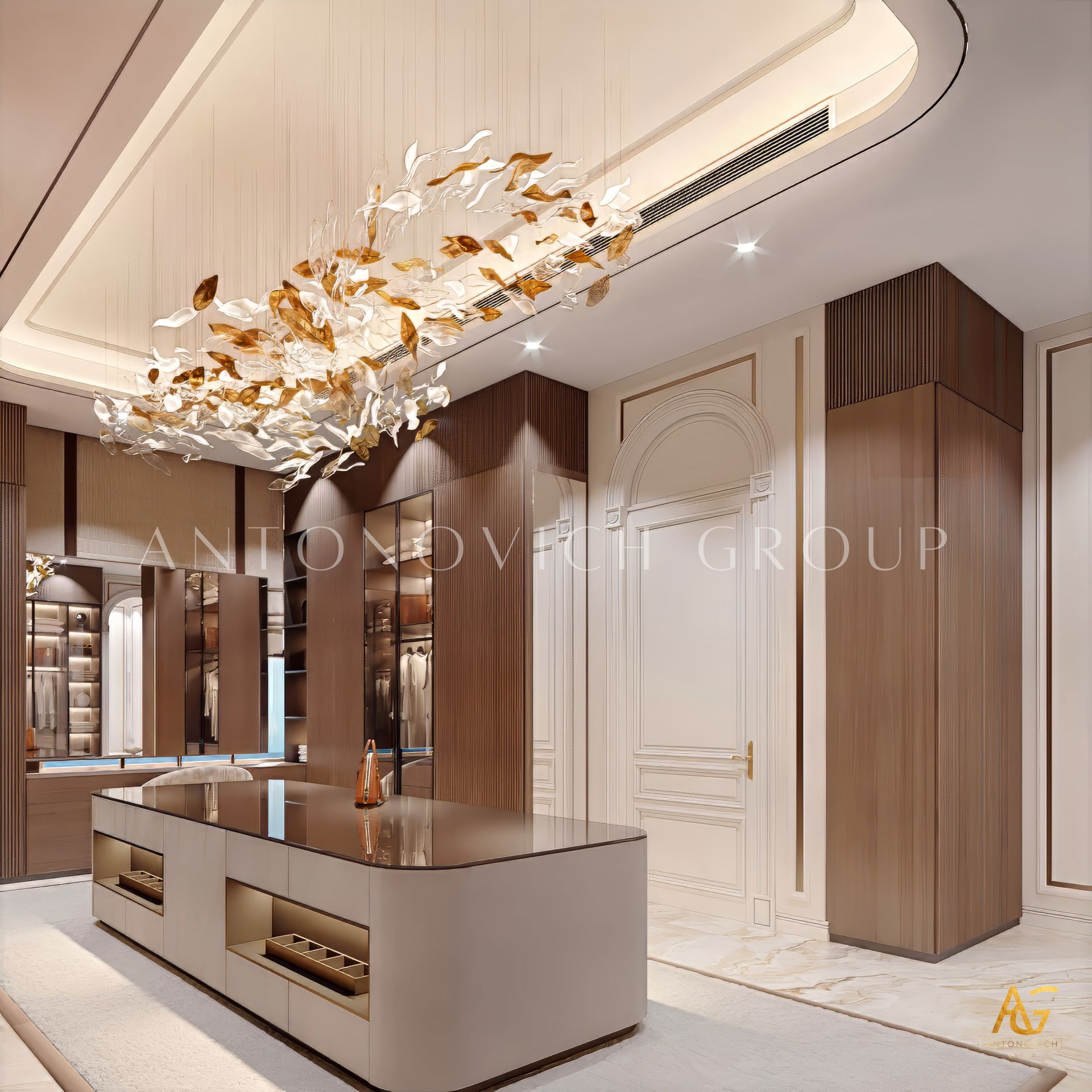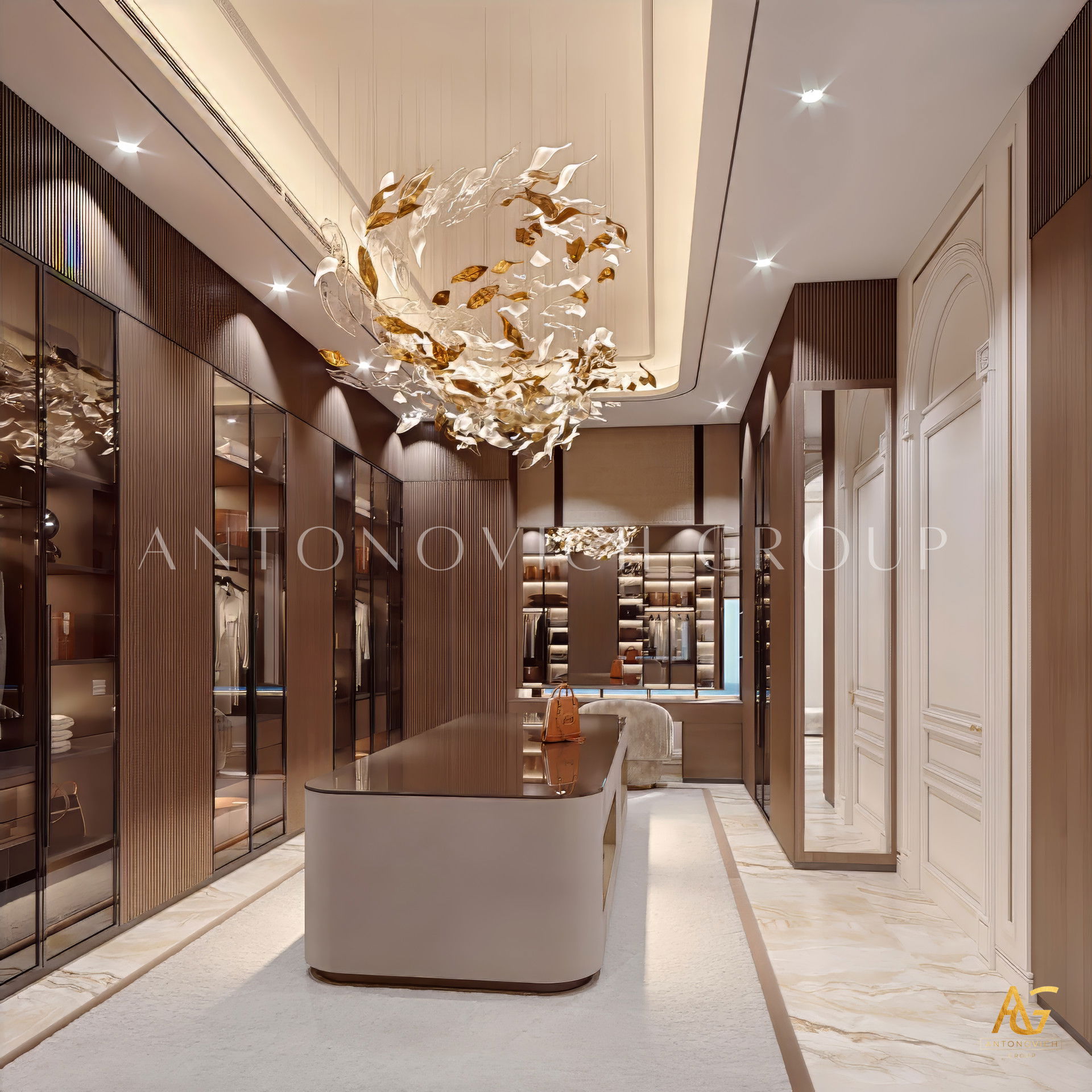 This premium interior design also includes magnificent racks and cabinets. Its stunning finish is ideal for a luxury interior design. The table itself is beautifully designed. The chairs are very large, which gives you more room to dress up. The interior design of the luxury dressing room interior design also features fantastic lighting. The chandelier gives the impression that the room is expensive. The lamps are also beautifully designed, adding to the luxury dressing room interior designs lovely mood. This is the ideal luxury interior design for you!