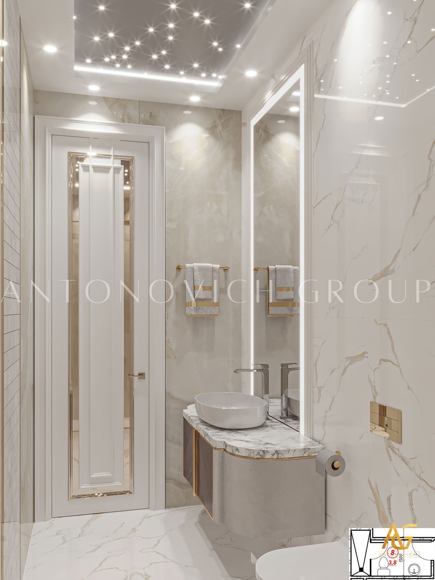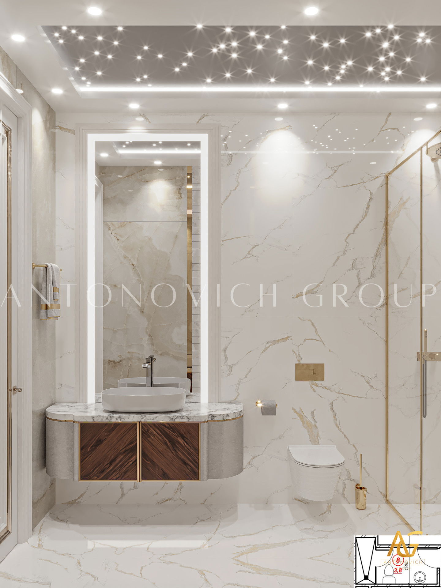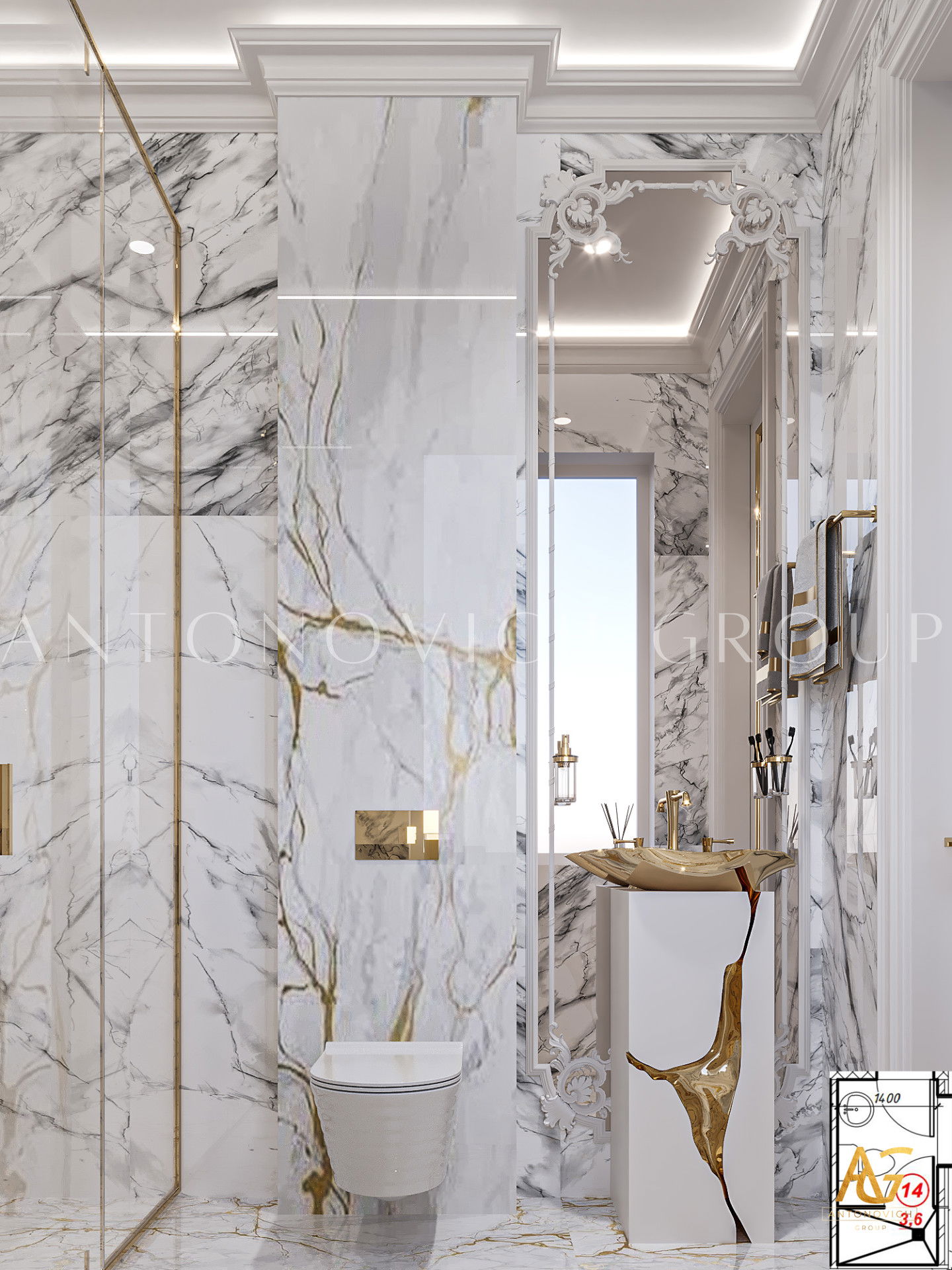 Antonovich Group provides complete bathroom and powder room interior design services from start to finish. From design visualization to construction, remodeling, renovation, redecoration, fit-out, sanitary material selections, premium class bathroom equipment, installation, and repair to the final turn-key solution, we have you covered. Our team makes every effort to perform the perfect interior design arrangement in every bathroom with the most unique and stylish design like no other. Our high standards in performing every interior fit-out procedure are always consistent, as we always meet and exceed our clients expectations.