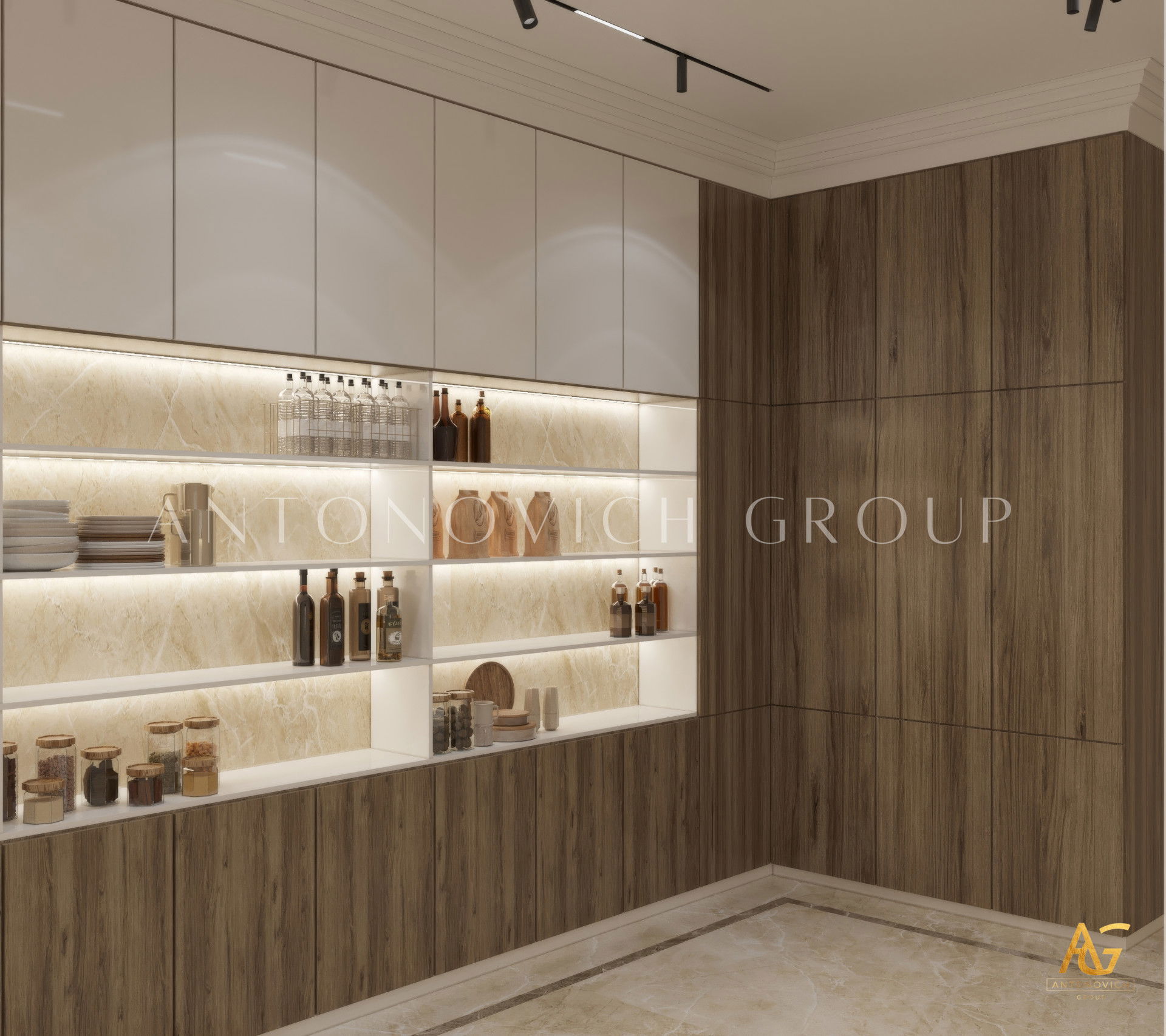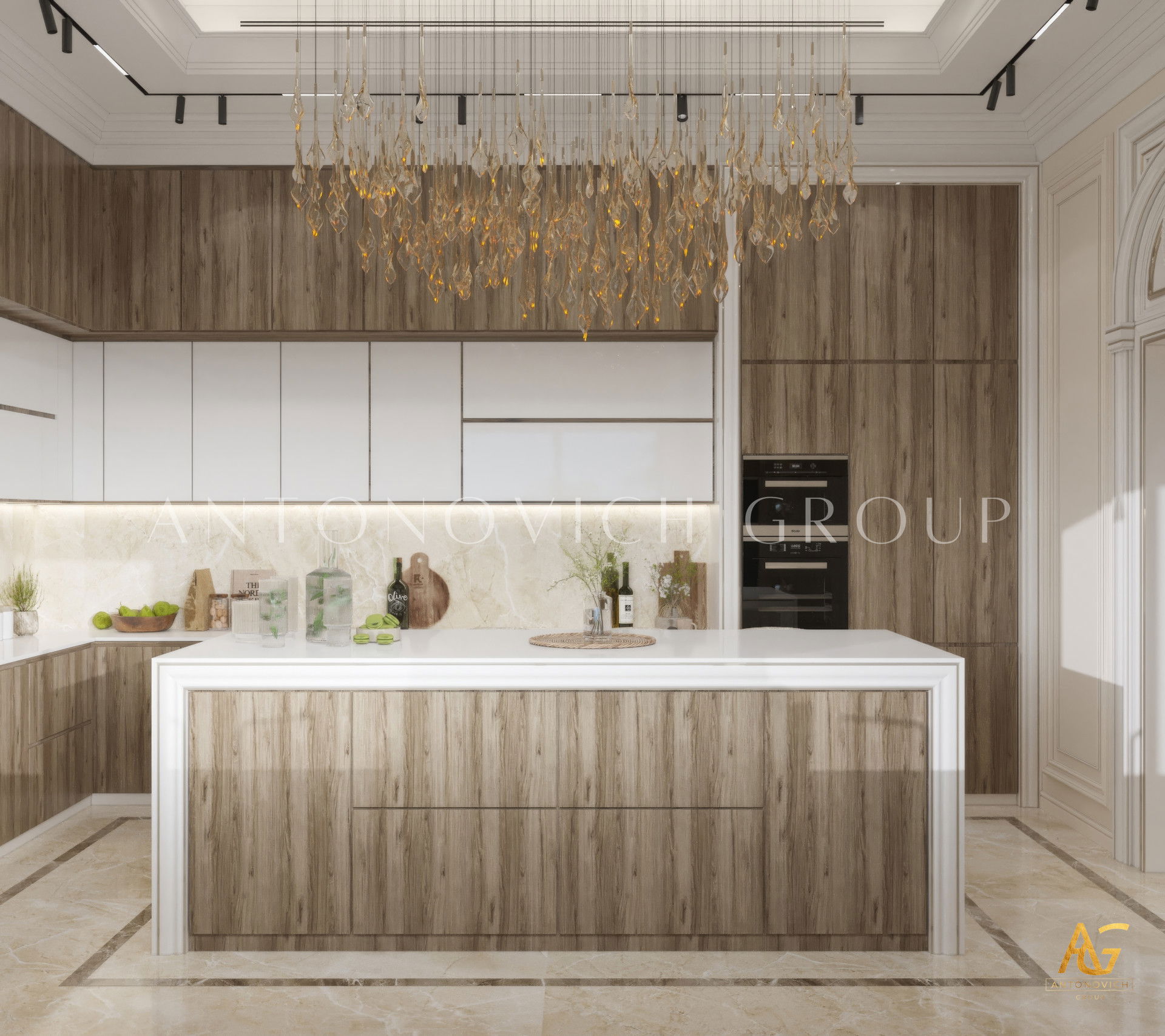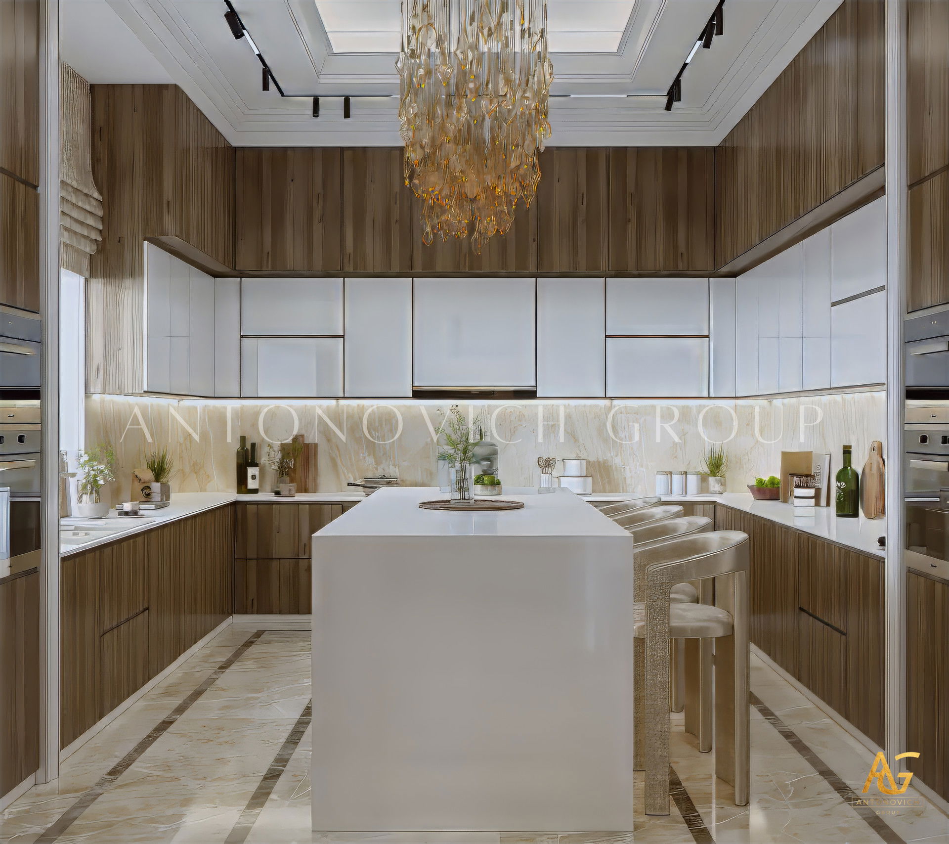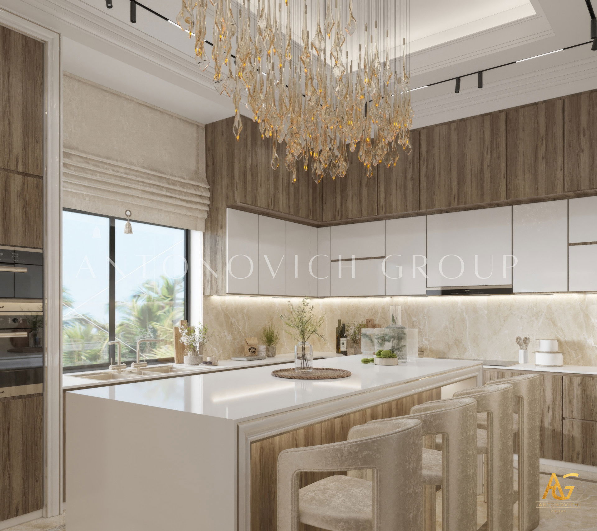 Interesting design of the kitchen in a modern style was offered by interior designers of the studio Luxury Antonovich Design. The interior is designed in the style of minimalism and is characterized by many-sided solutions in the use of decor materials and lighting. Kitchen design ideas are always aimed at creating maximum functionality when using this space. This is a rectangular kitchen format with an insular working surface. This bold and original solution was the result of one of the wishes of our customers. They travel a lot and decided to embody the idea of one of their favorite restaurants in Asia where the food is prepared right next to the visitors. Modern kitchen appliances can easily implement such design solutions. To emphasize an insular working area, interior designers used a luxurious framing in the form of a beautiful marble with silver stripes on the floor.The super design of the kitchen pleased the customers with the perfect harmony of lines, materials, and textures. The design of the kitchen for the house is laconic due to the selection of furniture.Kitchen furniture with light facades occupies the kitchen space almost along the entire perimeter. This allows you to conveniently store everything you need. The interior and design of modern kitchens also imply the use of the latest storage systems. Today it is the most automated and high-tech designs that make the use of kitchen furniture as convenient as possible.The design of the kitchen Dubai harmoniously continued the design of other rooms. The curtains become a beautiful accent in the interior of the kitchen. This is a variant of Roman curtains premium class.Ideas for interiors design of kitchen by the studio Antonovich Design is always an exclusive solution. Our goal is to make the kitchen design not only comfortable and functional but also as luxurious as possible in any style.