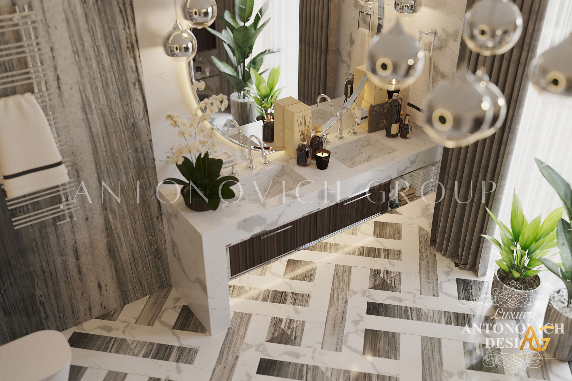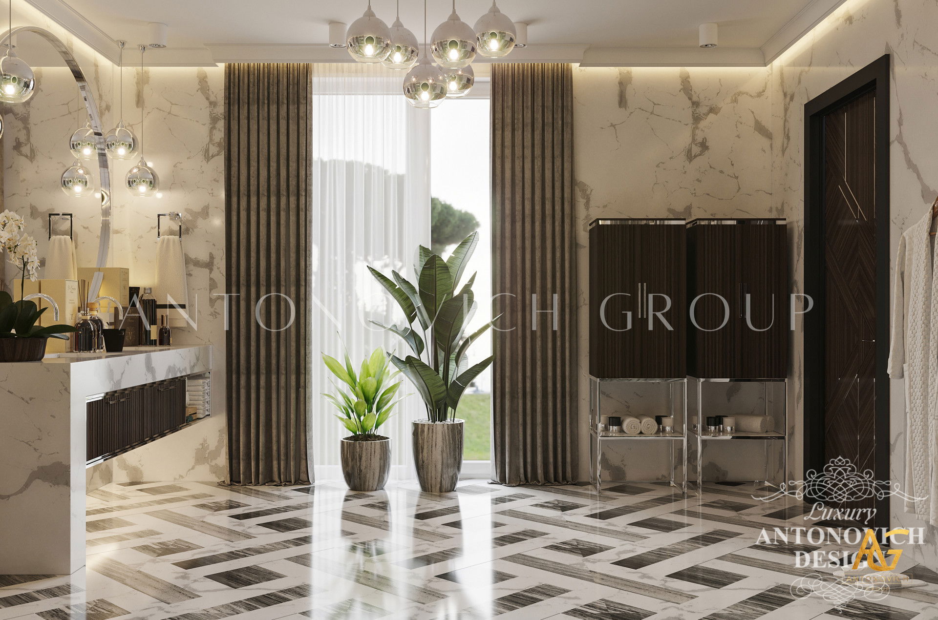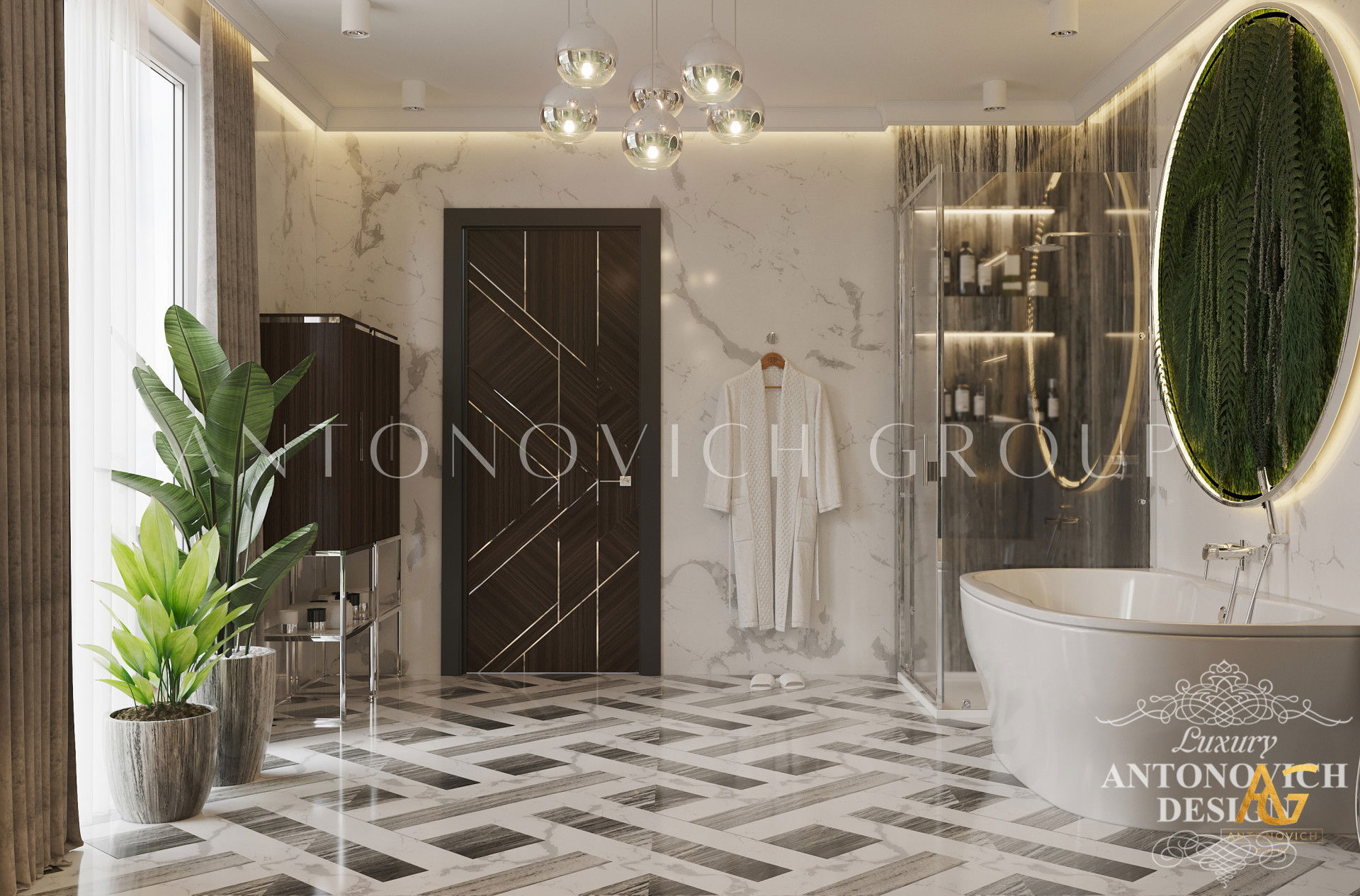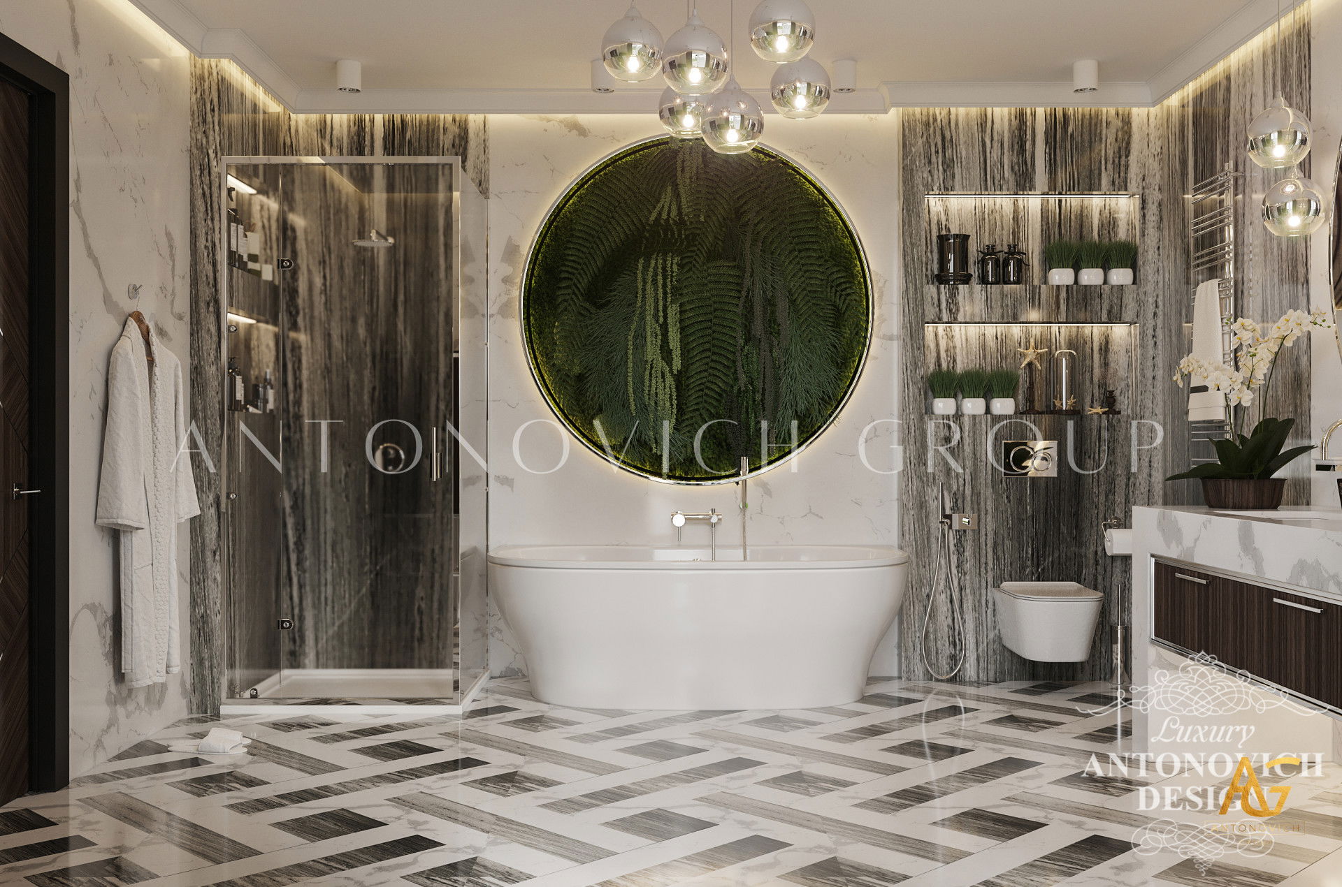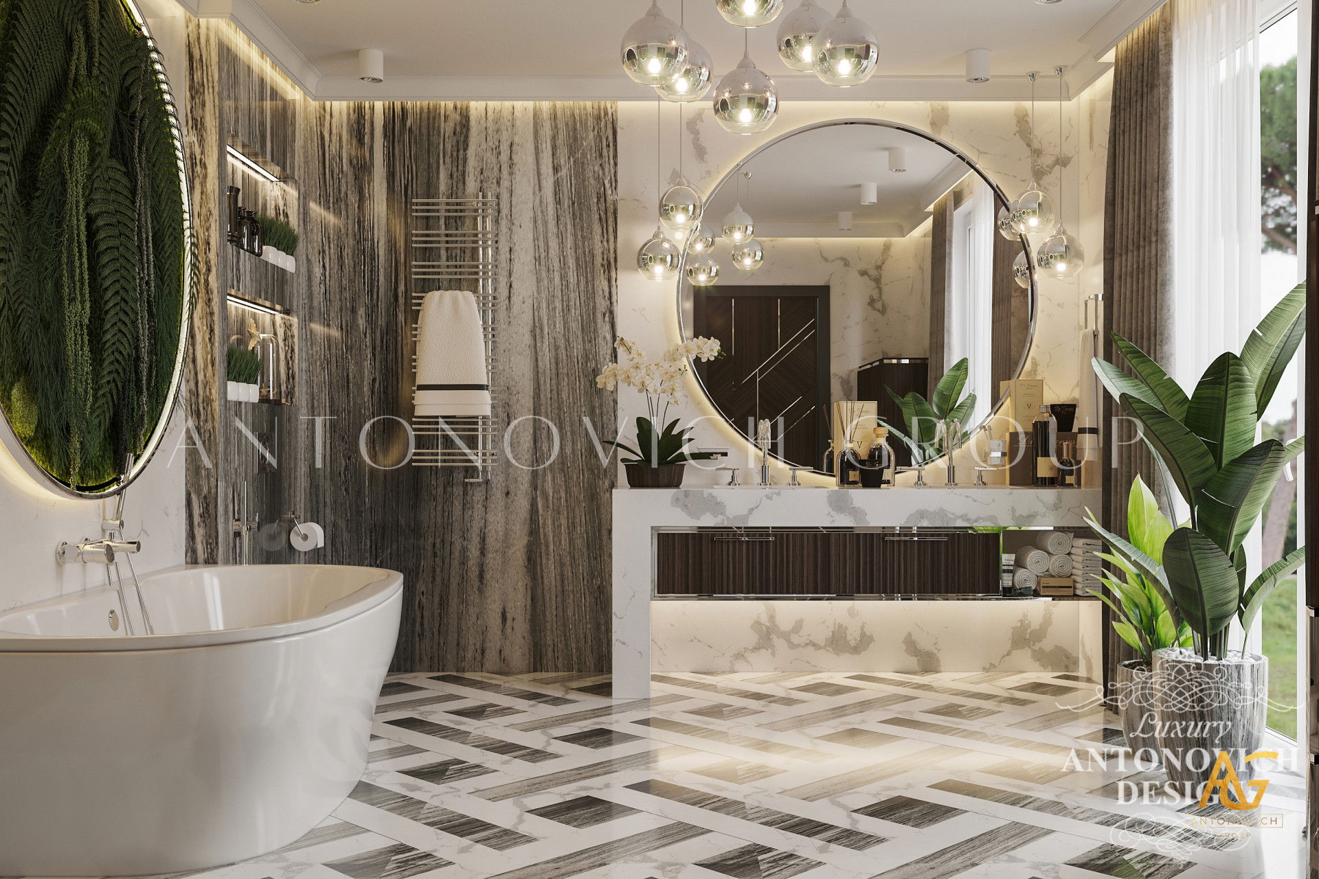 The room has a luxurious feel thanks to the lovely tropical motif and brown and green tones. You can see how a large bathroom was transformed into a spectacular interior design masterpiece in the photographs above. This luxury bathroom interior designs entire theme is an absolute masterpiece. Luxury Antonovich Design is without a doubt the top interior design company Dubai.