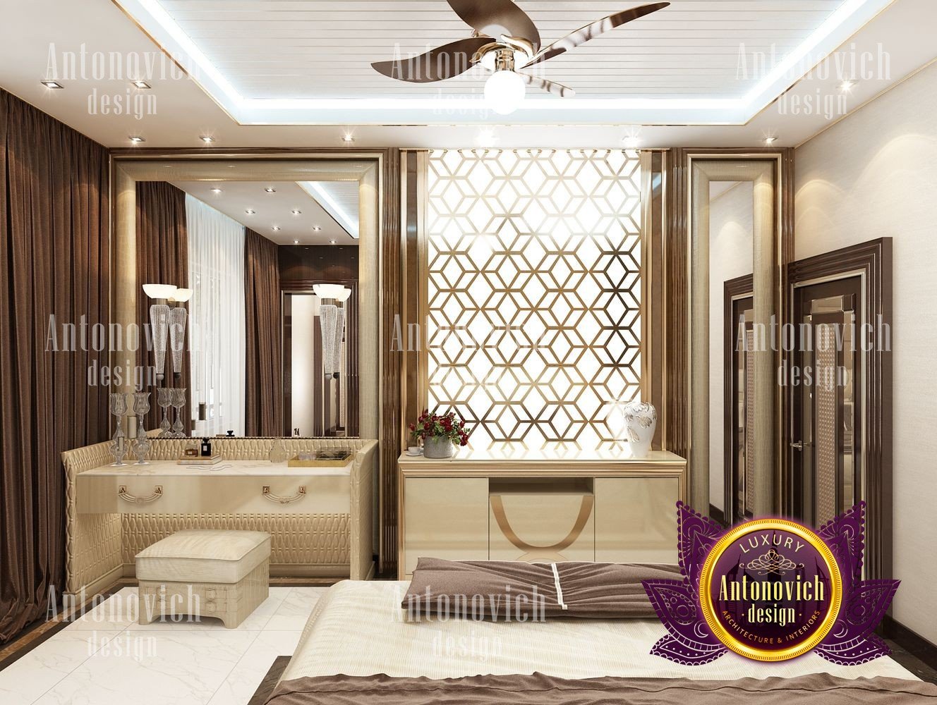 With this stunning luxury bedroom interior design, youll be transported to a world of luxury. Gold and brown are the main colors of this super luxurious bedroom made by Luxury Antonovich Design. The major aspect of this lovely bedroom is its furniture design. The bedrooms beautiful seats and tables are one-of-a-kinds. With its materials, it has a fantastic elegance and workmanship. With their wonderful details that create a contemporary aesthetic, the lovely bedroom is extremely well-designed. The shades of brown are very evident in the walls and in the decor. The beautiful designs add to the rooms opulence.