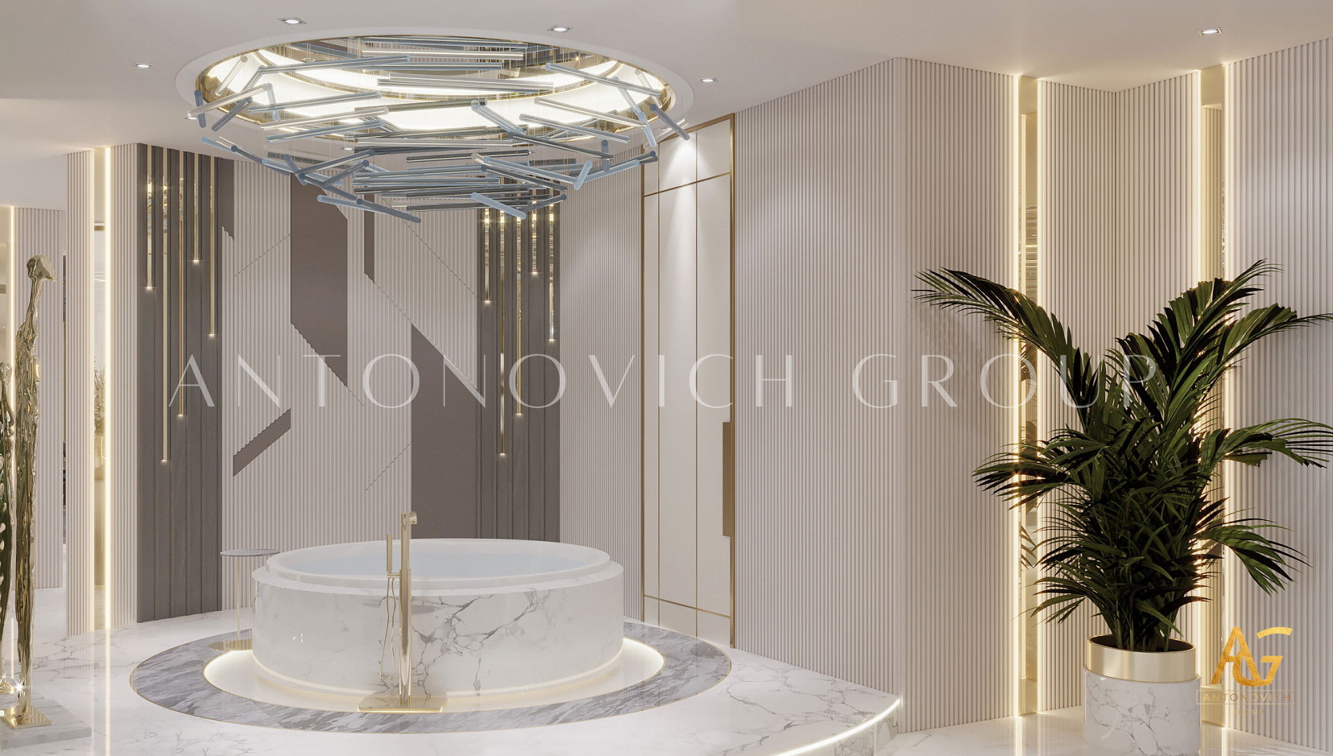 The luxury bathroom interior design also has good lighting. The wall lights are very unique as well as the chandelier which makes this luxury bathroom interior design a truly remarkable one when it comes to style, layout, and design. Overall, the luxury bathroom interior design is very beautiful with the addition of the plants that the company has added to the luxury bathroom interior design.