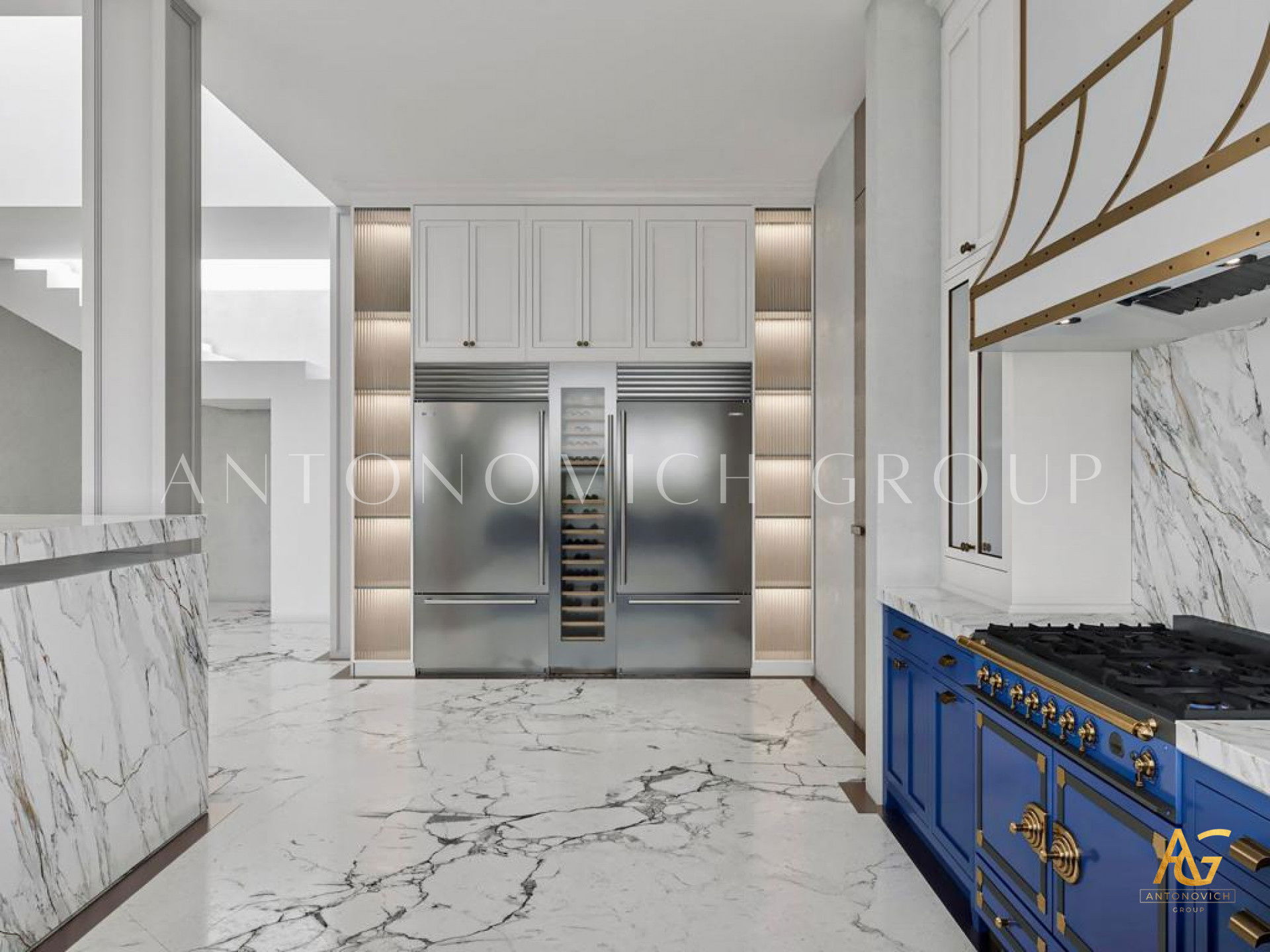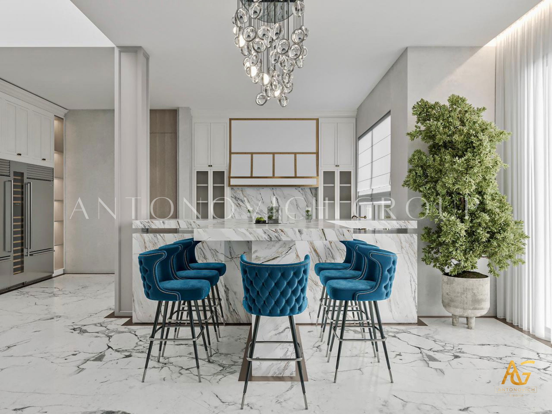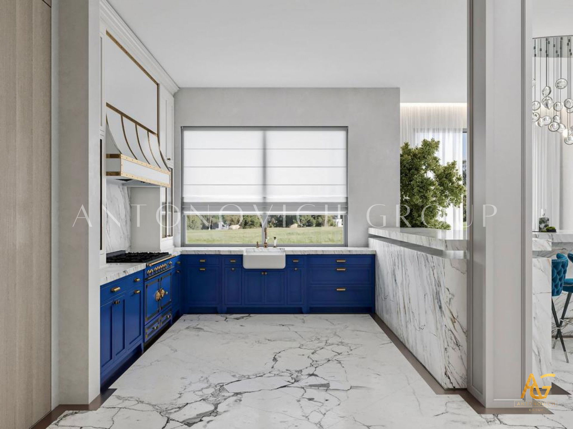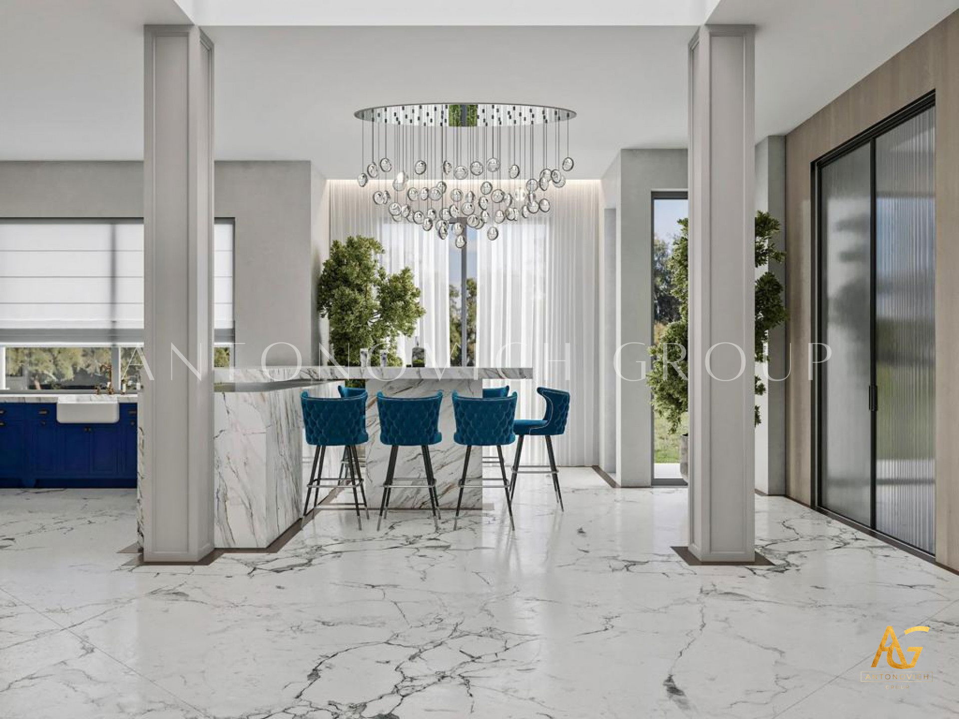 Antonovich Group is very well known as the best provider of luxury kitchen design. Having its in-house professional joiner team which is known as the makers of customized joinery works, Antonovich Group has been always the top choice for every client which is requiring the best kitchen interior design result with the most unique and stylish arrangement. The combination of white walls, marbles, and royal blue kitchen cabinets creates the most fantastic mood in the kitchen interior that makes it looks so unique and stylish.