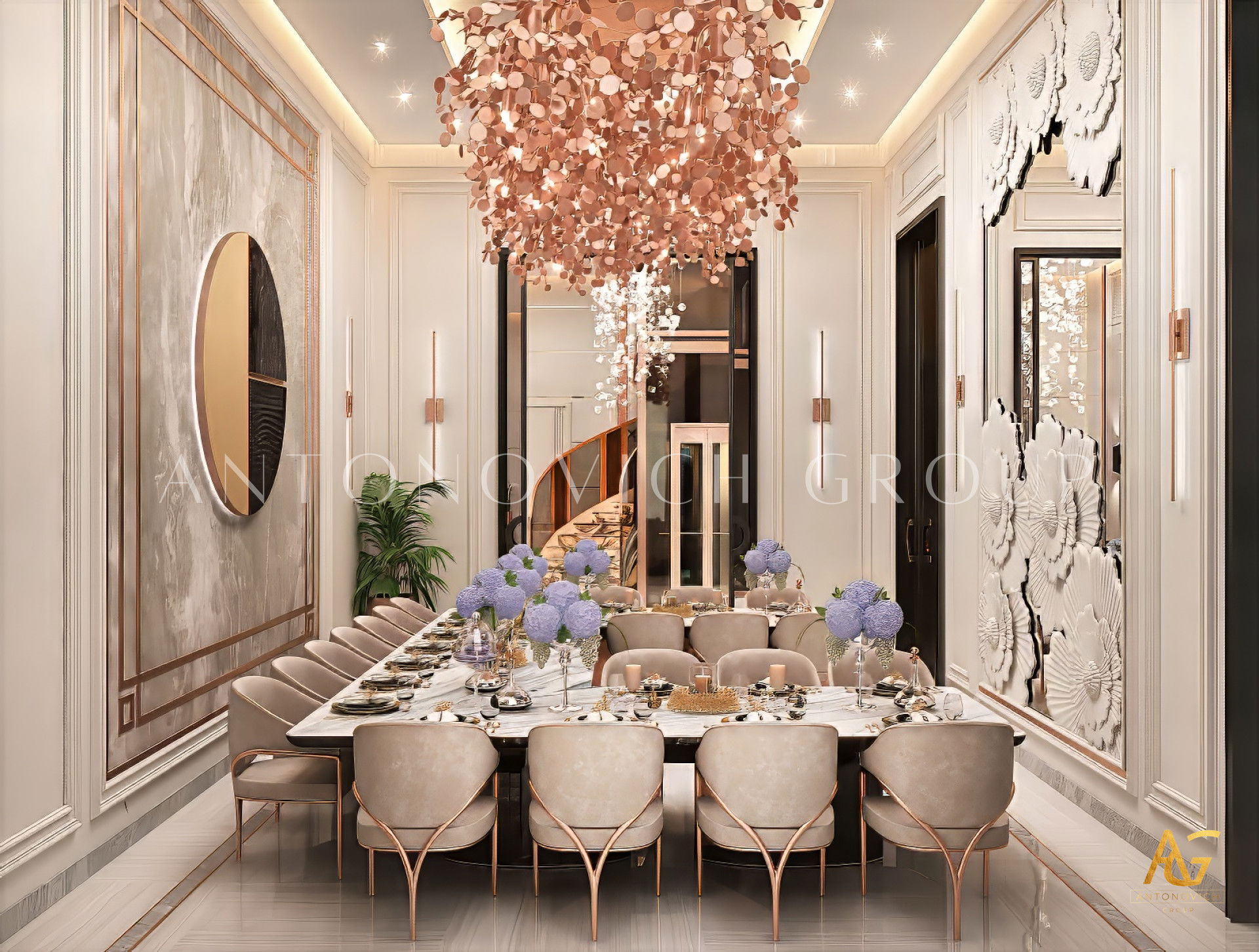 Lighting plays a central role in the dainty dining room concept, and Antonovich Group pays meticulous attention to it. Elegant pendant lights, crystal chandeliers, and recessed lighting are layered to create a soft, inviting ambiance.