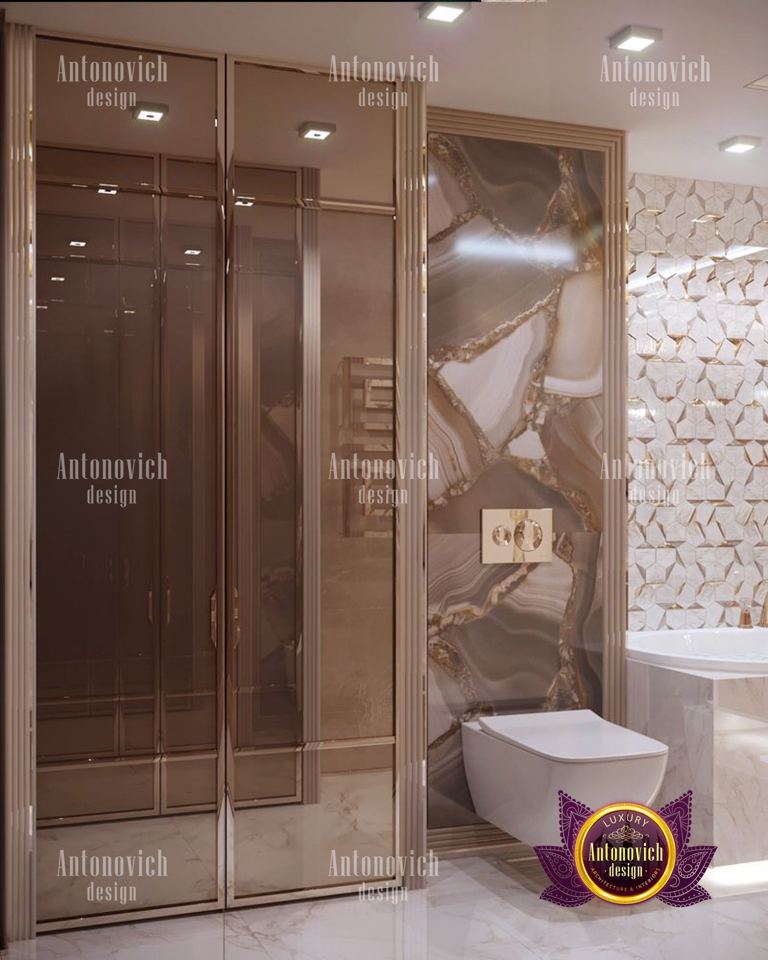The bathrooms feature a contrasting color scheme, represented by mosaics and graceful decor of the wall surface and sanitary equipment, as well as a rich and colorful floor surface, which is lined with chocolate-colored marble tiles with a glossy finish.