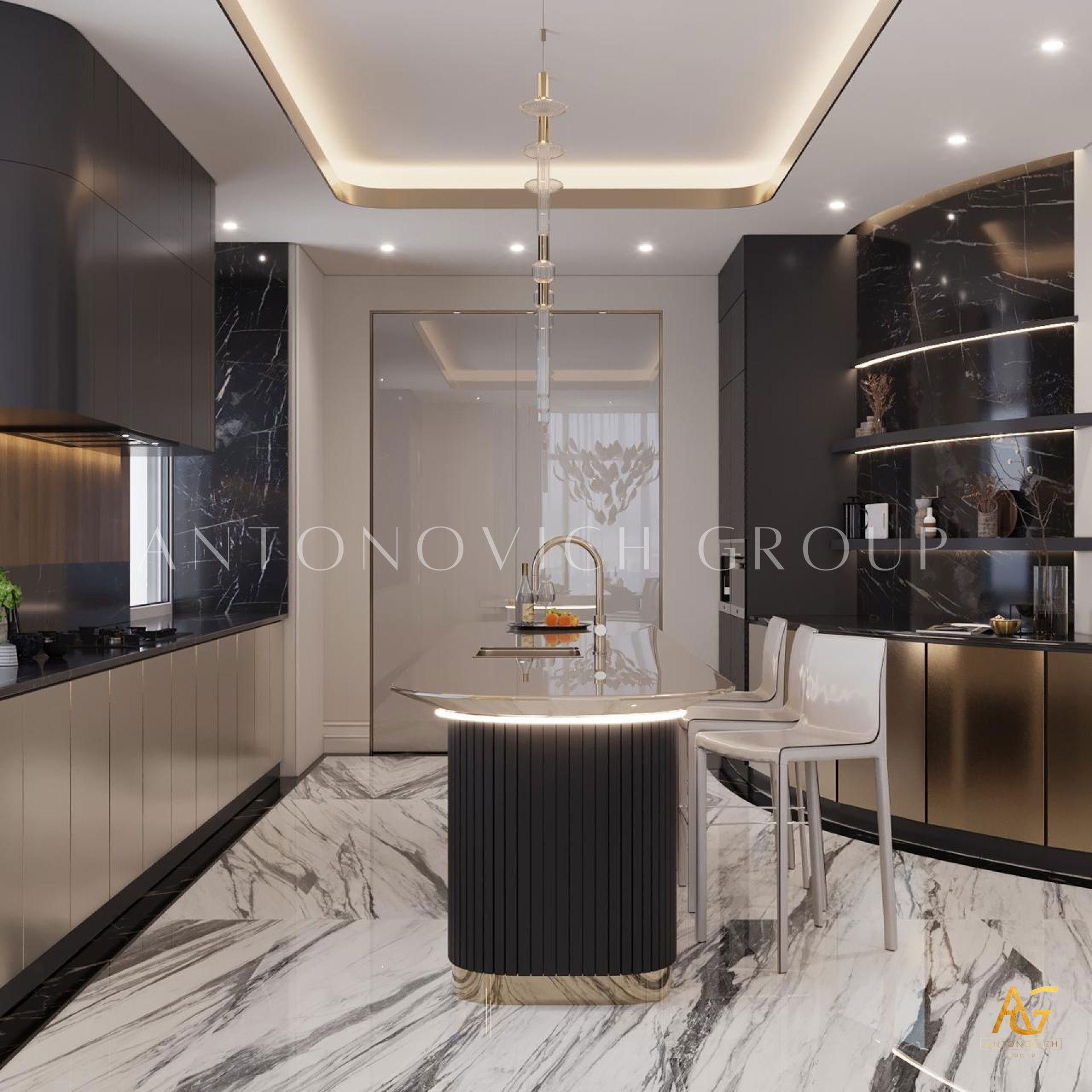 Beautiful design of the kitchen from the studio Luxury Antonovich Design is first of all aesthetically perfect and the most comfortable space.Modern style in this design project, it is a harmonious intertwining of minimalism and hi-tech. The interior looks very cozy and warm, thanks to the maximum use of wood in the decoration of the space.In a relatively small kitchen, the furniture items are perfectly arranged in order to stay in the kitchen is comfortable. The design of kitchen on pictures in modern realities practically does not differ from real photos of implemented interiors.A new kitchen design can be a completely new look at the design of such rooms.According to the architectural design of the villa, the kitchen is a separate room without windows that overlook the street.To make the interior of the kitchen cozier, one of the walls is decorated with two small windows overlooking the beautiful living room. The design project of the kitchen interior from Antonovich Design has turned out very elegant and exquisite.Kitchen facades made of natural wood contrast perfectly with light-colored work surfaces. To visually expand the space, the authors of the project actively use lighting. This is a large crystal chandelier, a line of backlighting throughout the perimeter of the ceiling, additional lamps and furniture backlighting.Light-colored marble on the floor and on the working surfaces is a wonderful moment of practicality in the interior of the kitchen. The best design of the kitchen always implies the correct calculation of the height of furniture, the distance between the cabinets.Every nuance is extremely important in order to that when you are in the kitchen you get only positive emotions.