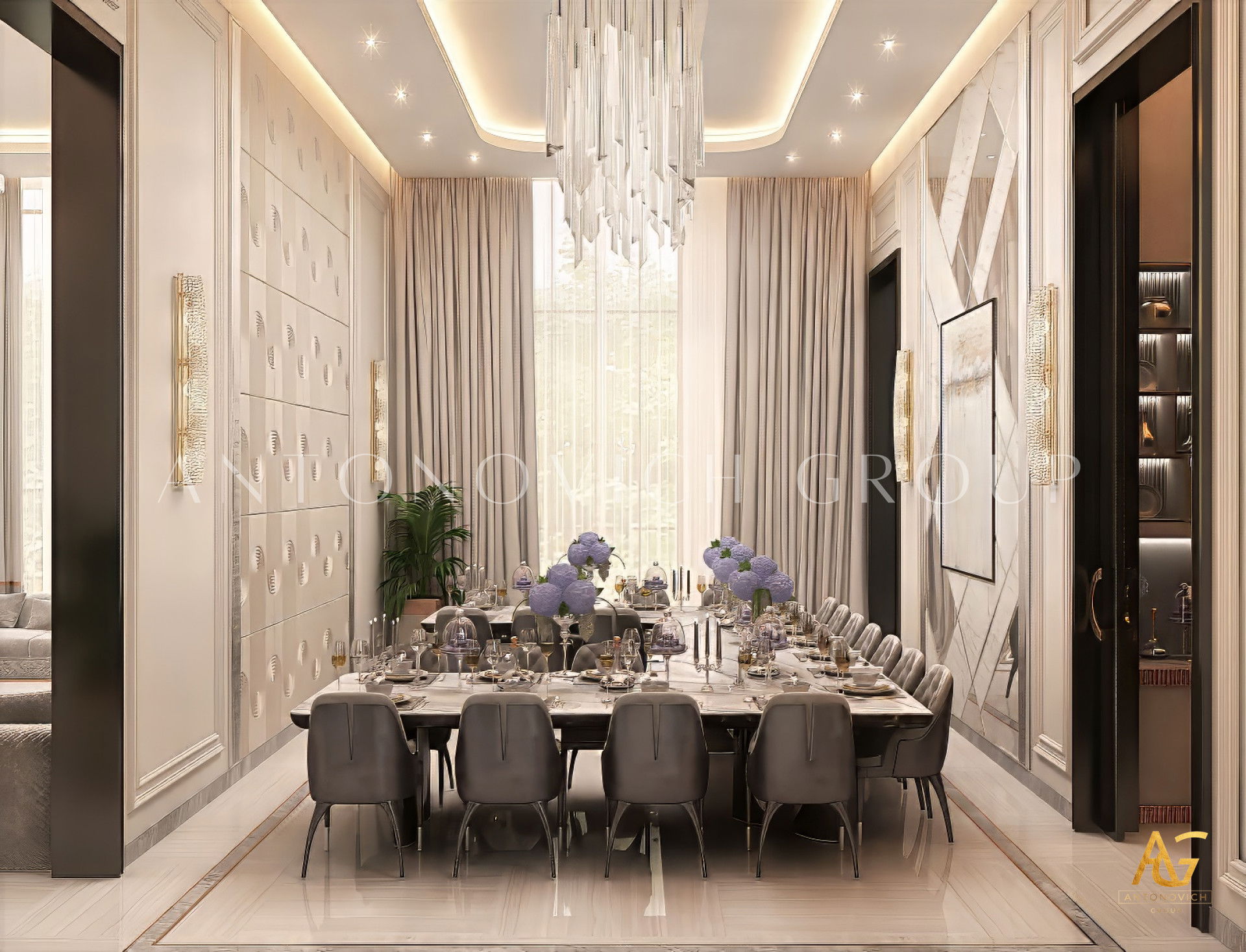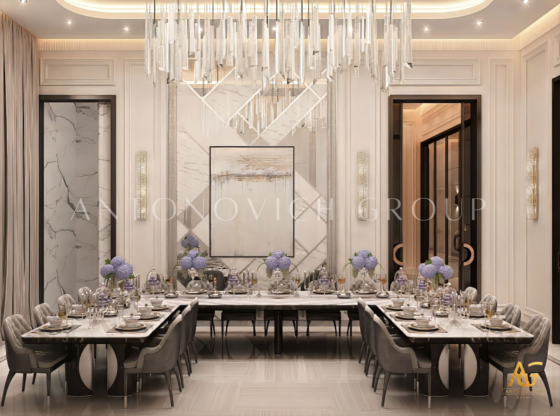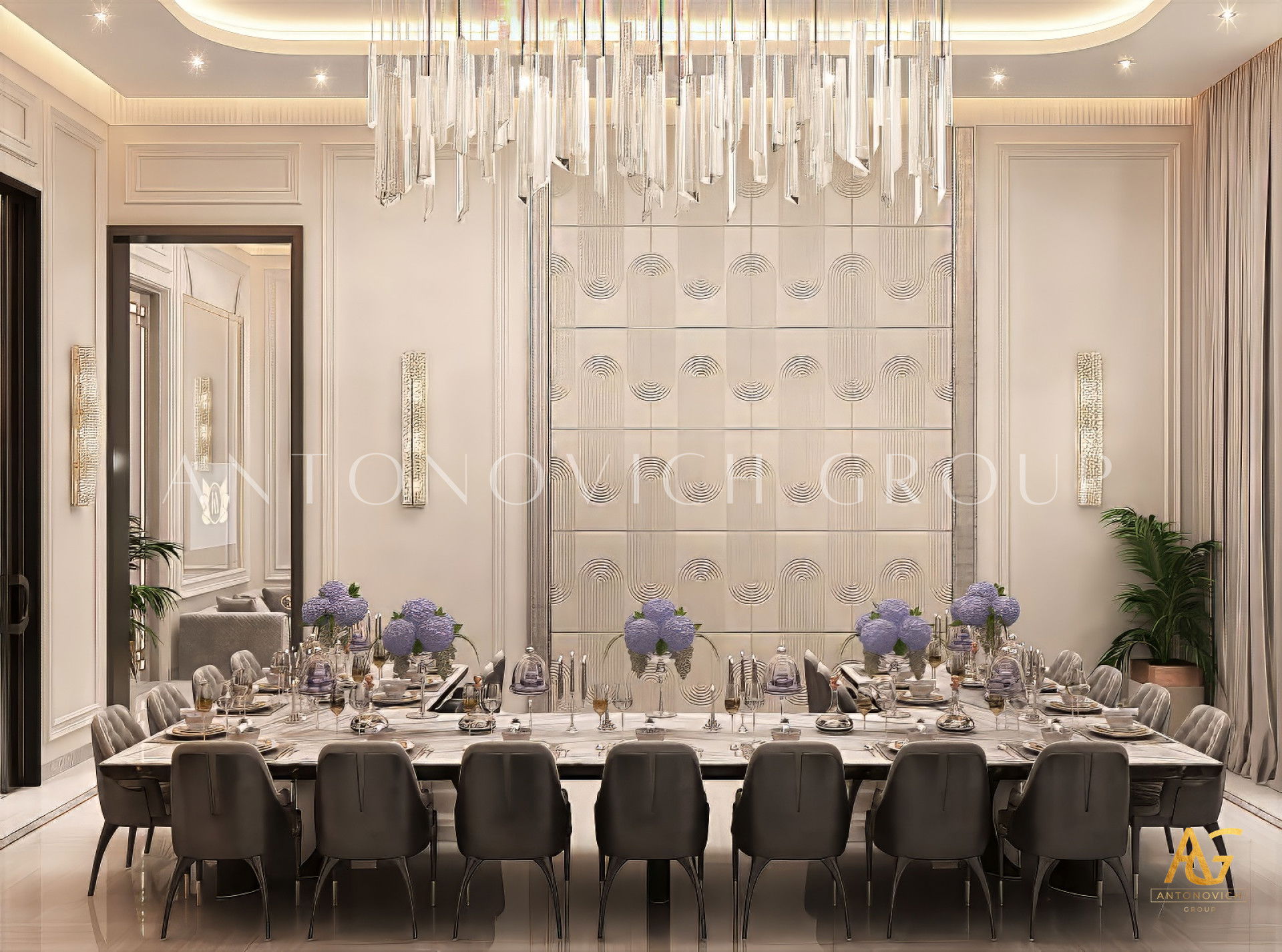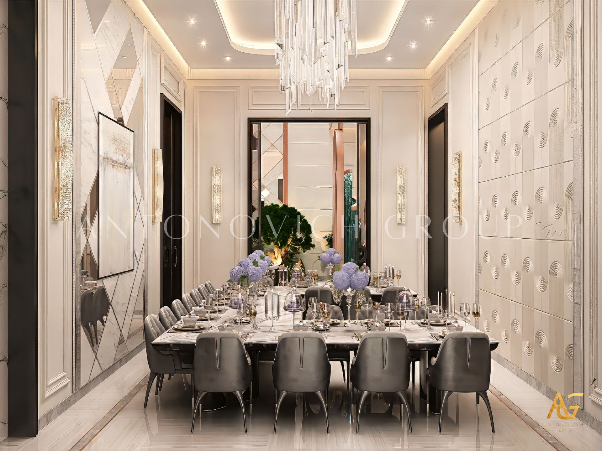 Its one of the most effective ways to make the most of your time. Give your dining room a luxurious twist with a dark color palette to add drama and elegance. Choose dining room design furniture that complements a lighter-colored rug. This provides contrast without making the interior design dining room appear claustrophobic. This works well if your luxury modern dining room design has lighter-colored flooring. Dark colors, on the other hand, distort the space and make it appear smaller than it is. In a room with a blue feature wall, the dark black dining table, suede seats, opaque color flatware, and black creative chandelier look fantastic. It comes as no surprise that this opulent dining room design will be popular.