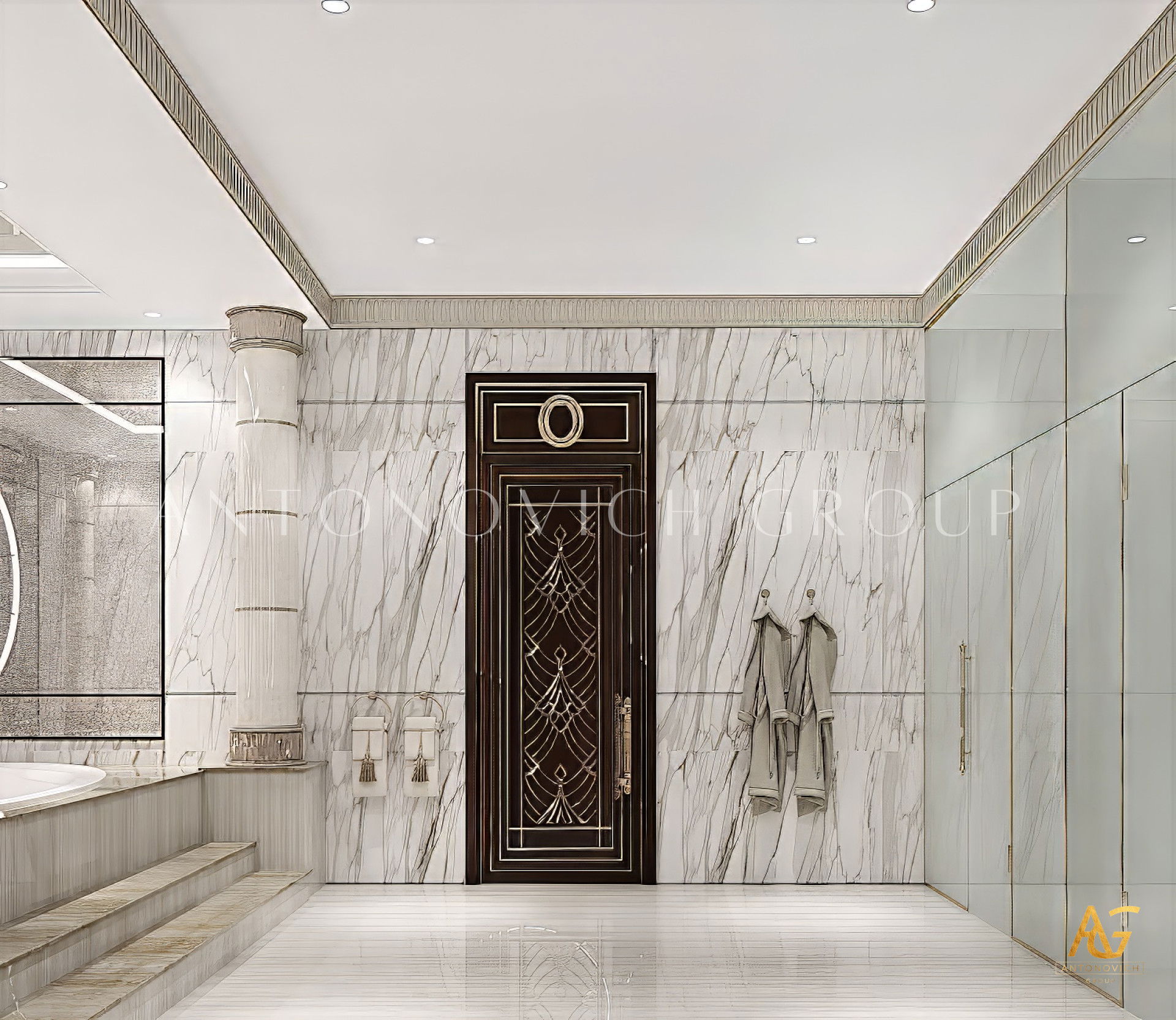 The selection of premium finishes is one of the hallmarks of Antonovich Group’s design work. Think silk draperies, plush rugs, rich wooden textures, and intricate wall paneling. These elements add depth and dimension, creating a harmonious balance between modern luxury and timeless classic style.