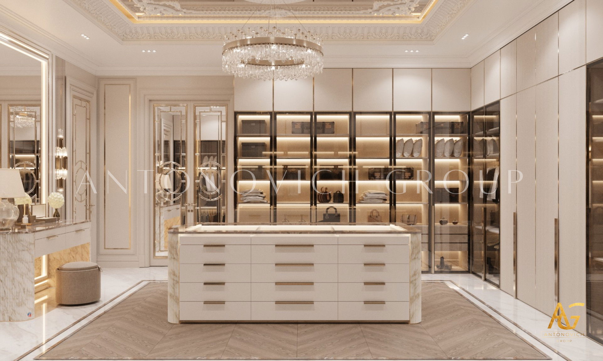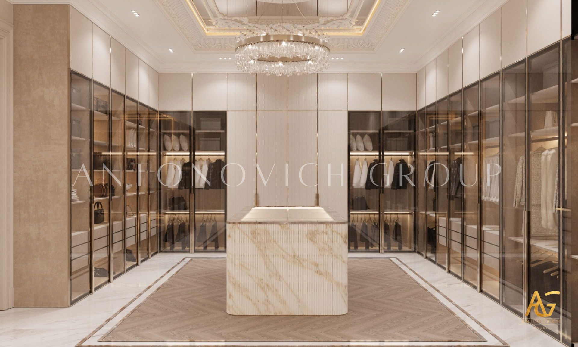Apartment design in the UAE from Luxury Antonovich Design Studio is filled with beautiful motifs of classic luxury. And in these luxurious accents, Dubai interior designers skillfully combined notes of modern trends. As a result, a relatively small dressing room has become an island of lush splendour for convenient clothes storage. The highlight of the interior design has become the ceiling. The ceiling is decorated with the image of a blue sky with light clouds. The full illusion of the heaven island is enhanced thanks to the line of LED backlighting, which outlines a niche in the ceiling. Luxuriously and solid in the interior look luxurious The wardrobe doors , which are skilfully encrusted with carved decoration and gold, look really luxurious. The curls of carved decoration are delicately repeated on the wide moldings, which are decorated with stucco.