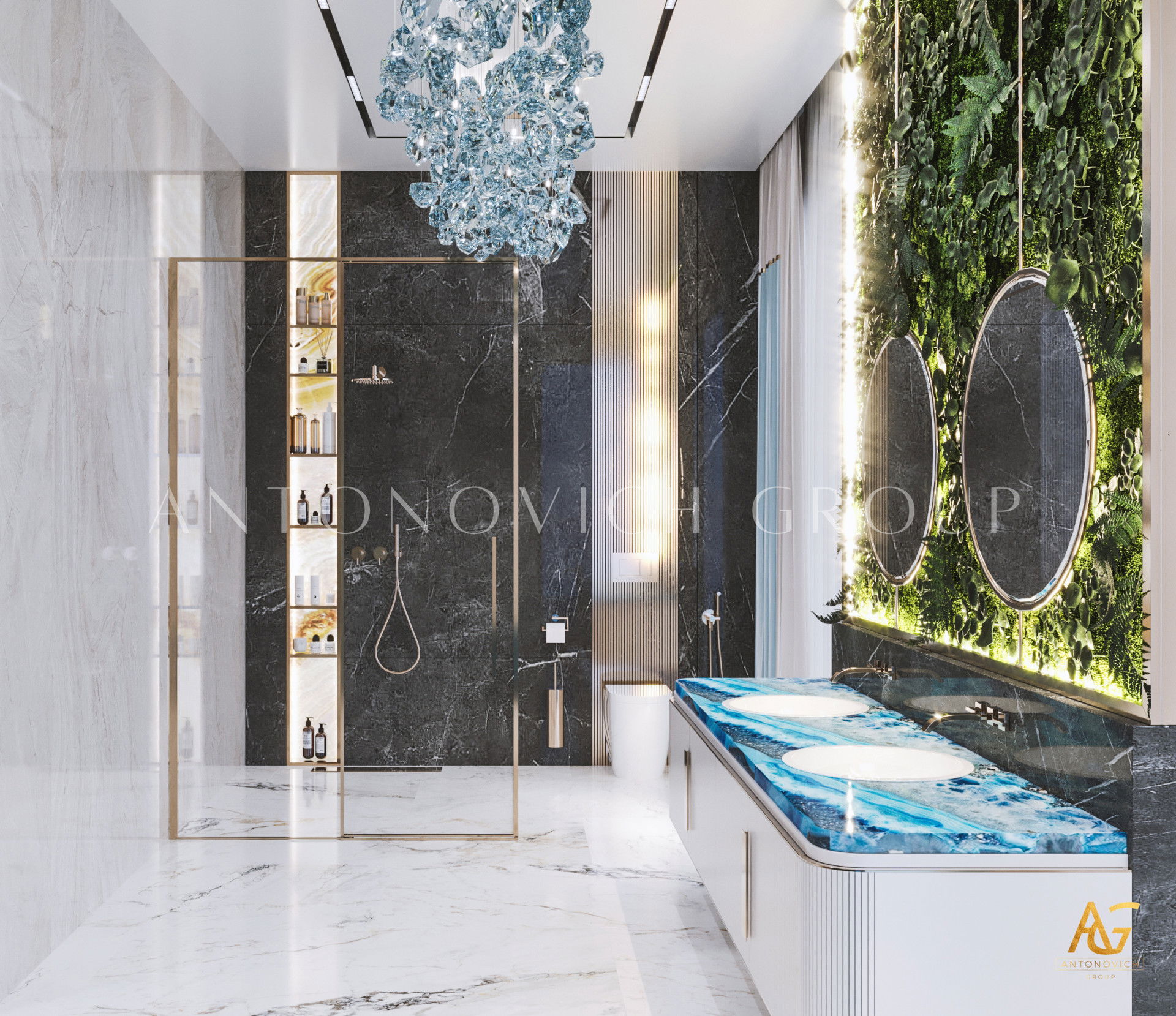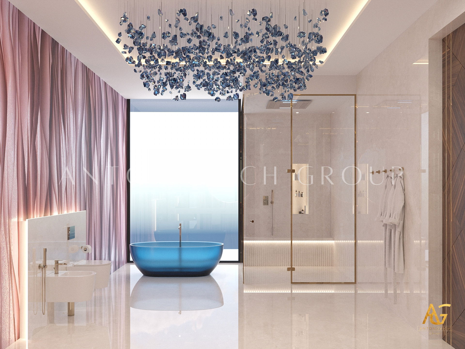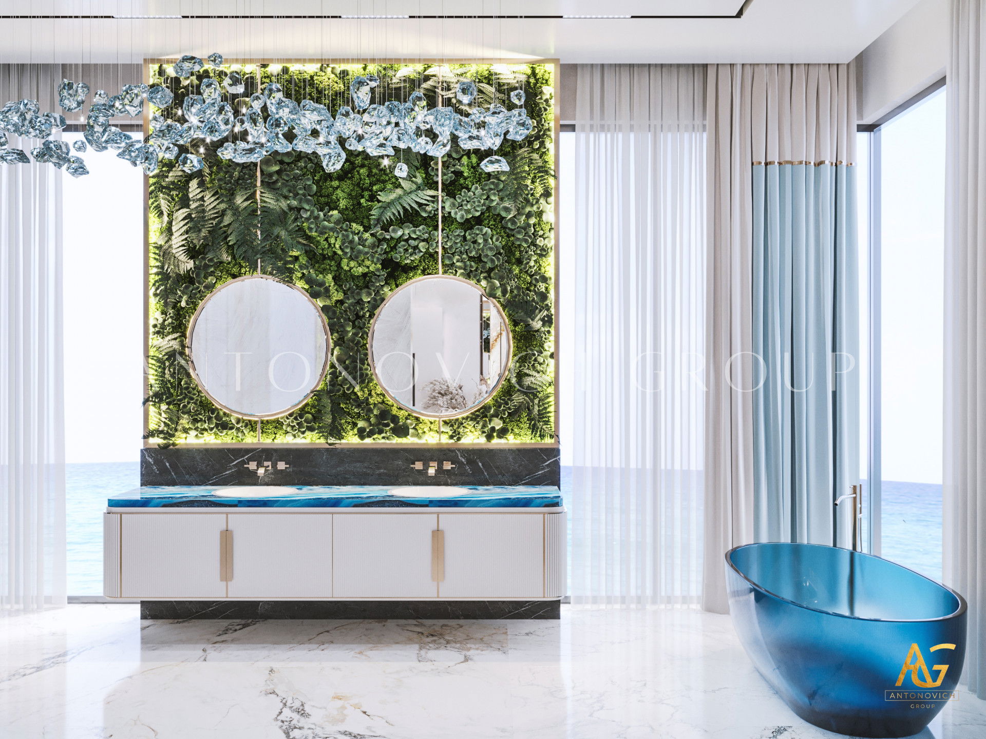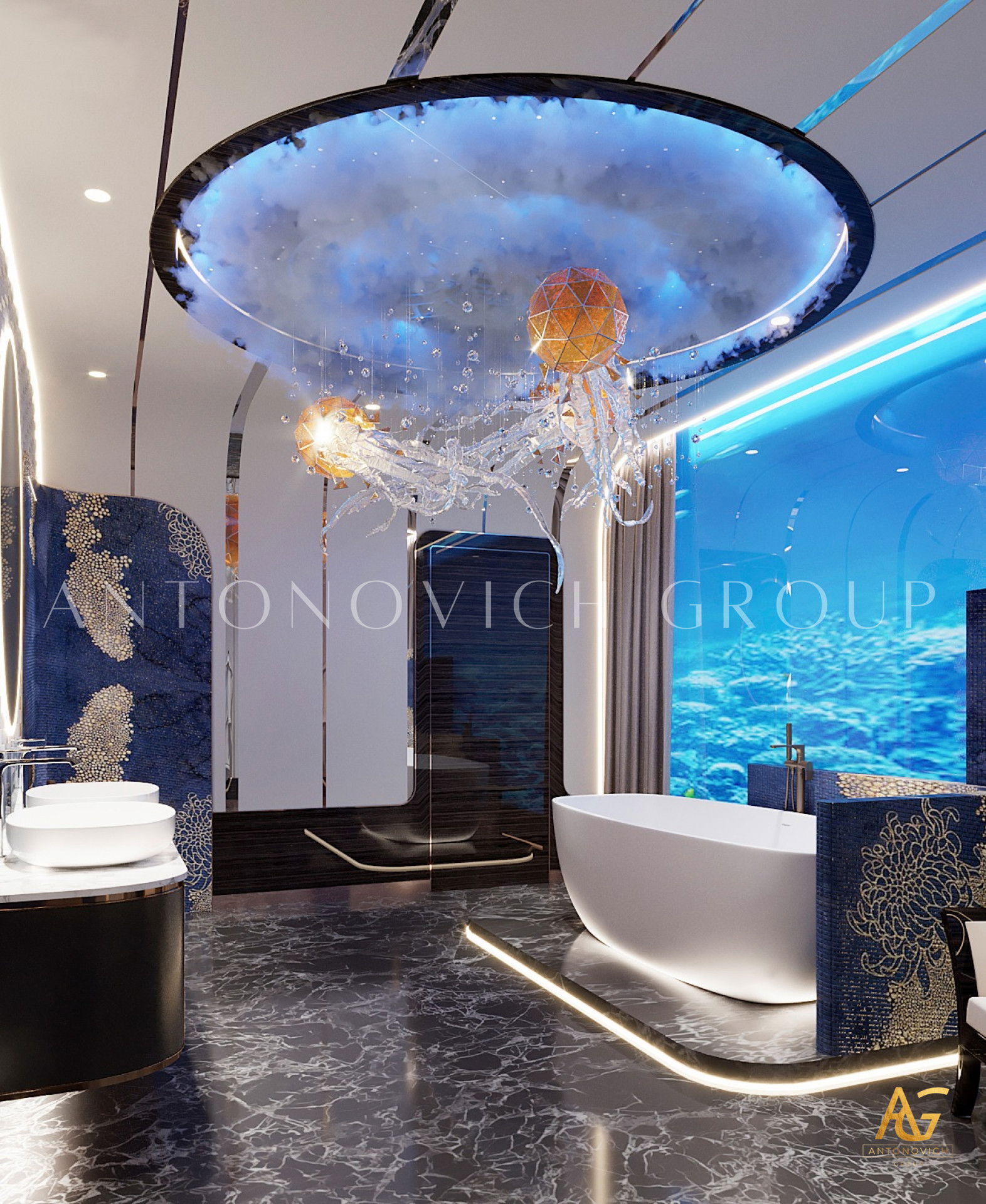 The underwater bathroom is a sanctuary of spa-like serenity. Antonovich Group's residential interior design Dubai includes features such as a glass-enclosed shower with a panoramic view, bringing the beauty of the ocean directly into the bathing experience.