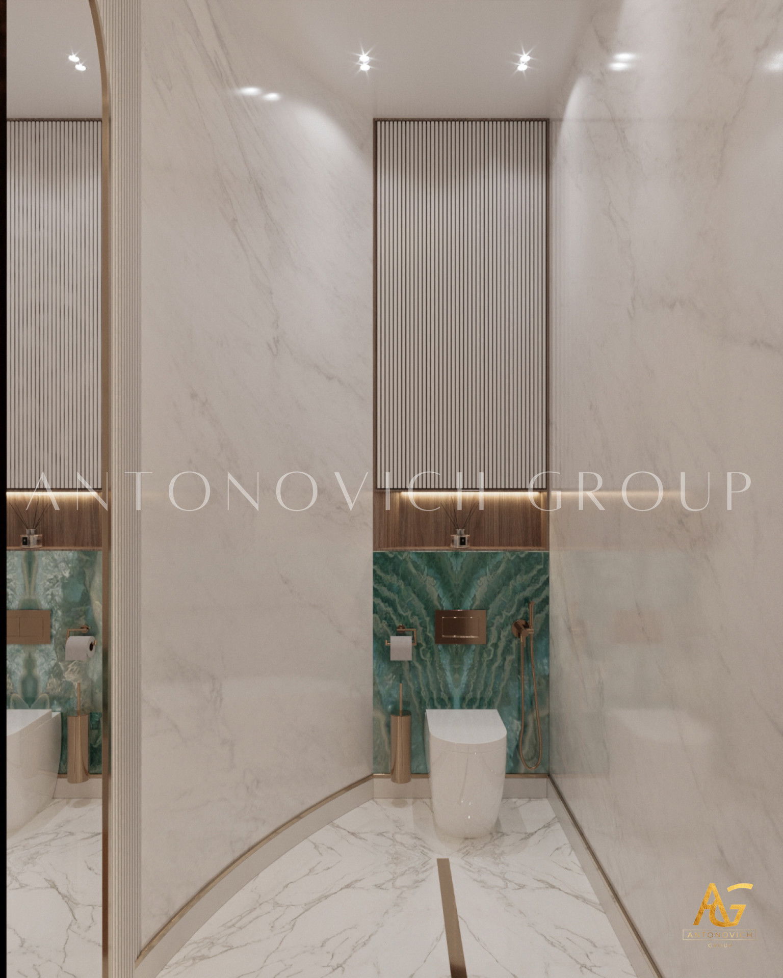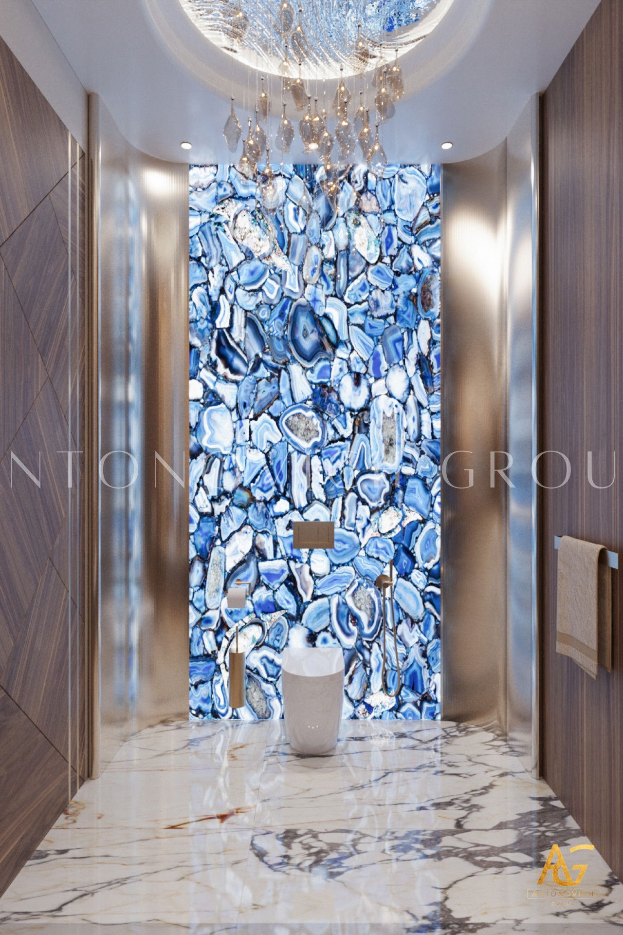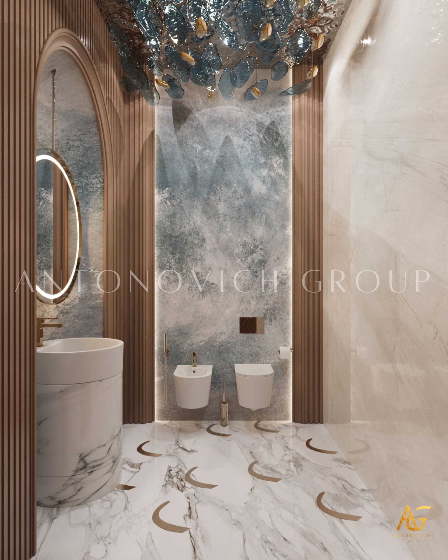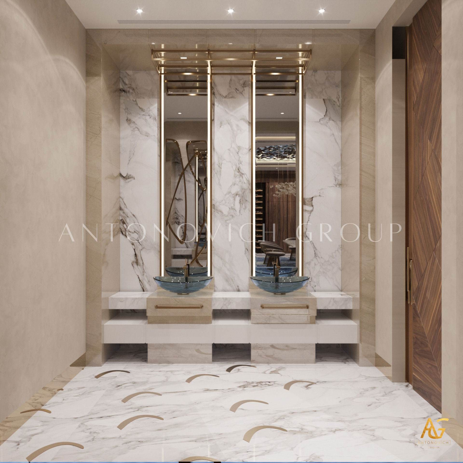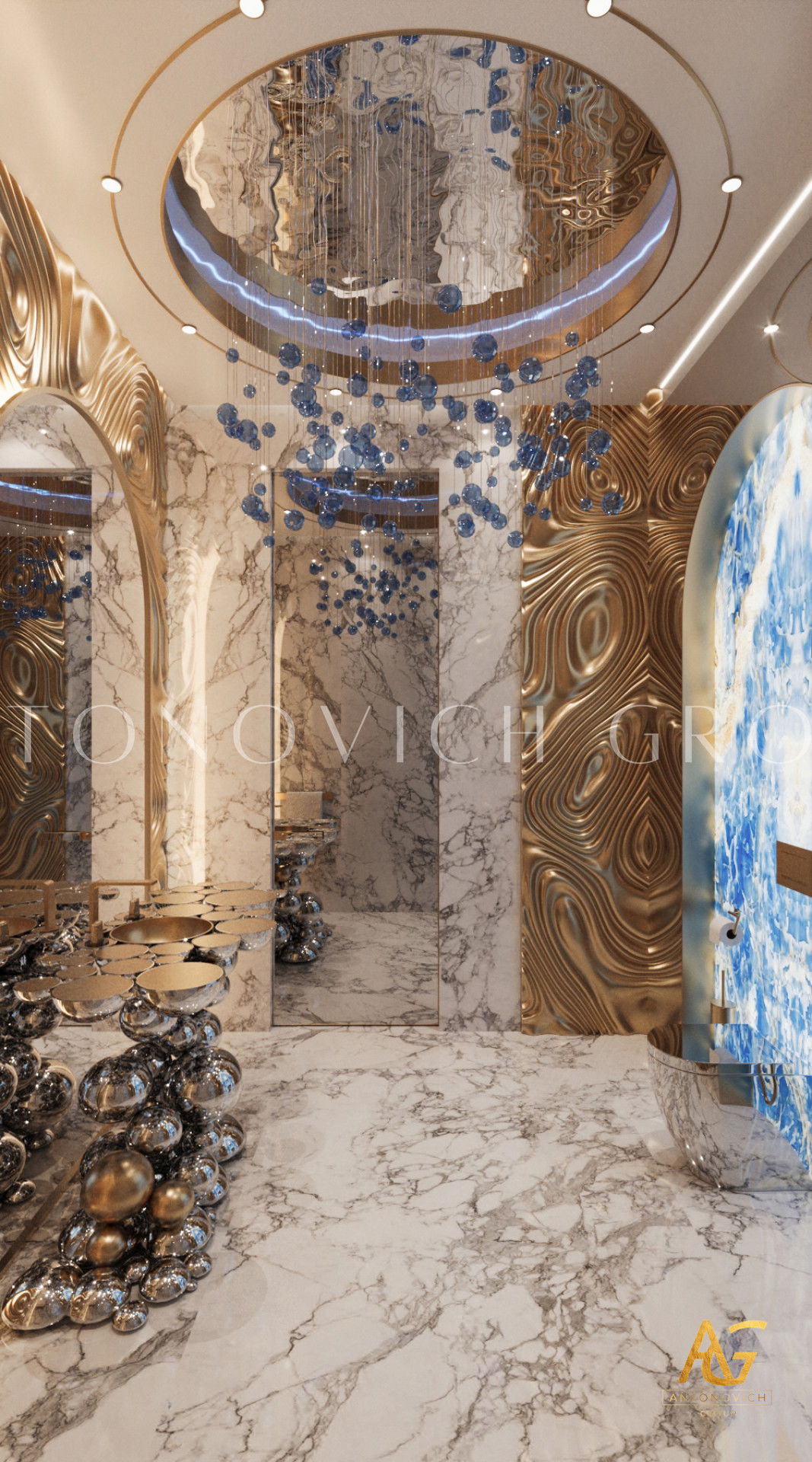 The underwater bathroom is a sanctuary of spa-like serenity. Antonovich Group's residential interior design Dubai includes features such as a glass-enclosed shower with a panoramic view, bringing the beauty of the ocean directly into the bathing experience.