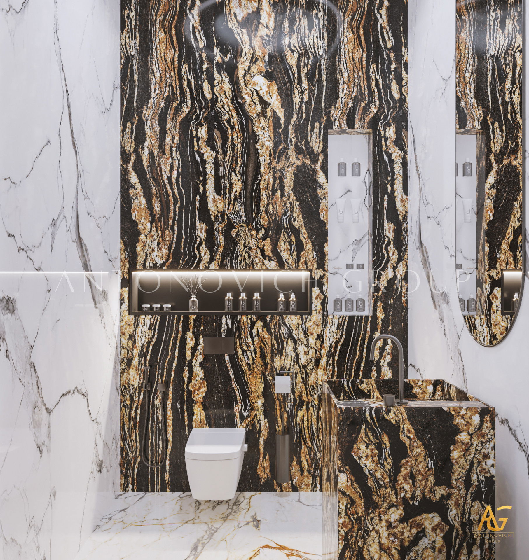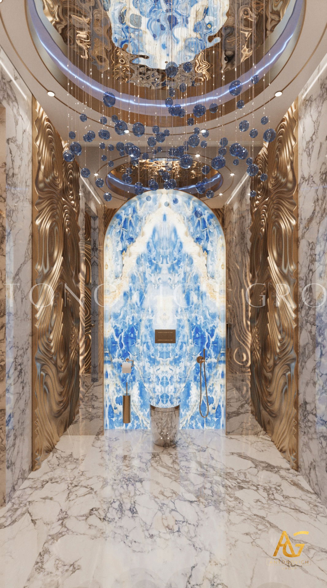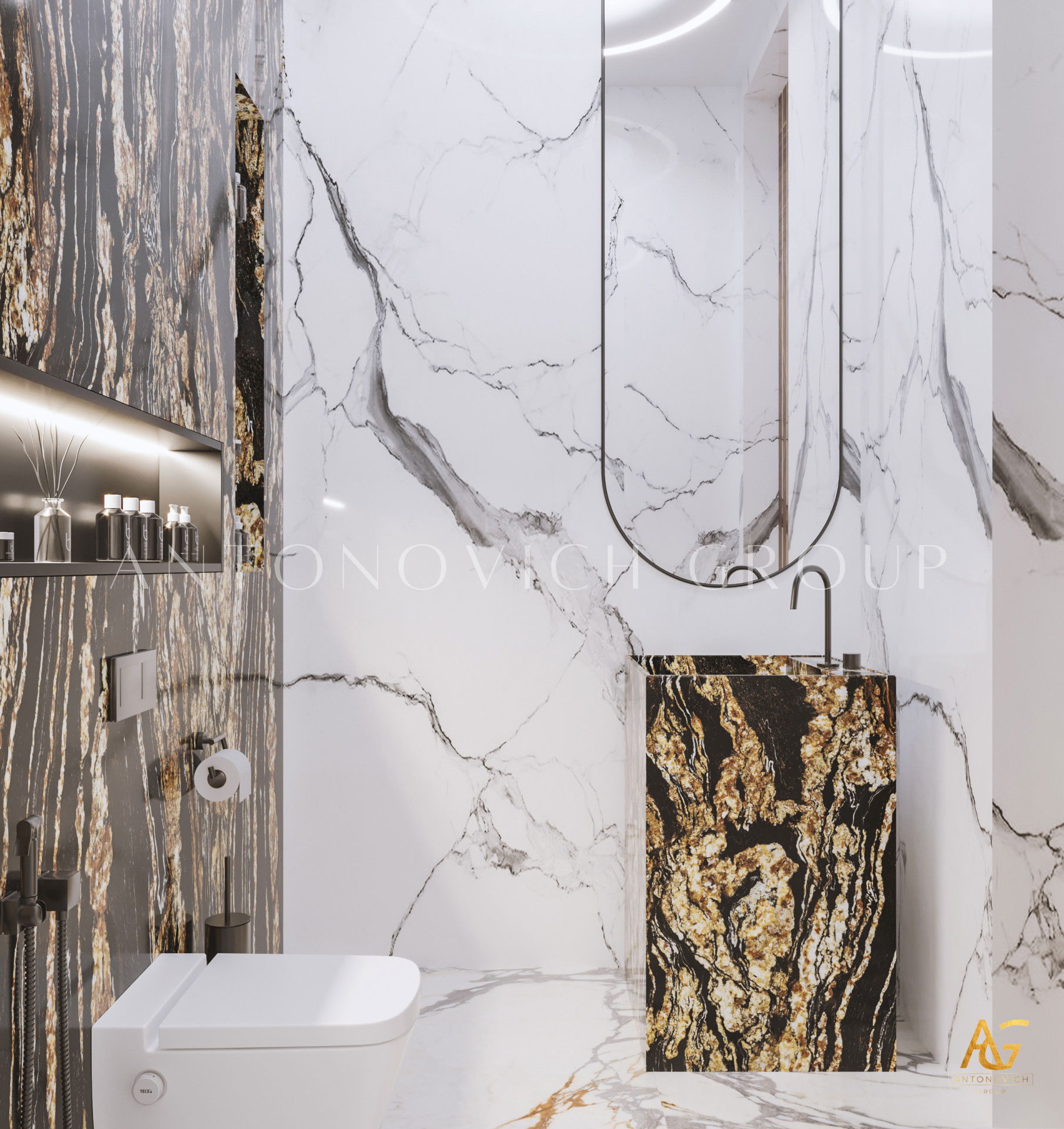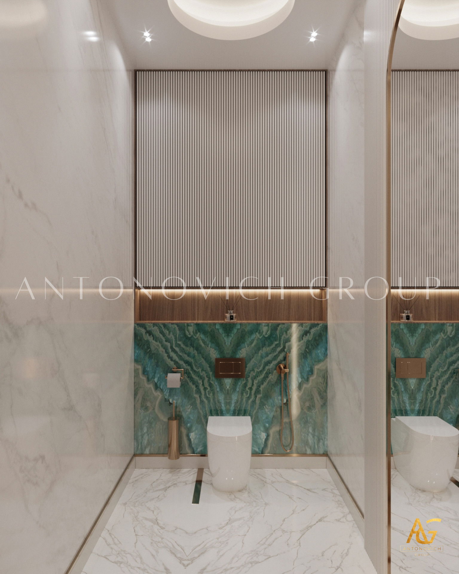 The underwater bathroom is a sanctuary of spa-like serenity. Antonovich Group's residential interior design Dubai includes features such as a glass-enclosed shower with a panoramic view, bringing the beauty of the ocean directly into the bathing experience.