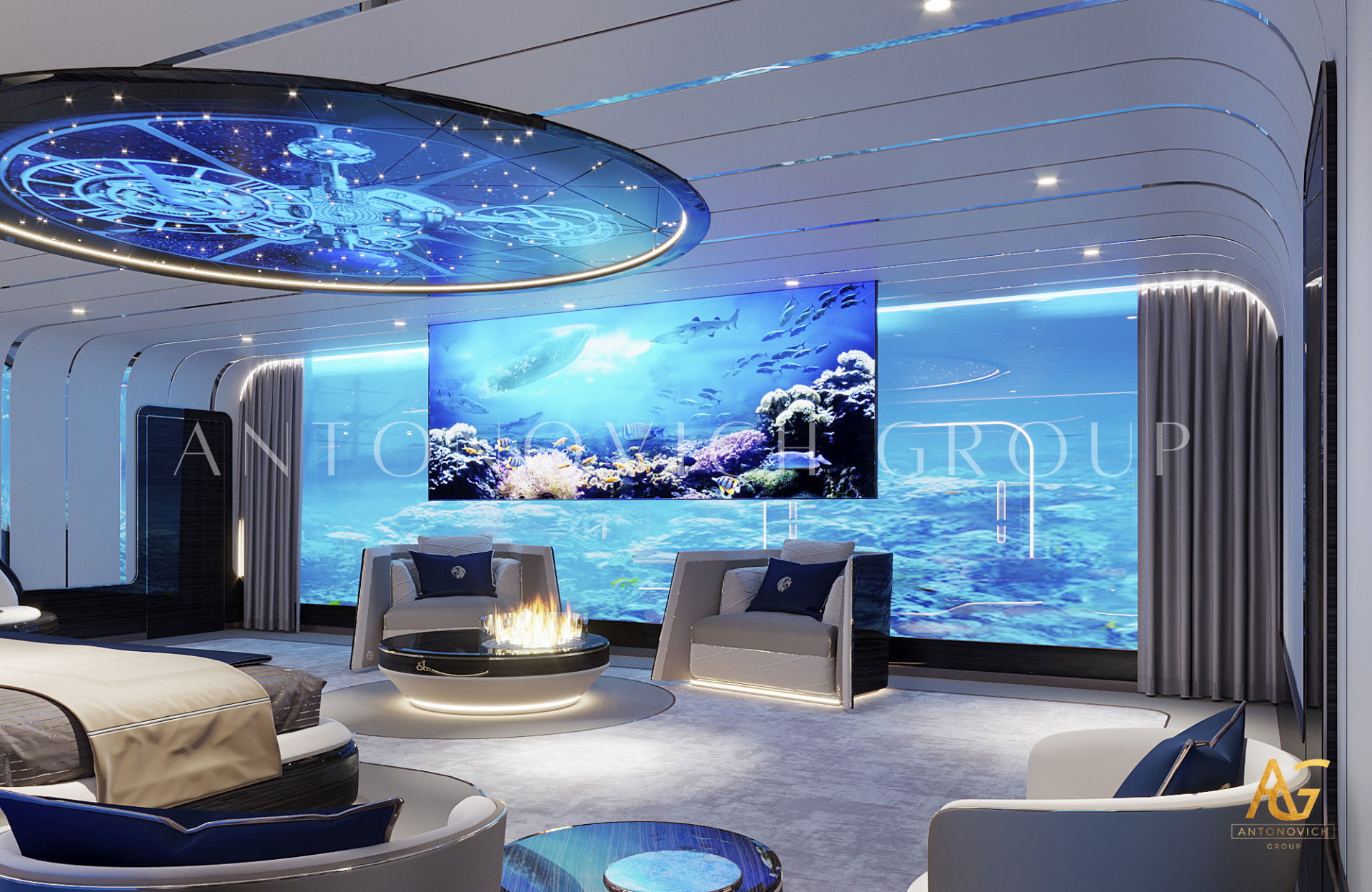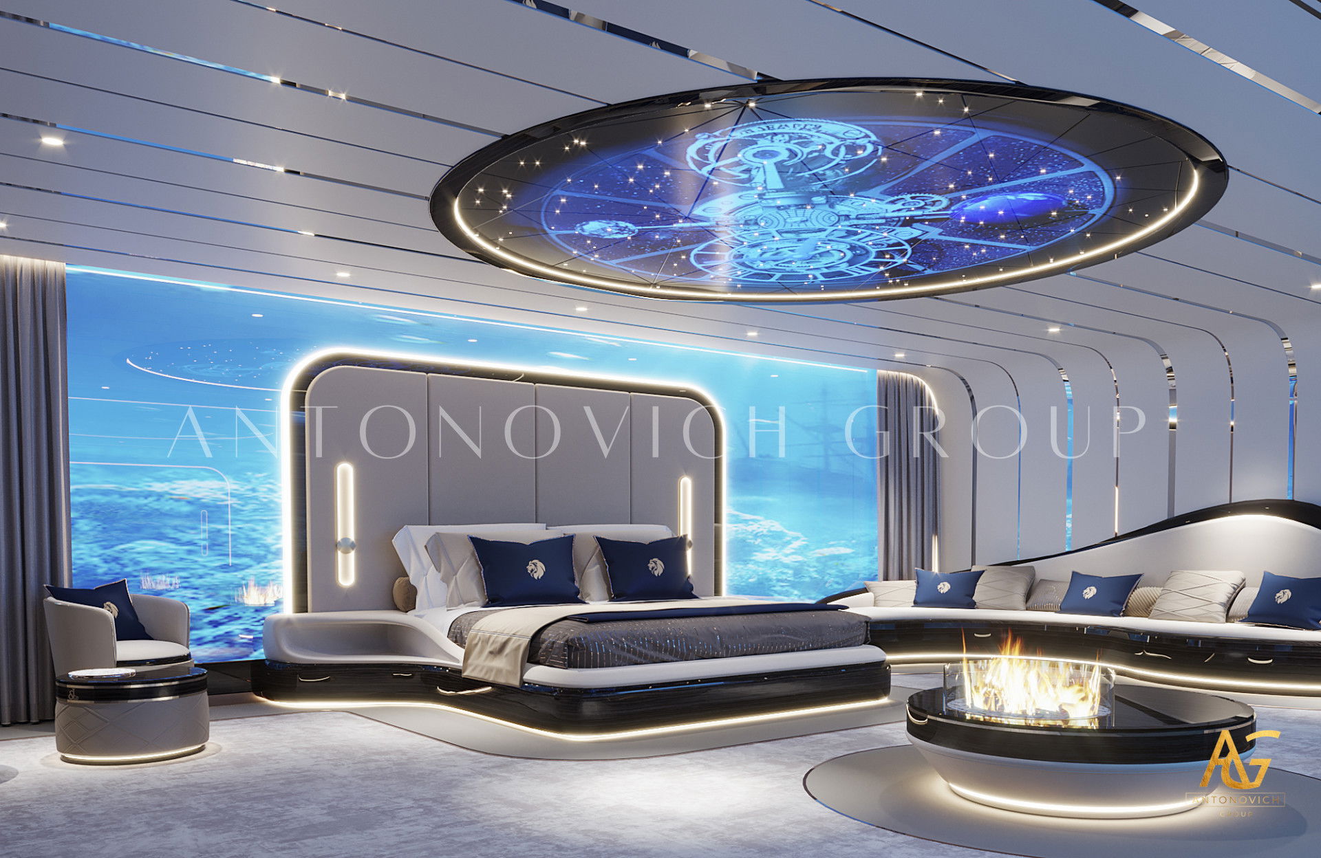 Antonovich Group's interior design services in Dubai take center stage as the underwater master bedroom unfolds. Floor-to-ceiling windows showcase the mesmerizing aquatic world, seamlessly integrating nature into the living space for unparalleled tranquility.