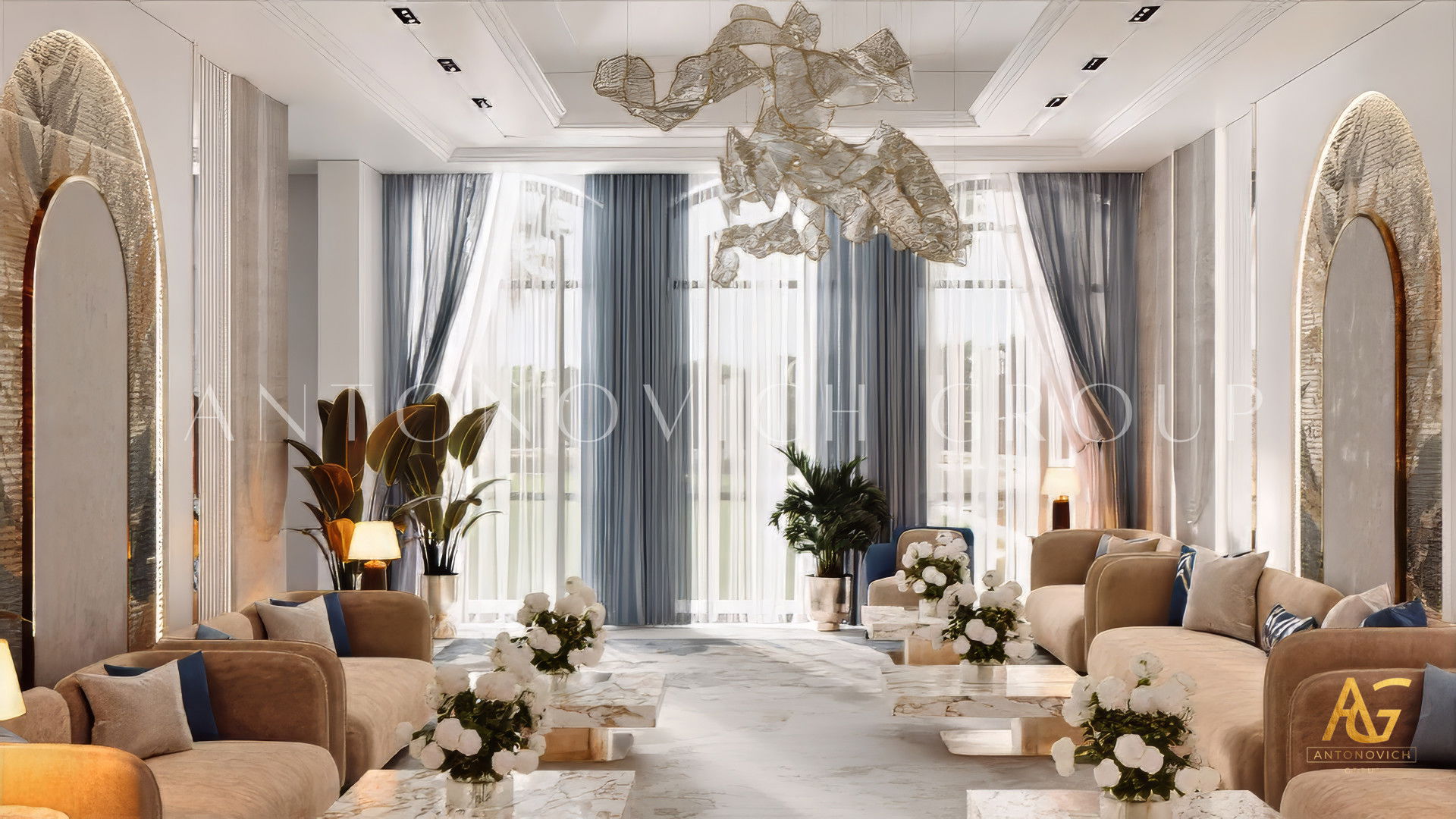 Antonovich Group is celebrated for its attention to fine detail, a hallmark visible in each Majlis interior it delivers. The design concept often features soaring ceilings, grand chandeliers, elegant cornices, and ornamental wall treatments — creating a sense of royal ambiance.