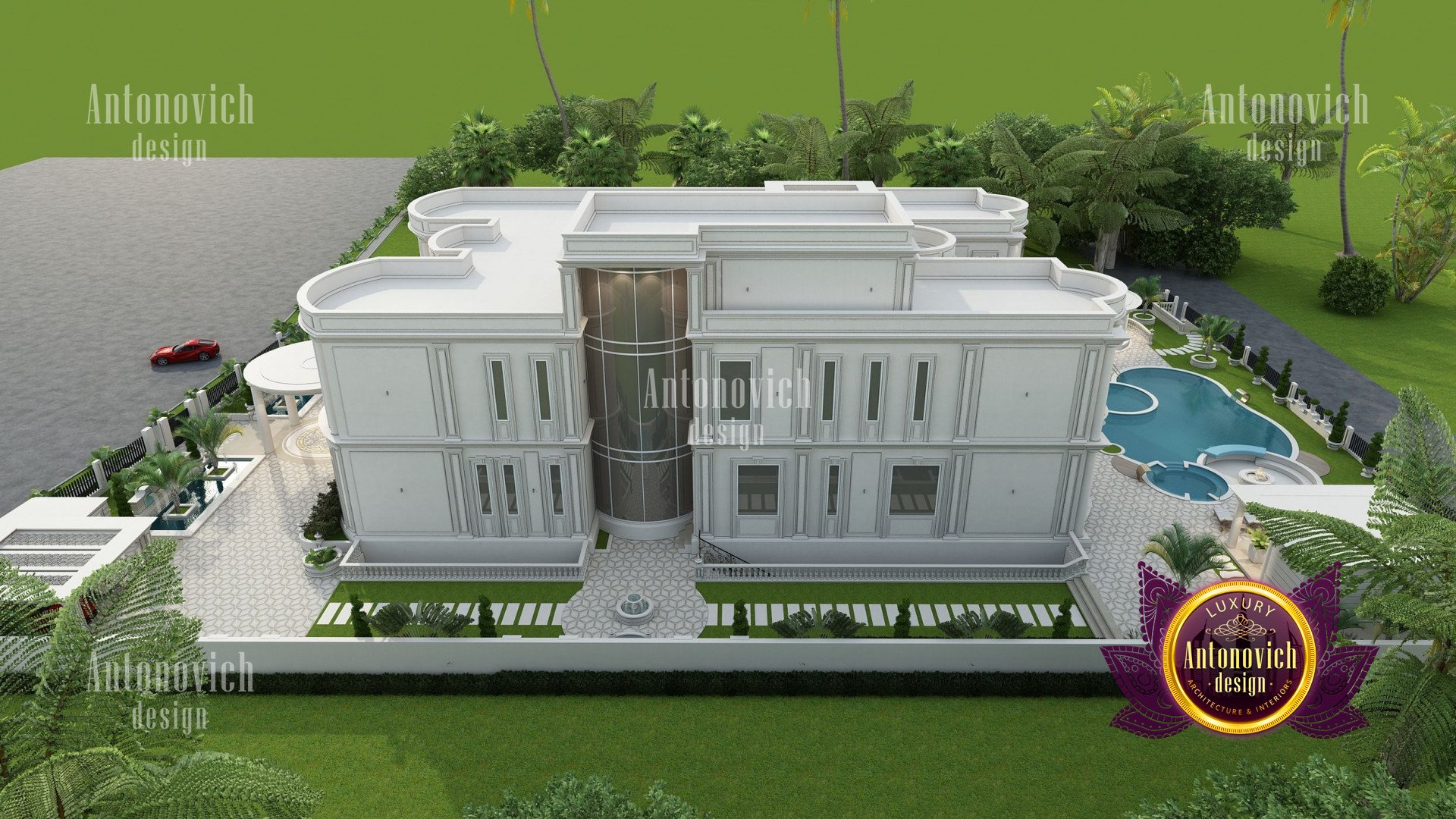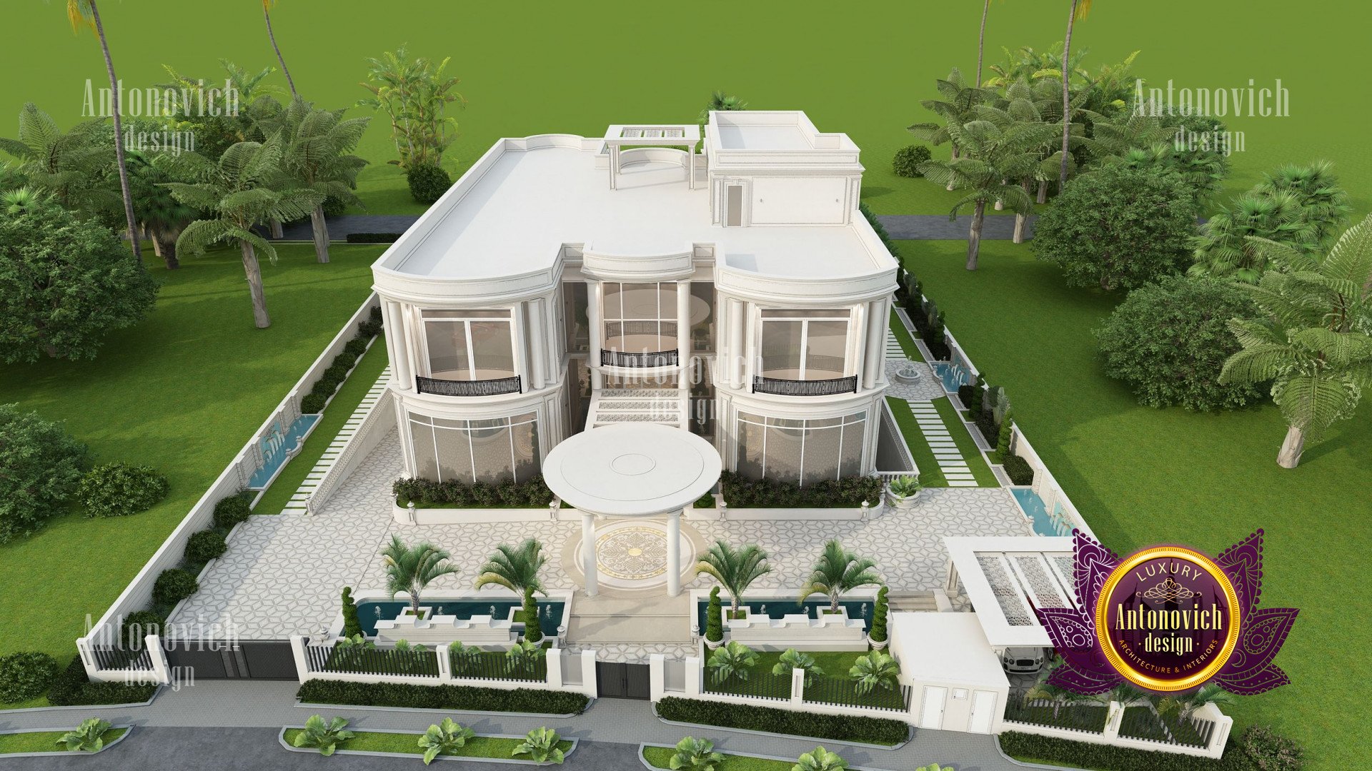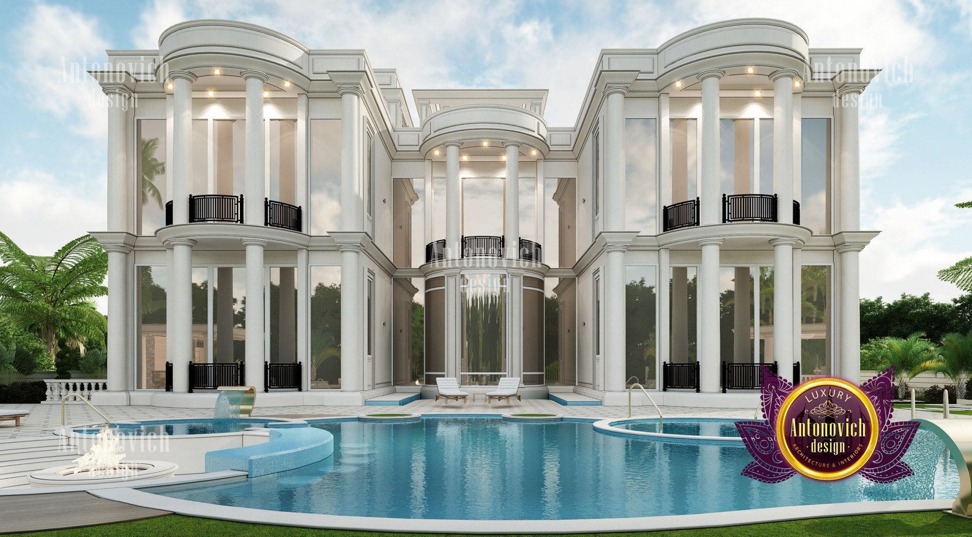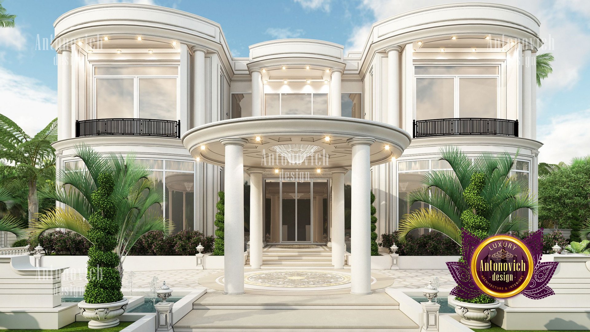 Refinement makes it possible to integrate the architectural design of the building in any landscape or building of any kind. The original Luxury Antonovich Design country house was modeled on eclectic style country villas. Important features of the house and surrounding design are borrowed from the concept of classics. In addition, individual touches of the house are the expression of the aesthetics and values of ancient eras. All this interweaving of styles allowed to achieve a very interesting result.