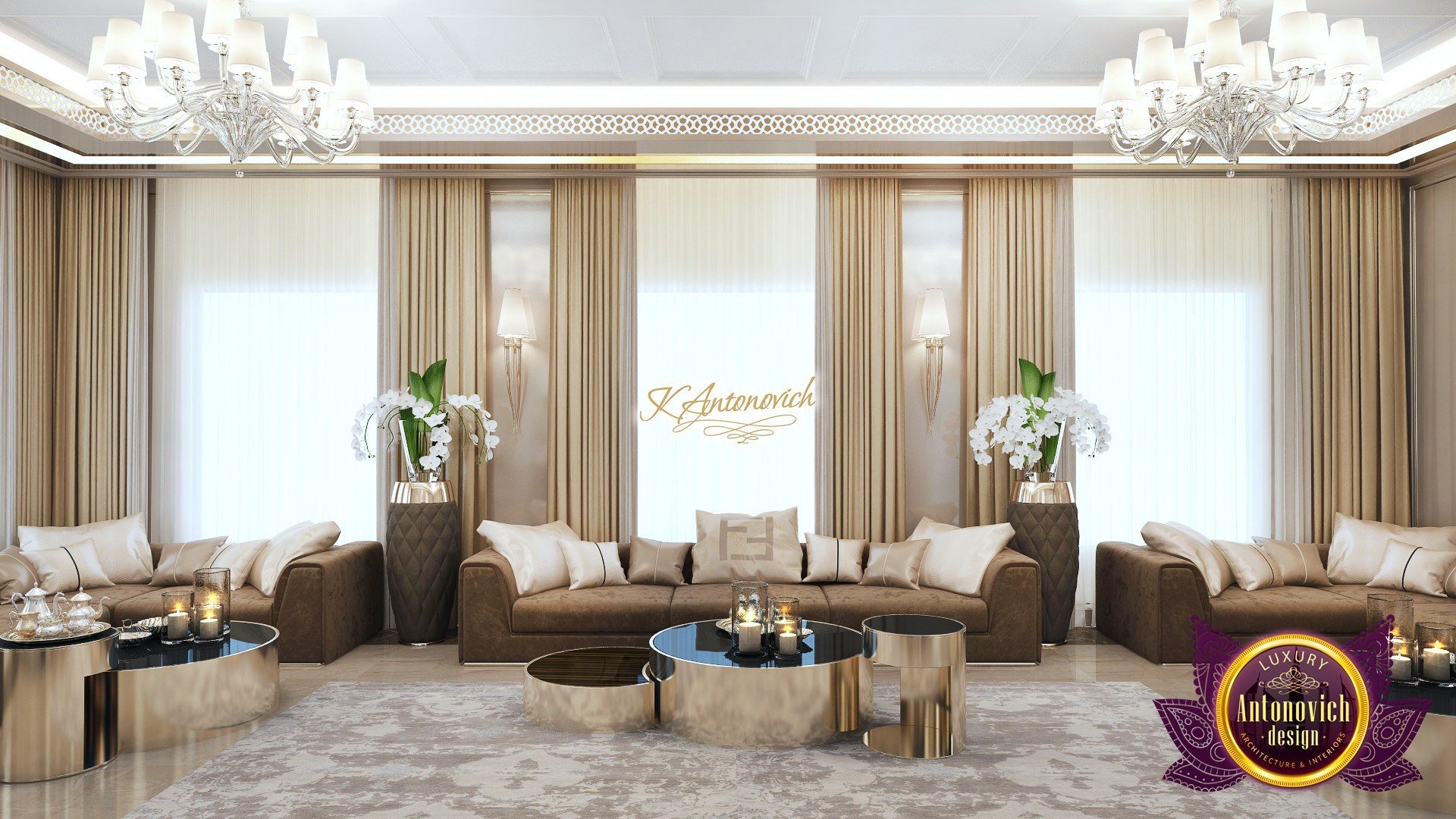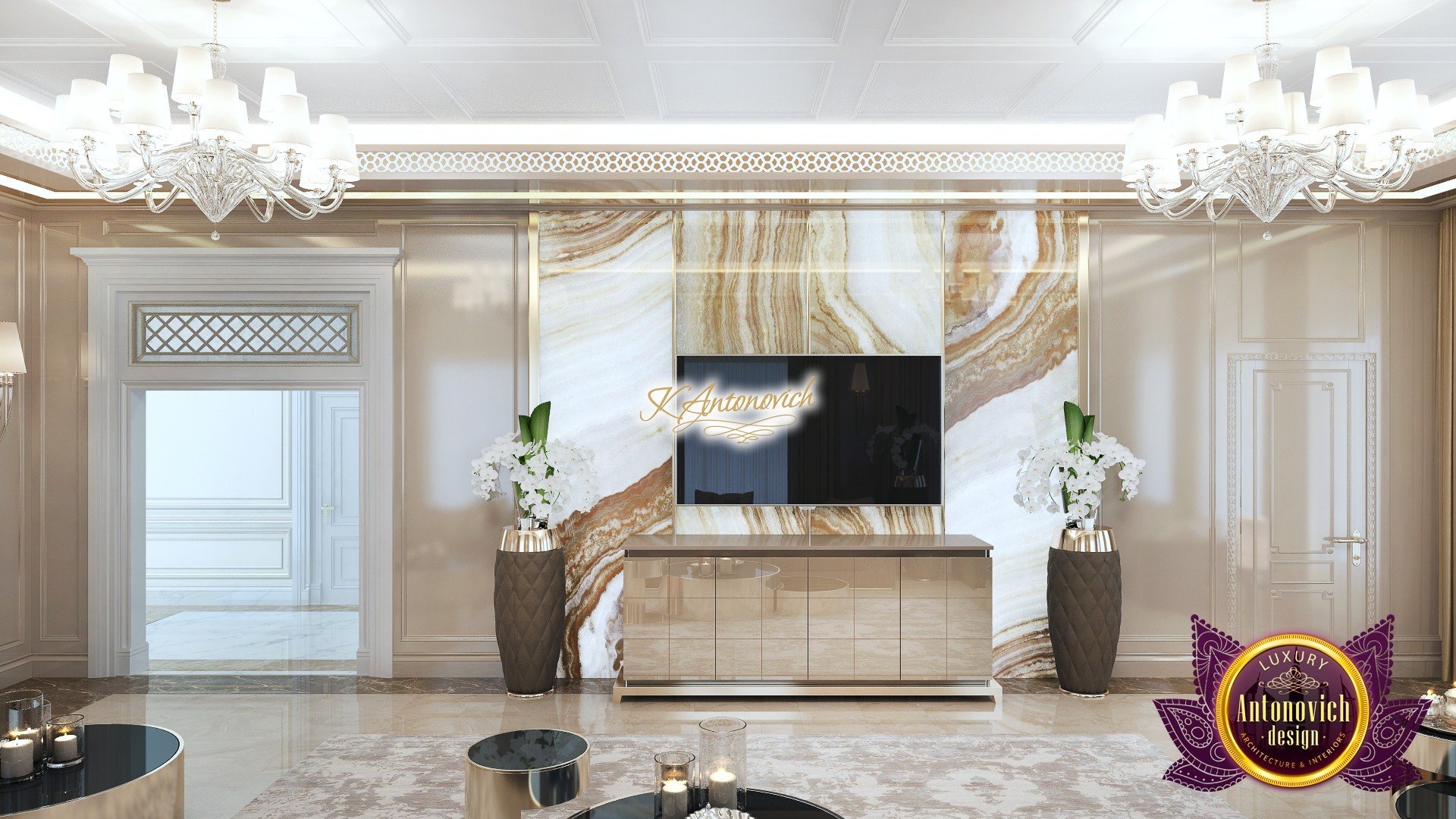 As opposed to the usual modern interior, Katrina Antonovich designs features a more softened and rounded elegant piece. A more contemporary approach to an apartment. Walls and decors are nothing short of complex gold and marbled design. The over-all hues of the room veer on a more neutral, relaxed luxury lifestyle.