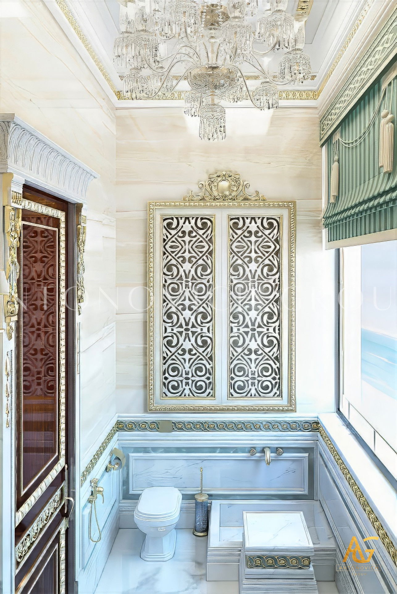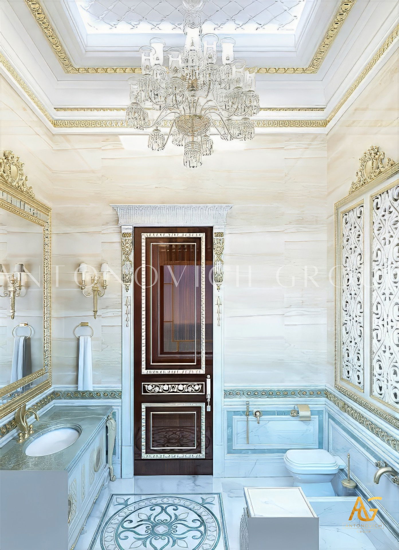 This luxury bathroom interior designs stunning color is one of a kind. Its difficult to find a suitable shade of brown and green these days, but Luxury Antonovich Design and its creative interior designers were able to create a lovely theme that is exactly intended to suit the needs of a wealthy lifestyle. The magnificent furniture is a part of the luxury and gorgeous bathroom interior design. The massive chandelier, lovely racks, and magnificent sink are just a few of the many high-quality elements of this luxurious bathroom interior design.