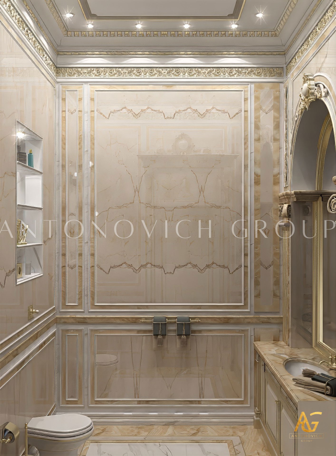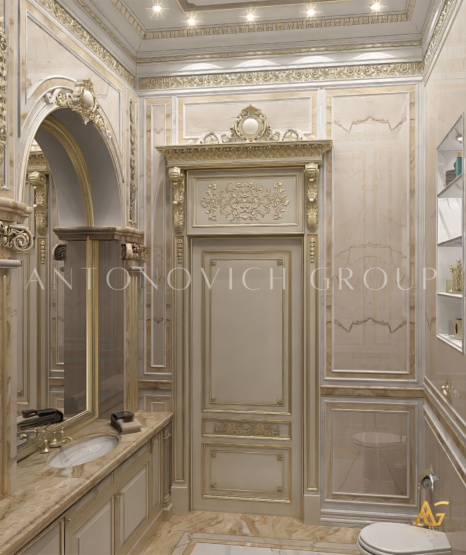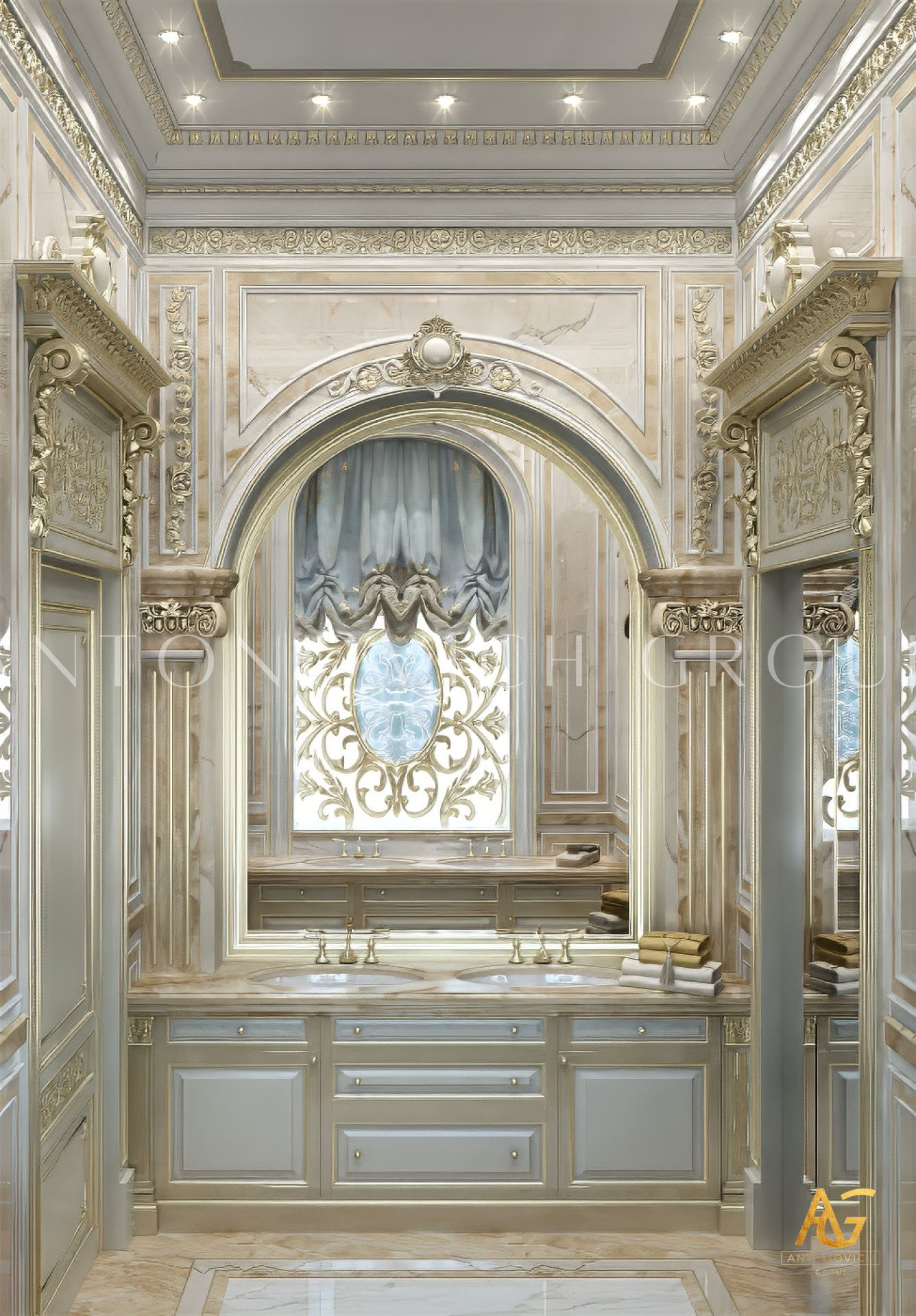 The luxurious bathroom interior design for a luxury home also includes wonderful racks and cabinets for storing your stuff. The mirror is another lovely feature of this luxurious bathroom interior design. The mirrors elaborate border and outline features are a stunning sight to behold. The ceiling, too, is one-of-a-kind! The details, which include a nature-like accent, draw a lot of attention. The luxury bathroom interior design has been created with a great deal of love. The colors serve to create a soothing ambiance, while the lighting gives the luxury bathroom a wonderful impression. Everything about this work is undeniably appealing!