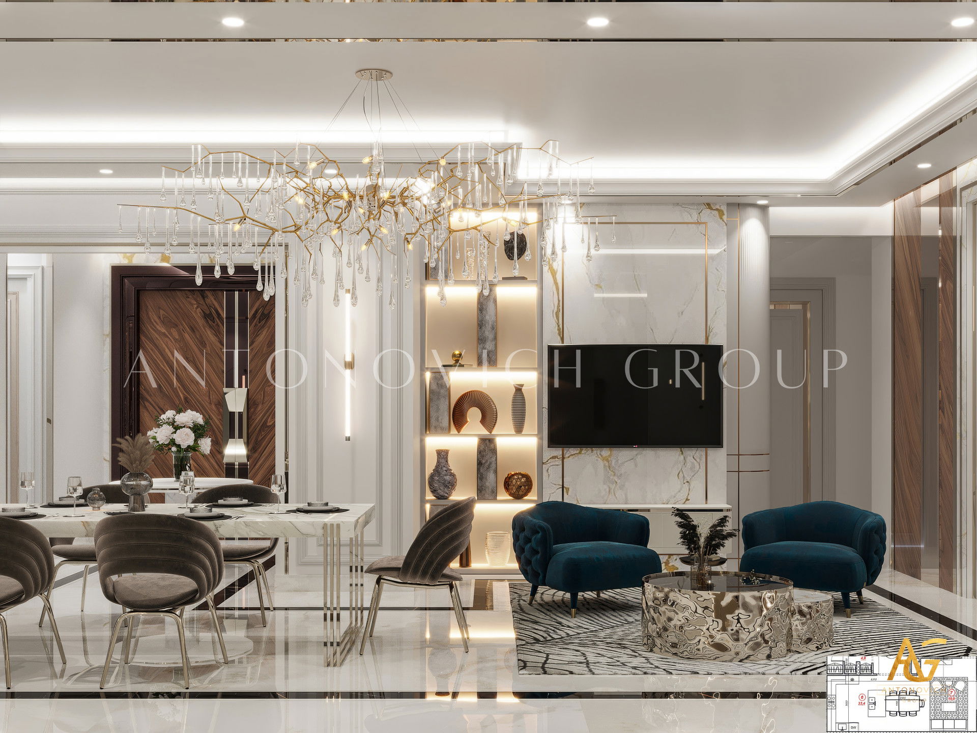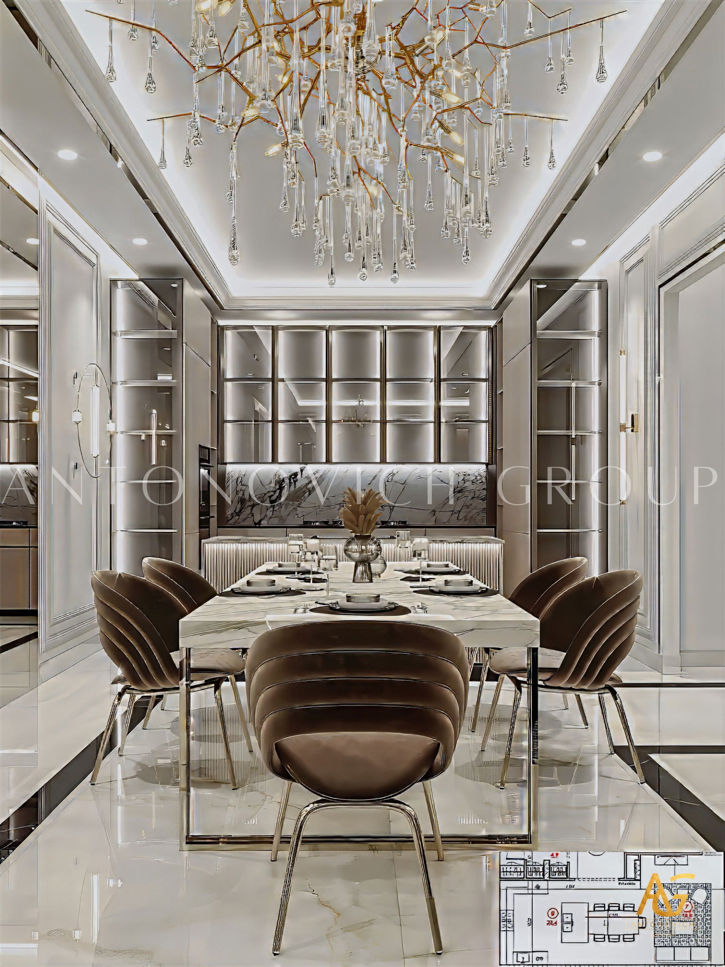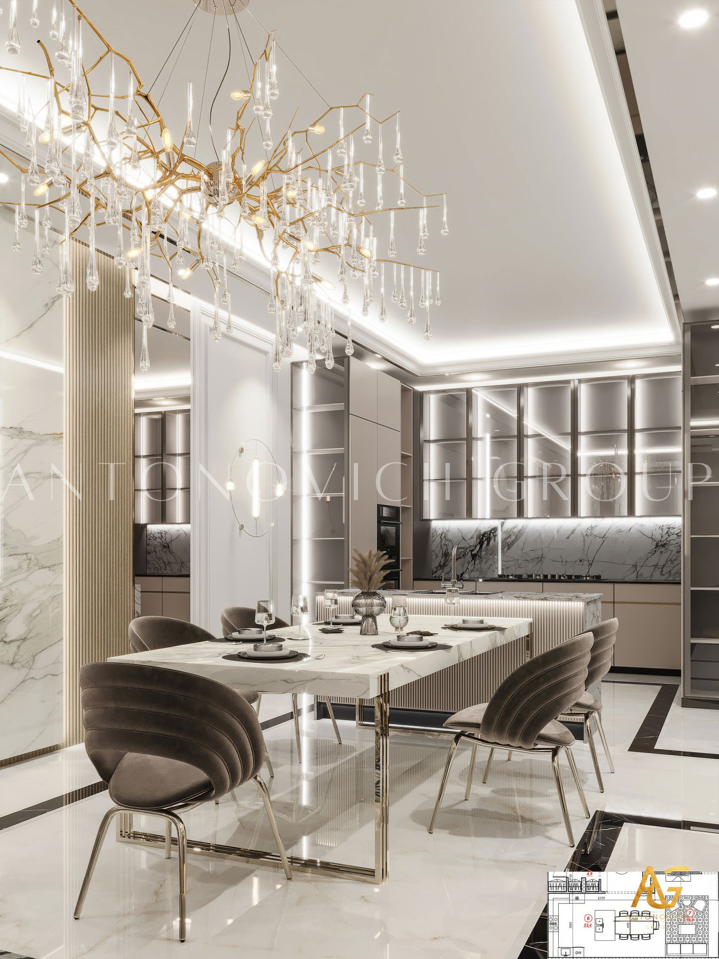 In the entertainment section near the dining area, the family and their guests can watch TV while eating delicious meals. It is finished in light and gold to match the rest of the luxury villa interior design Dubai. Extra furniture and an elegant sofa were created to provide a place for the clients to relax. Because the large rooms in the unit share a large window for natural light, additional lighting was installed to keep the luxury villa interior design Dubai well-lit while remaining elegant and classy. In addition to touches of white and neutral shades, the luxury villa interior design Dubai uses brown tones as an accent color to give it a fresh vibe. Antonovich Group chose a light gray sofa as the main seating piece to complement the color scheme. Throw pillows with covers and a patterned carpet round out the cozy look. Cove lighting highlighted the white wall, which helped set the tone in the room. Because of the beautiful and detailed accents and features that surround the massive luxury villa interior design Dubai, living here will undoubtedly make you feel like youre on top.