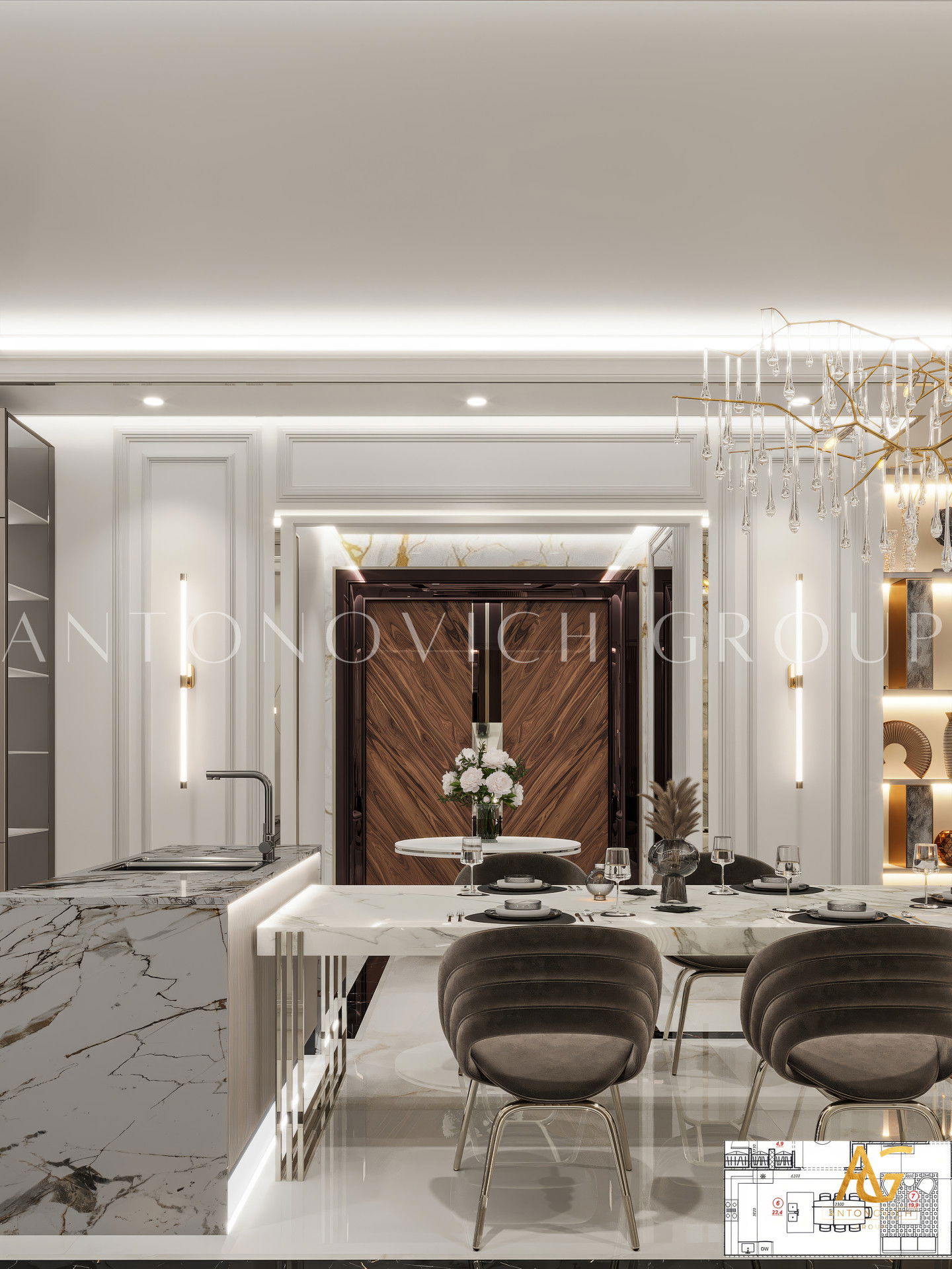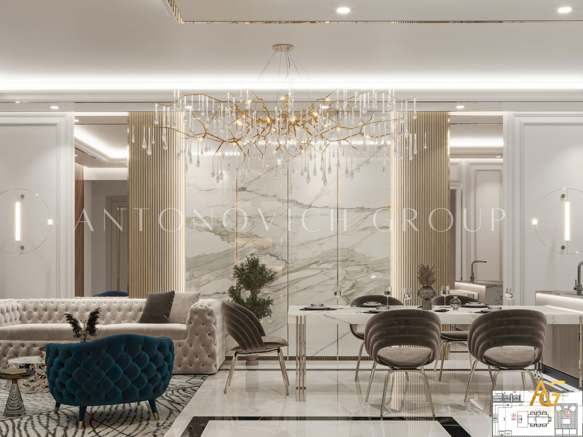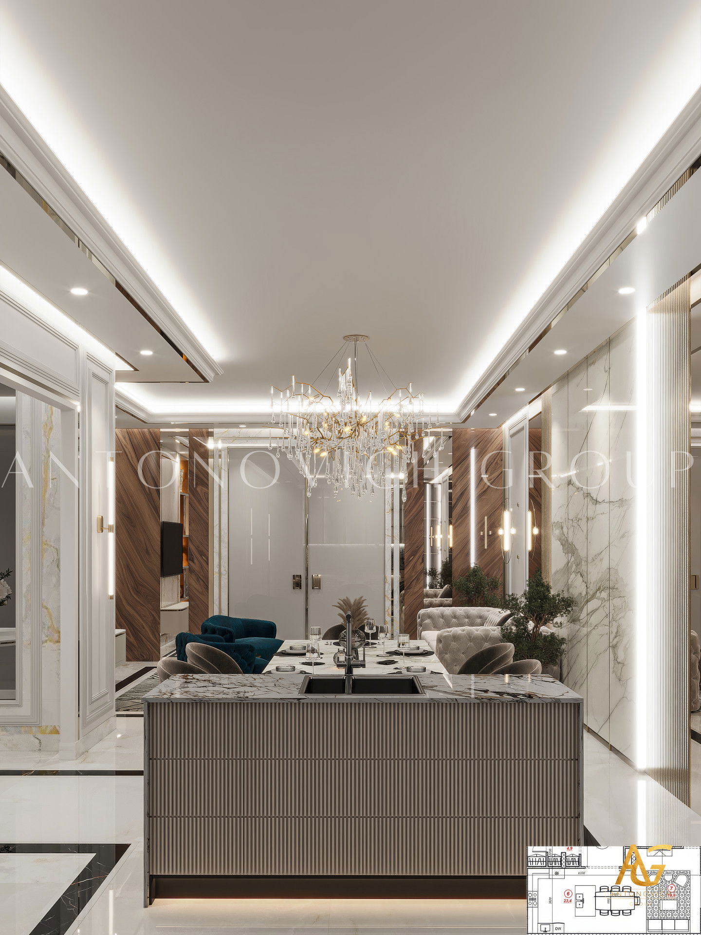 In the entertainment section near the dining area, the family and their guests can watch TV while eating delicious meals. It is finished in light and gold to match the rest of the luxury villa interior design Dubai. Extra furniture and an elegant sofa were created to provide a place for the clients to relax. Because the large rooms in the unit share a large window for natural light, additional lighting was installed to keep the luxury villa interior design Dubai well-lit while remaining elegant and classy. In addition to touches of white and neutral shades, the luxury villa interior design Dubai uses brown tones as an accent color to give it a fresh vibe. Antonovich Group chose a light gray sofa as the main seating piece to complement the color scheme. Throw pillows with covers and a patterned carpet round out the cozy look. Cove lighting highlighted the white wall, which helped set the tone in the room. Because of the beautiful and detailed accents and features that surround the massive luxury villa interior design Dubai, living here will undoubtedly make you feel like youre on top.
