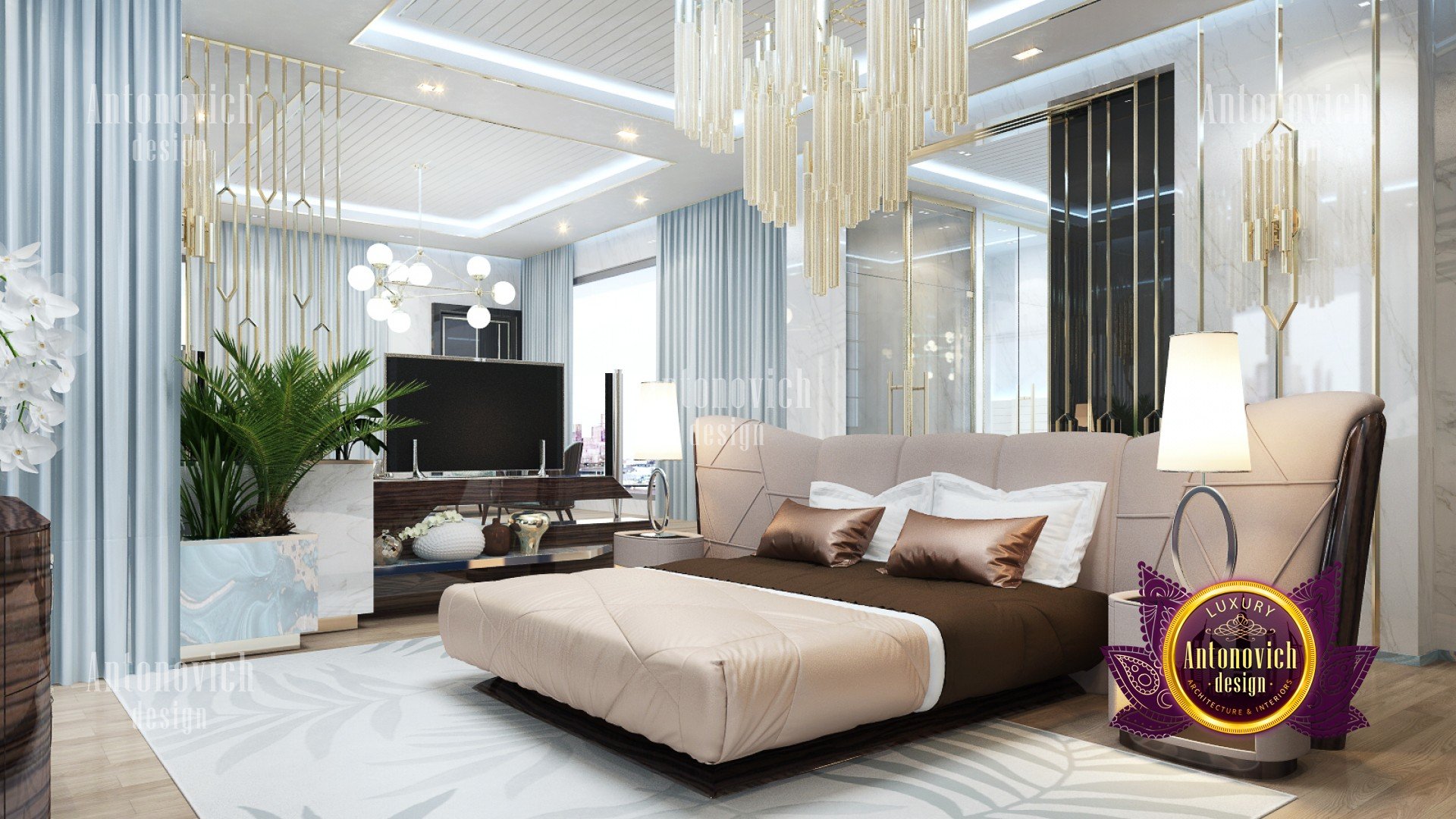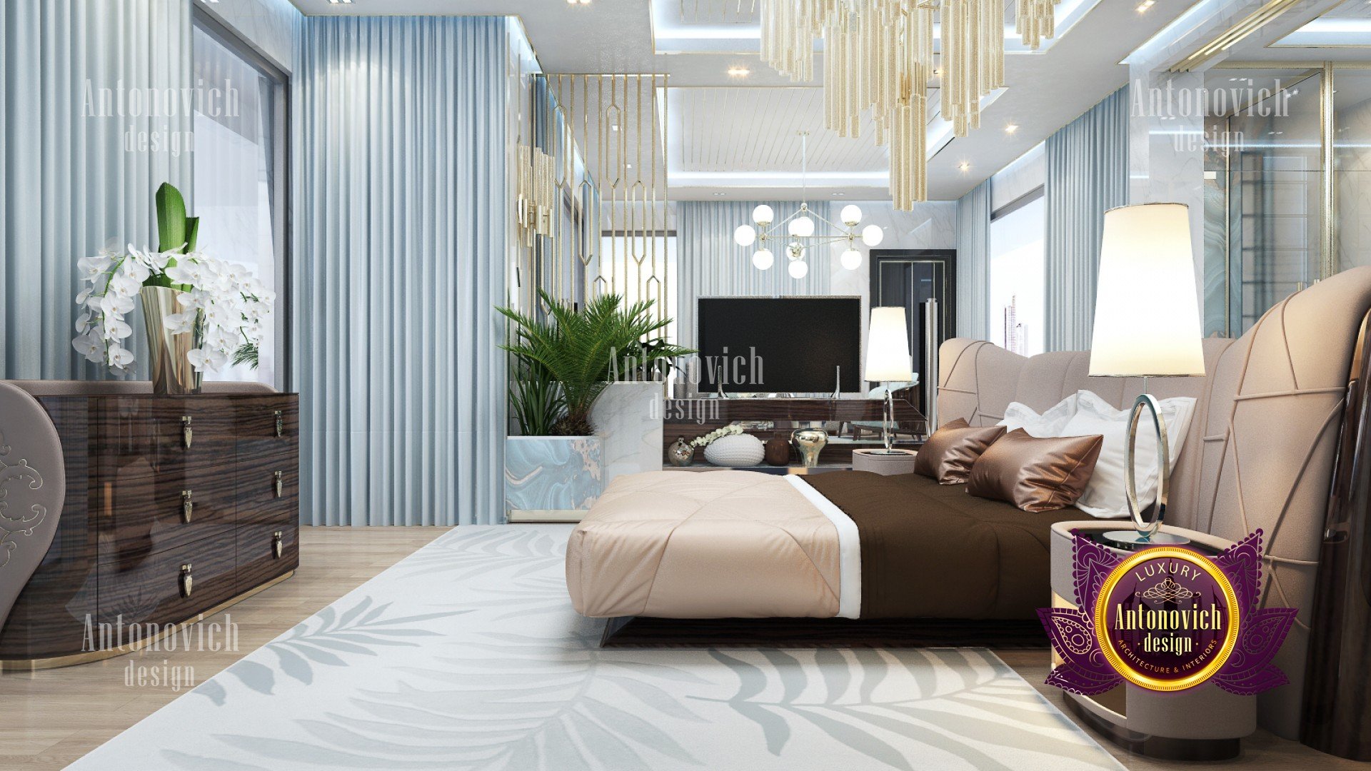 The modernity of the design and the classic color combinations used creates a dynamic bedroom design that looks timeless and effortlessly beautiful. There is no limit in designing your bedroom, but there are guidelines to follow to achieve a well designed fantastic bedroom. Playing with the old and incorporating it with the new makes an unbeatable bedroom design that is unique and functional for clients and friends. Shades of copper and chocolate are blended with this powder blues to balance the room with the different tones that set the mood right. These two naturally calming colors contribute to the comfortability of this fantastic bedroom design. The Luxury Antonovich Design firm makes sure that you will have the best bedroom design that has all the functions and the best interior for a relaxing stay every day.