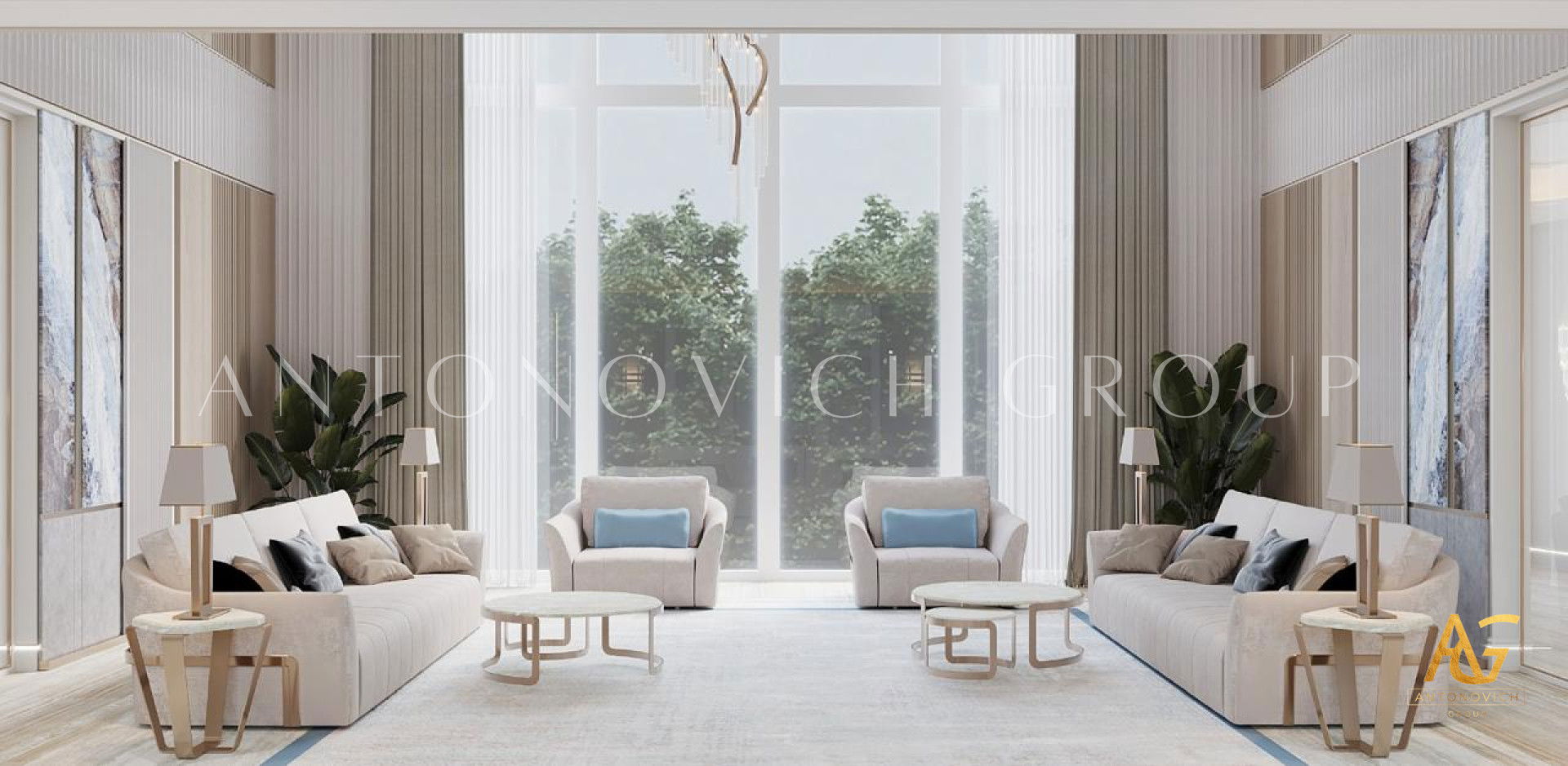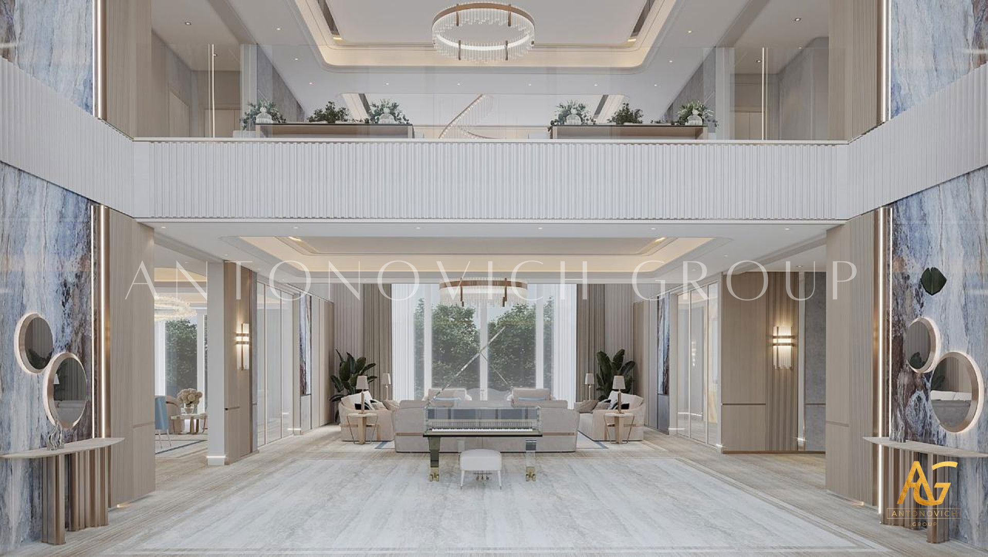 Modern palace, which impresses with its splendid decoration created by designers of the studio Antonovich Design. As a basis of the elite interior decoration of the villa in the UAE, we took luxurious white marble. Elegant interior design is closely connected with the architectural project. House central portal has become the epicenter of the magnificent interior story interior design images. And the simple interior design of the hall became double staircase of white marble, leading to the second floor of a beautiful villa.The graceful contours of ladder portal are joined at the top part and become the beginning of a large terrace on the second floor. Marble floors are decorated with carvings of natural stone in different shades. A special role was given by interior designers to the decoration of windows on the first and second floor. Some windows decorated with luxurious velvet curtains in a classic style hue of rotten cherries. The rest of the windows are decorated with very beautiful stained glass windows with the authors patterns. A real masterpiece, which graced the interior, became a magnificent stained-glass dome. This element defines the center of the luxury space as well as a massive crystal chandelier. 3d interior design of houses in the classical style is the new masterpiece of talented designers Luxury Antonovich Design studio. Interior design in UAE very harmoniously combine time-tested traditions and new technology. In order to create the ultimate comfort for owners of the house and their guests, modern elevator in the lobby was provided. Due to the circular lift shaft of transparent glass and exquisite decor, elevator very harmoniously blended into the luxurious interior.