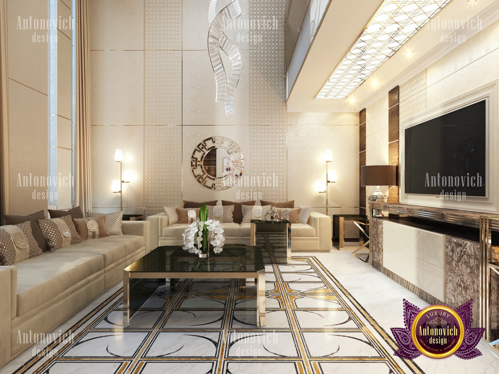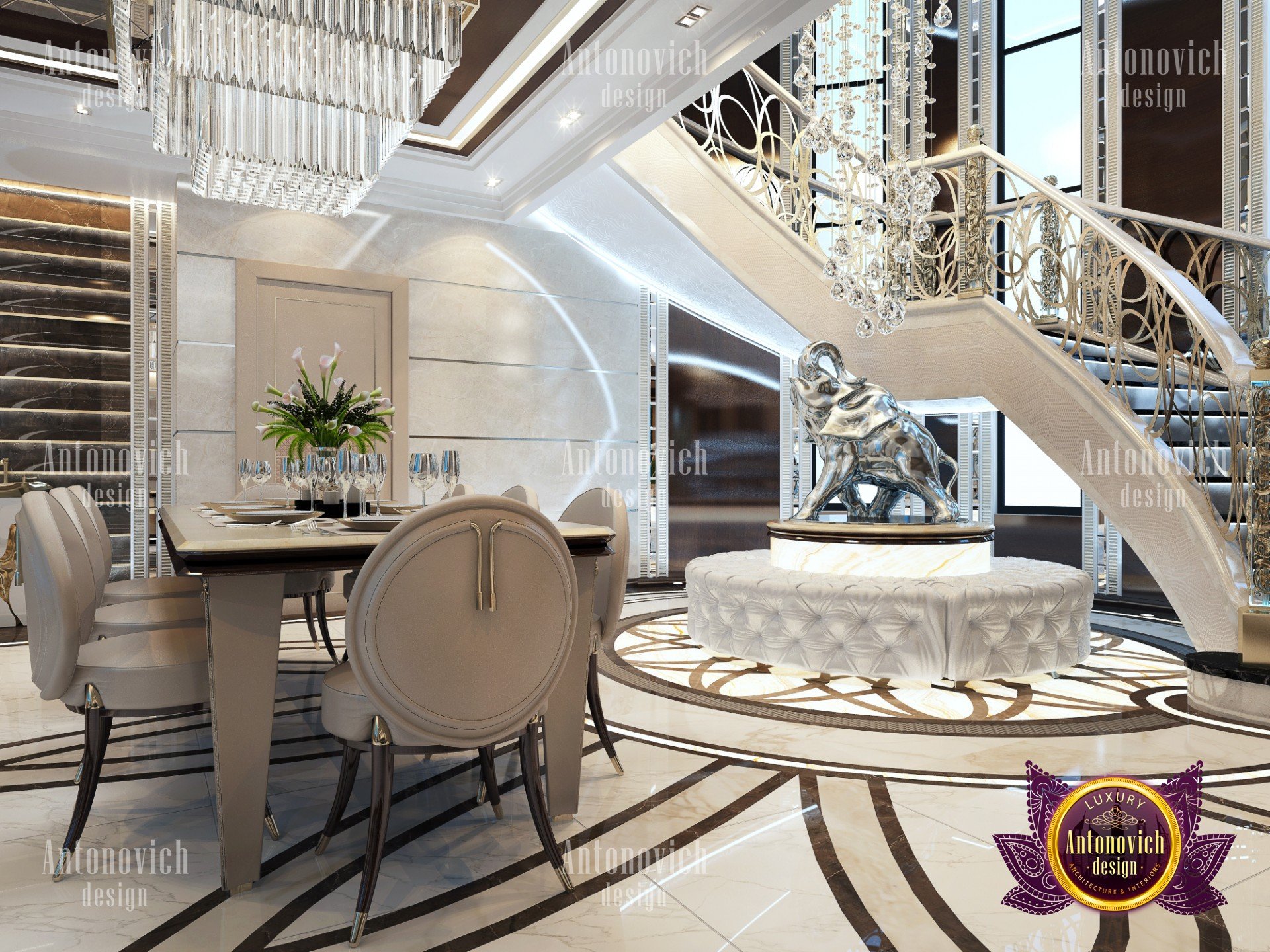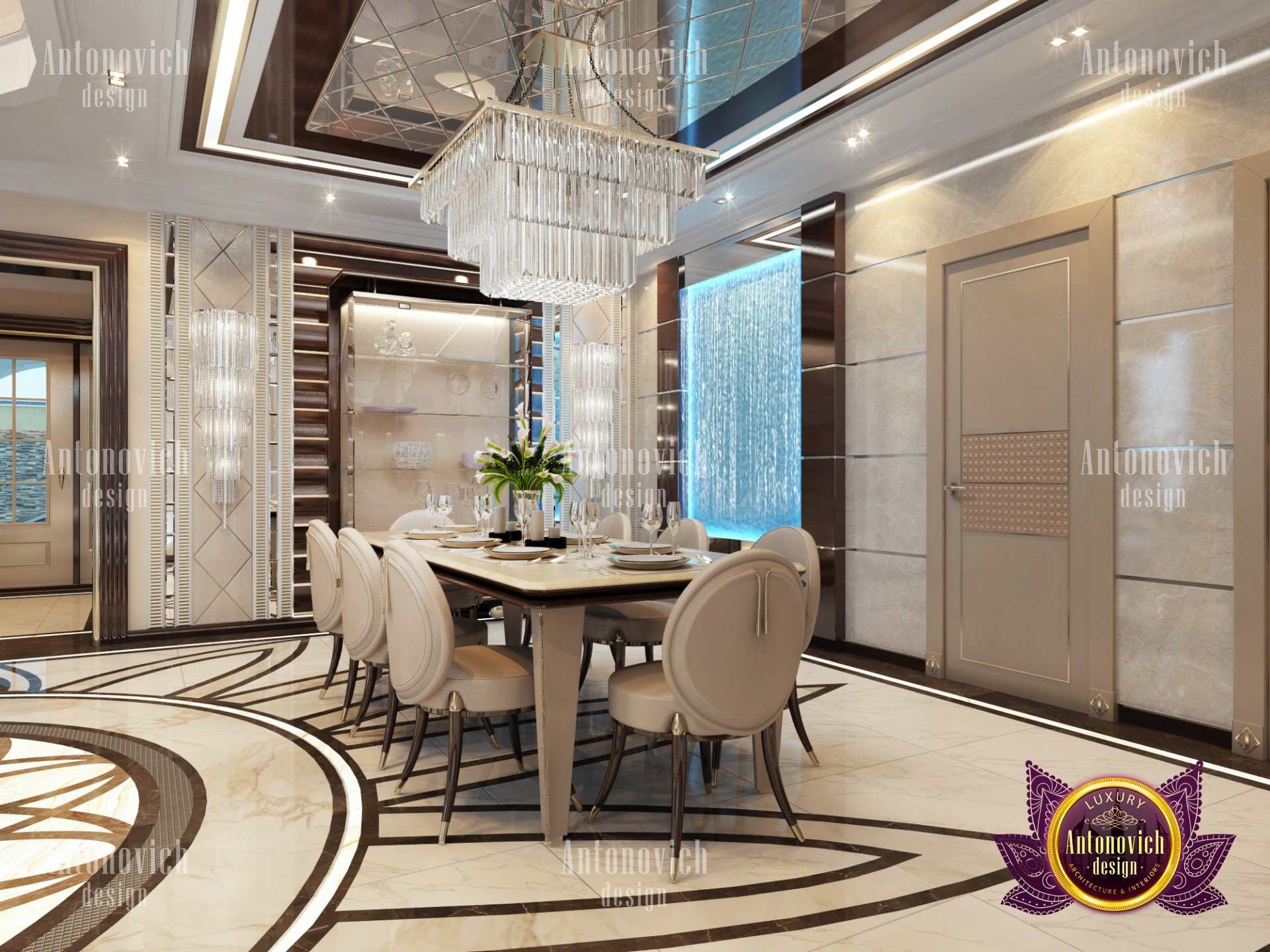 Perfect harmony and exceptional attention to detail are typical for this interior design of the house in the style of modern classic from Luxury Antonovich Design. Restrained decor of the hall is compensated by elite materials іuch as a valuable tree and natural marble. The interior designers in Bangladesh offered accents of lighting in the form of chandeliers and lighting lines. The elegant and aristocratic interior of the hall is turned into a cozy living room. The interior designers in Bangladesh added notes of festive art deco. The elegant chandeliers and luxurious furniture are perfectly looked in the overall caramel-coffee range of shades. Pay attention to the wonderful repetition of ornaments in the decor of walls and furniture elements. This is a statue of elephant, which makes the interior of the living room integral and expressive. Large panoramic windows are covered with luxurious curtains made of natural silk chocolate shade. Here, the dining area is in the same color scheme. In the project we use only modern systems and think over the placement of the latest dining furniture. The living room design also has an elegant and refined character. The elegant furniture wonderfully fits in the interior. A large waterfall on the other side of glass has become a real source of joy for home owners and their guests. Our highly qualified specialists create a true masterpieces of architecture in Bangladesh.