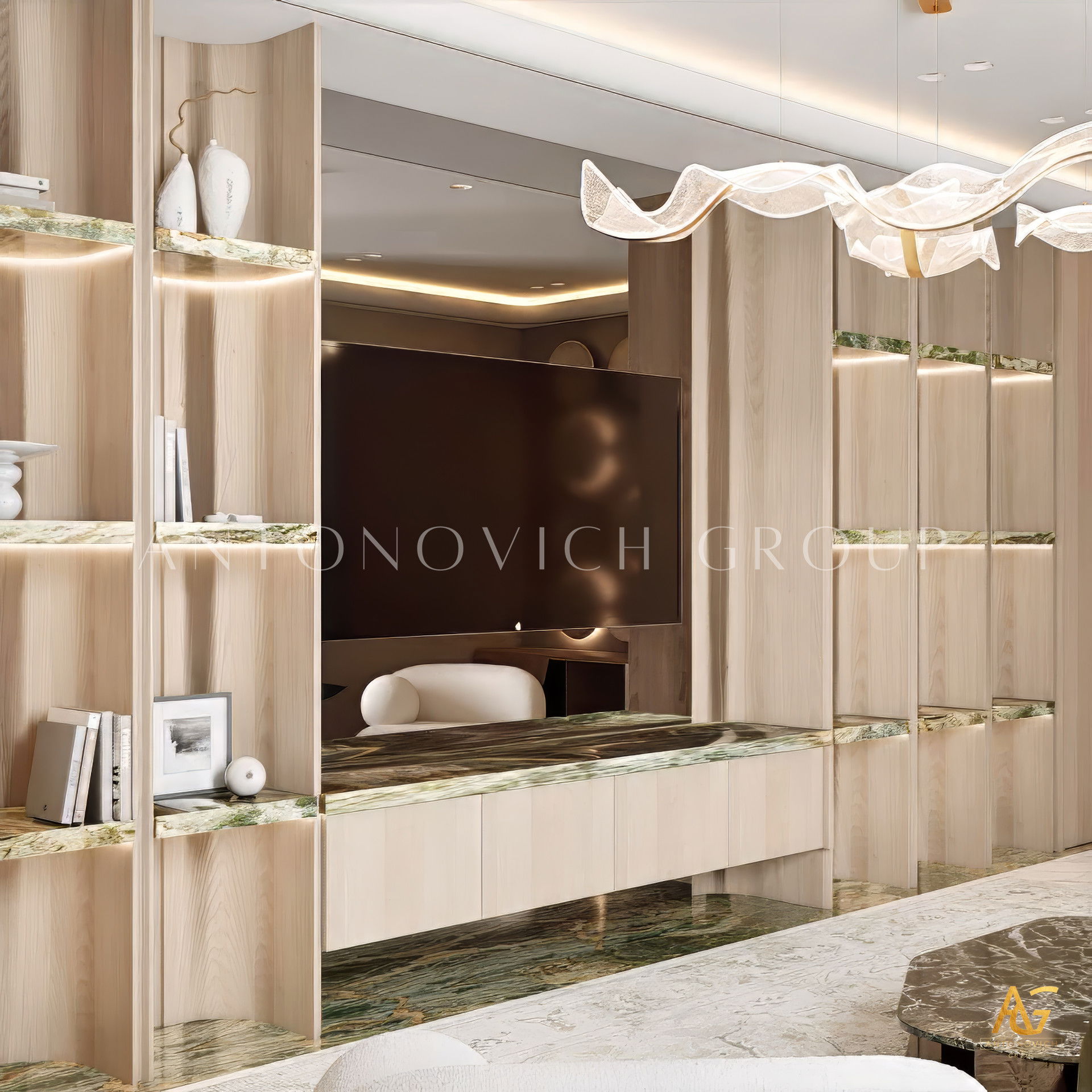 Antonovich Group is widely recognized for its interior design expertise that blends contemporary trends with timeless sophistication. Each project begins with a detailed consultation to understand the client’s vision and lifestyle. The design team then develops personalized concepts for living rooms, dining areas, bedrooms, and family sitting rooms.
