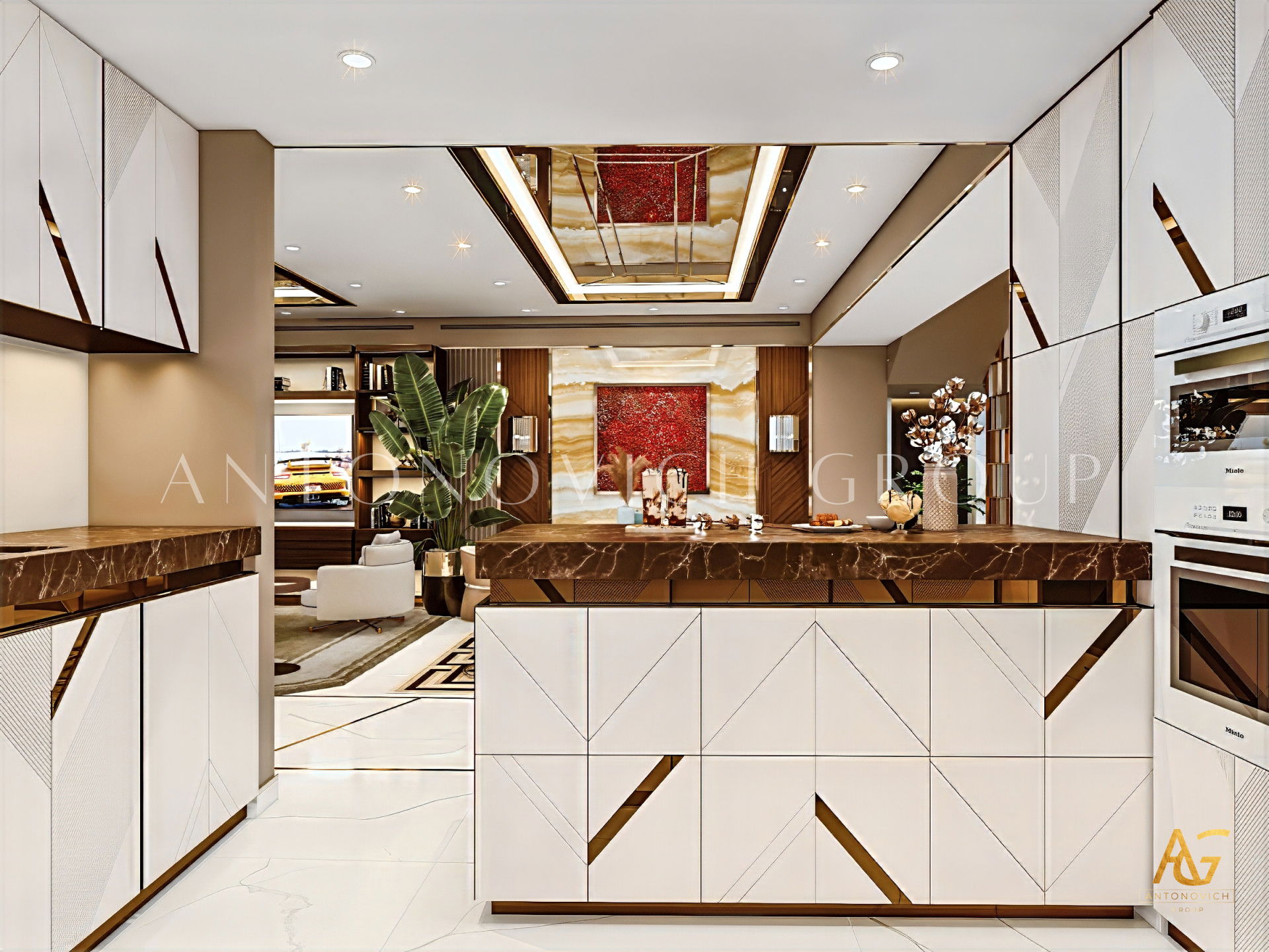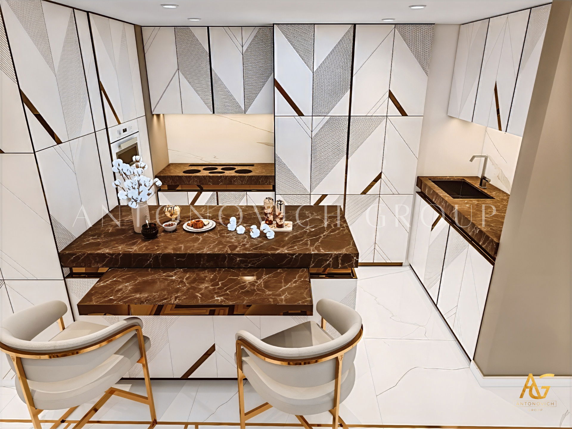 The interior of the kitchen was created by the designers of the studio Luxury Antonovich Design as a space that is designed to combine a cozy mood, comfort, and functionality. The style of minimalism very often becomes the basis for the creation of kitchen interiors, even if the rest of the space in the house or apartment is made in different styles. This beautiful kitchen was the continuation of a large living room in the Art Nouveau style. However, for the kitchen, the authors of the project proposed to minimize the decor, to further highlight the living room as the main and most elegant place in the house interior. The clarity of the lines and the beautiful geometry of the forms, combined with a pleasant range of warm colors, fill the kitchen space with a very warm and cozy mood. Insular design in the center of the room with high bar stools looks unassuming and comfortable. The interior of the kitchen did not look simple and boring. The interior designers luxuriously improvise with the decor of the walls and the facades of kitchen furniture. Behind the facade of furniture as accents, they offer three-dimensional 3D panels with an easy wave of ornament. The other facades of the walls are smooth with glossy painting visually expand the interior. And of course, behind these facades are concealed the newest storage systems and modern kitchen appliances. Continues beautiful furniture — the decor of the walls. The top of the walls along the entire perimeter of the kitchen was decorated with a large geometric pattern. To make the kitchen visually higher, the authors of the project use lighting accents and a niche on the ceiling. Marble on the floor performs both visually aesthetic and practical functions.