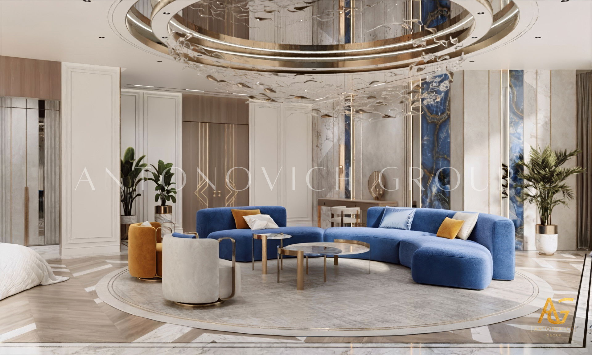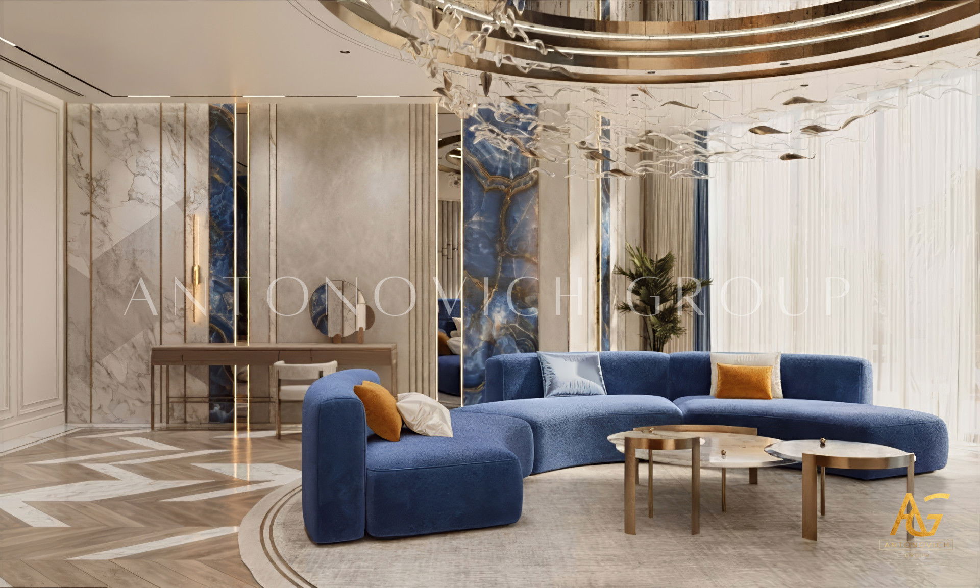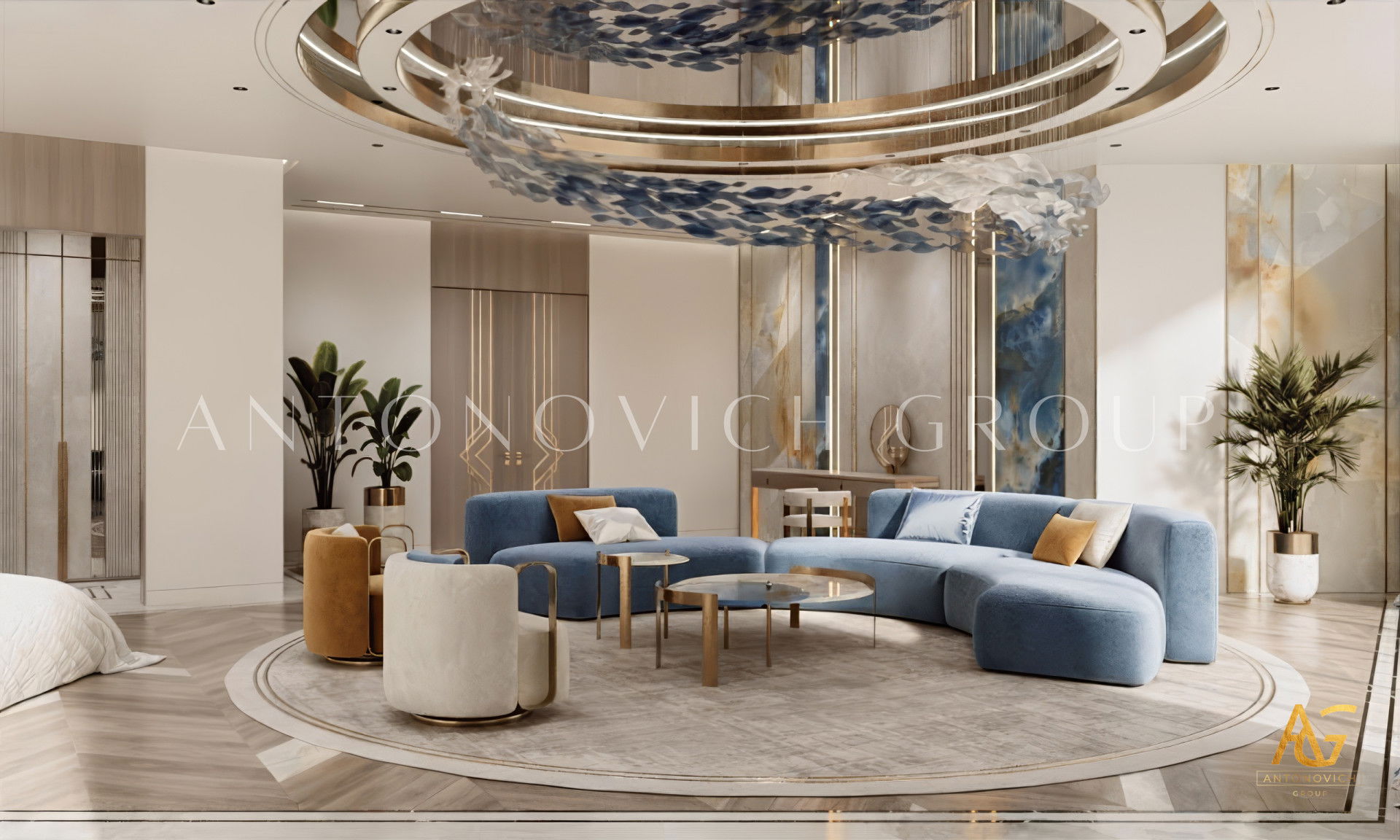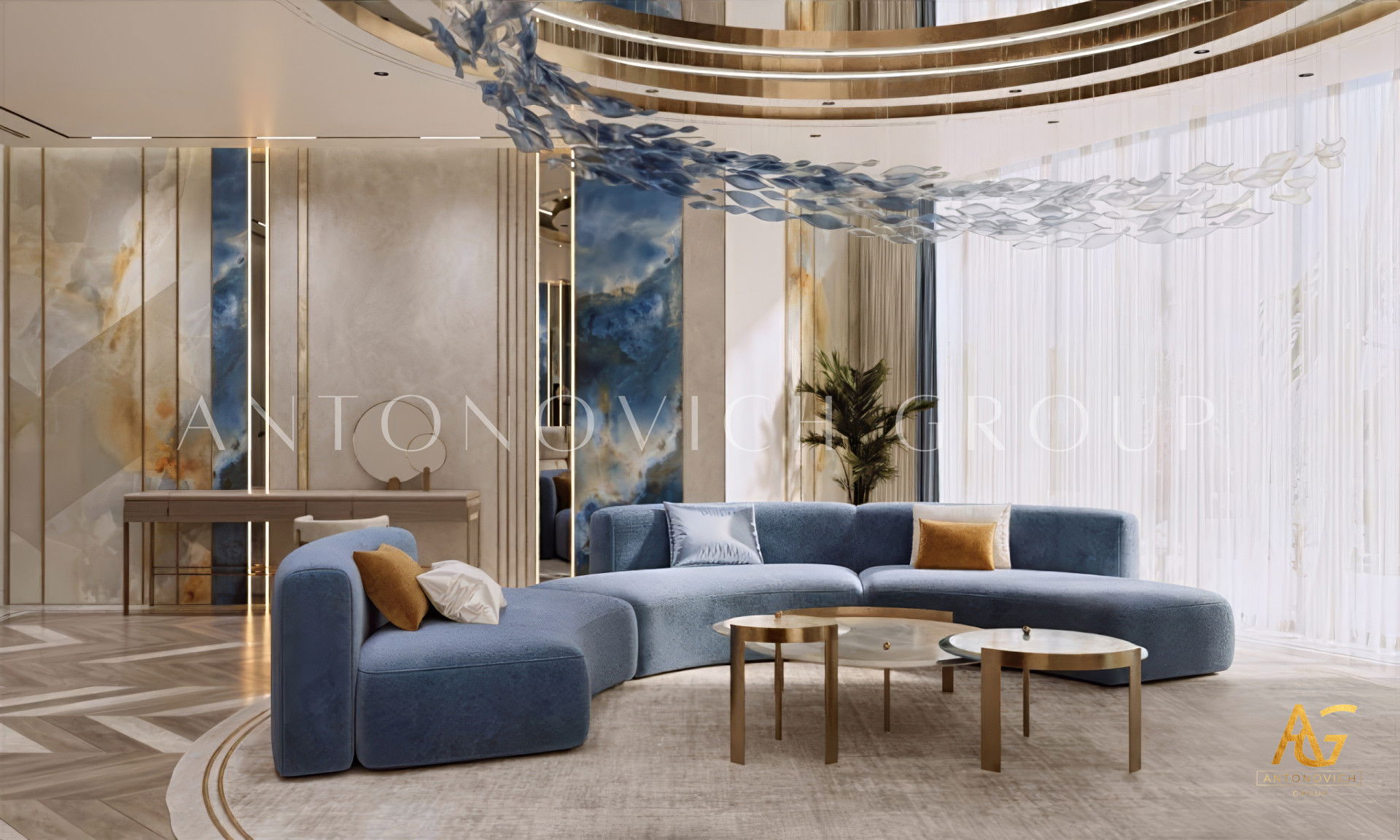 House design in Ras al-Khaimah became a wonderful reflection of how beautiful can be a combination of old traditions and modern technologies. Interior designers Ras al-Khaimah brought into modern classics surprisingly beautiful accents that made the interior of luxury villas in Ras al-Khaimah luxurious and expressive. The mood of light freshness and warmth of home comfort literally wraps from the first moments of your stay in the house. Made of natural marble flooring with lighting lines, as usual, is a highlight of each project. Charming pilasters with pearl decorative stripes is supplemented by inserts made of crystal and light. Gently blue light, which is based on modern light-emitting diodes, helped interior designers Ras al-Khaimah arrange refined accents in all apartments. Mirrored panels have a graceful and elegant look in the interior. The decor of walls designers uses decorative plaster and lighting elements. To visually expand a luxurious space - large mirrored panels.Elegant hall interior mood continues in the lush luxury living room. Sofas complemented with soft silk cushions pale blue. Each element of the decor plays a special role. The curtains in the living room perfectly harmonize with upholstered furniture. The interior evokes the delightful emotions of the wonderful celebration of life. Dining area and living room are divided by classical columns with rectangular bases. The interior of the villa in the Ras al-Khaimah looks very noble and aristocratic.