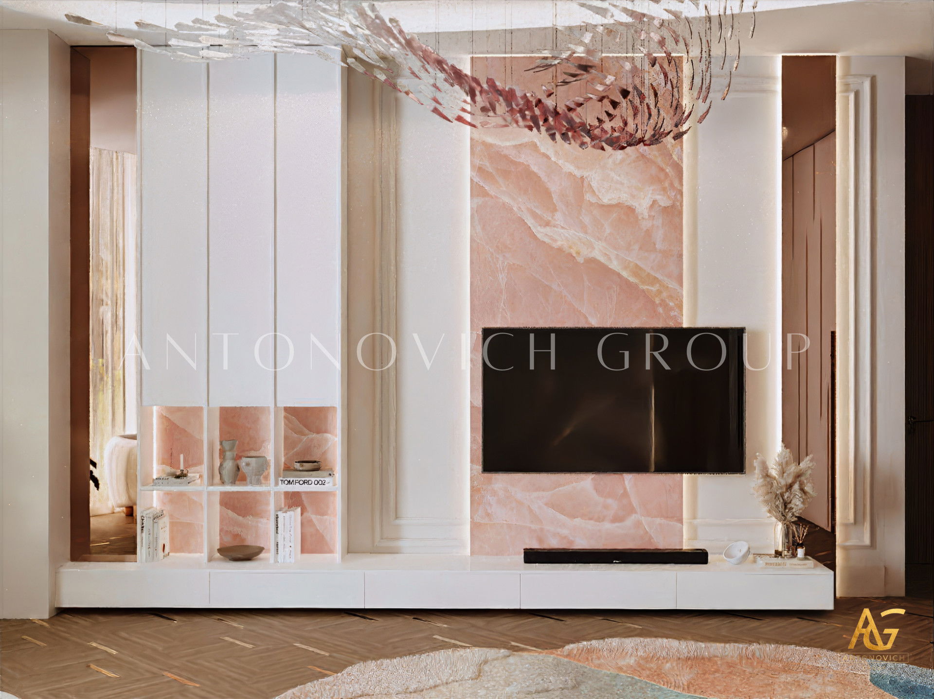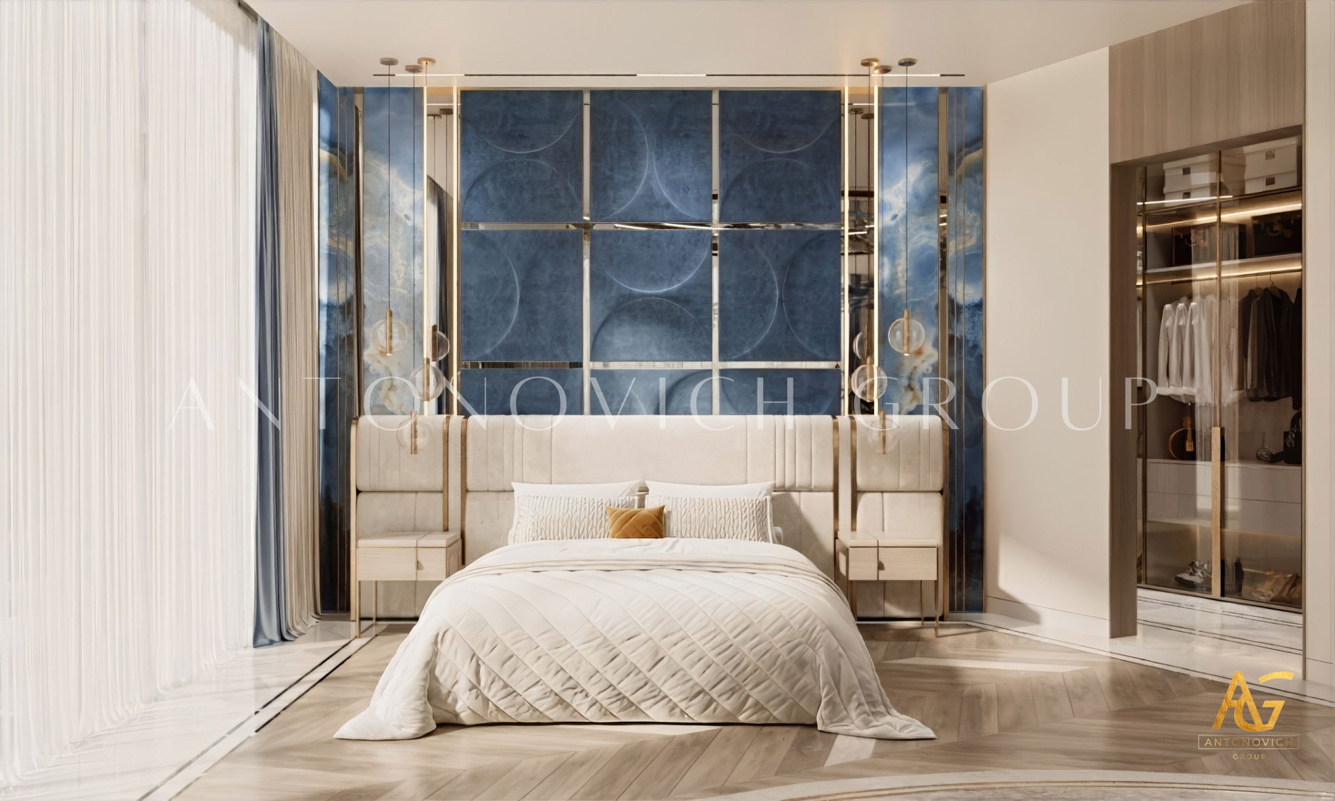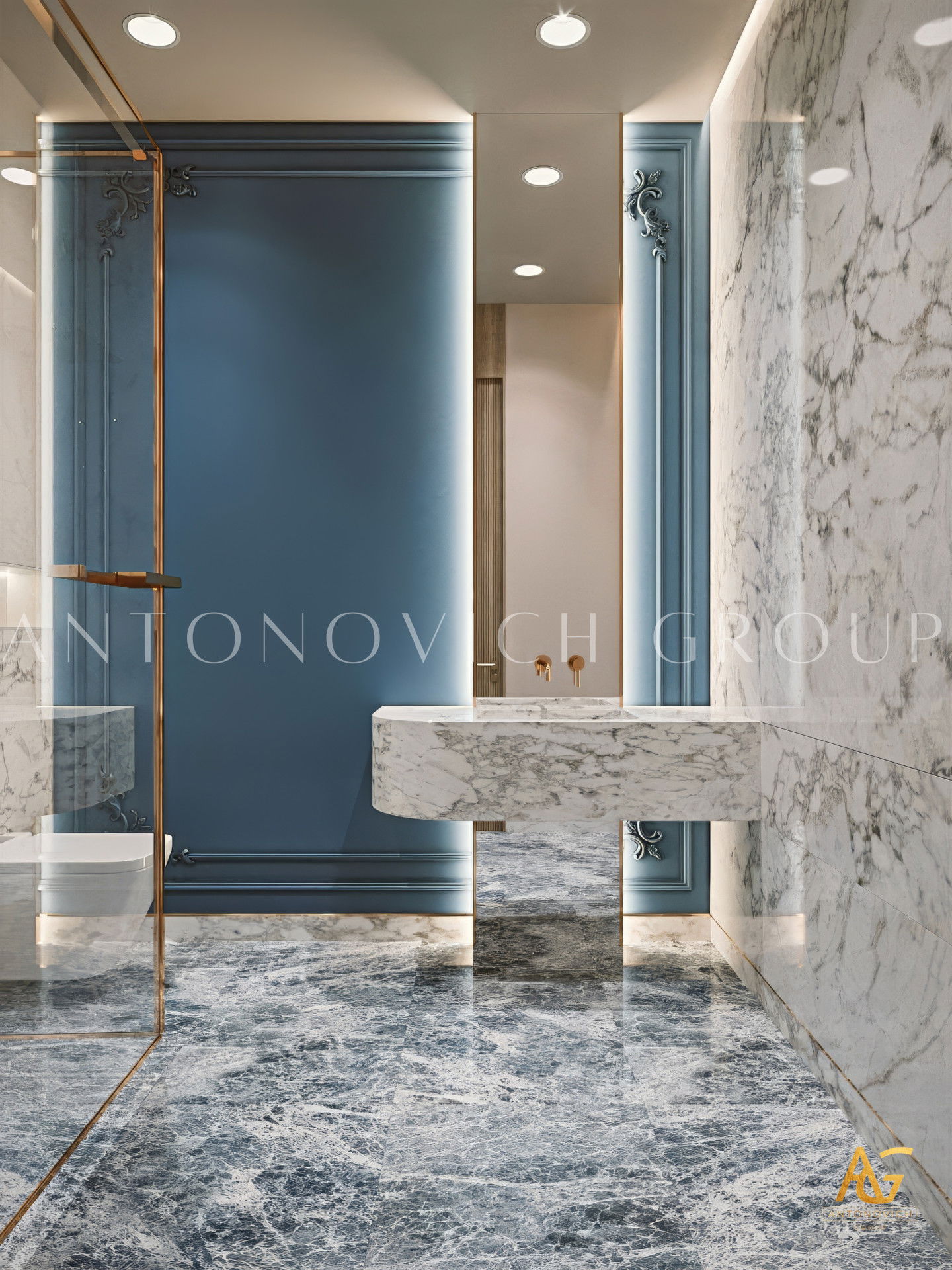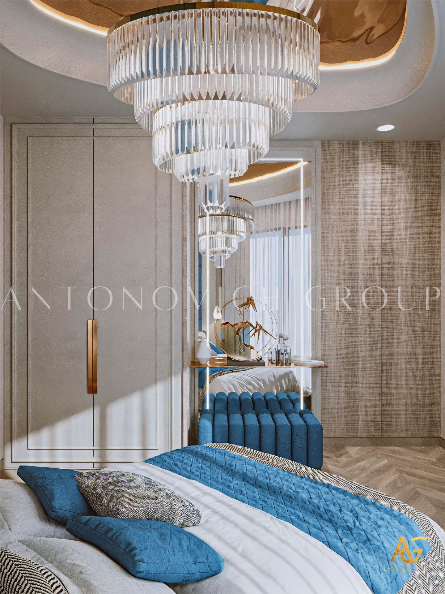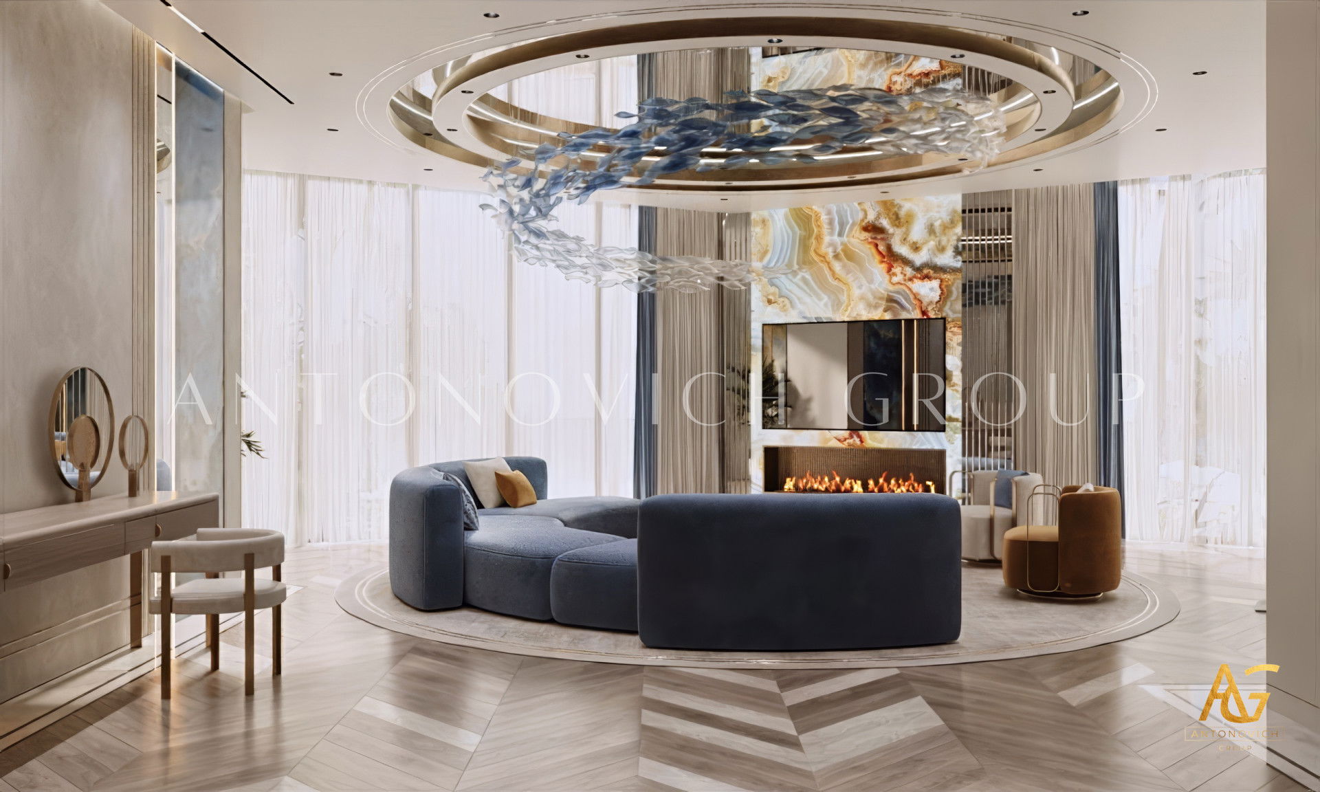 House design in Ras al-Khaimah became a wonderful reflection of how beautiful can be a combination of old traditions and modern technologies. Interior designers Ras al-Khaimah brought into modern classics surprisingly beautiful accents that made the interior of luxury villas in Ras al-Khaimah luxurious and expressive. The mood of light freshness and warmth of home comfort literally wraps from the first moments of your stay in the house. Made of natural marble flooring with lighting lines, as usual, is a highlight of each project. Charming pilasters with pearl decorative stripes is supplemented by inserts made of crystal and light. Gently blue light, which is based on modern light-emitting diodes, helped interior designers Ras al-Khaimah arrange refined accents in all apartments. Mirrored panels have a graceful and elegant look in the interior. The decor of walls designers uses decorative plaster and lighting elements. To visually expand a luxurious space - large mirrored panels.Elegant hall interior mood continues in the lush luxury living room. Sofas complemented with soft silk cushions pale blue. Each element of the decor plays a special role. The curtains in the living room perfectly harmonize with upholstered furniture. The interior evokes the delightful emotions of the wonderful celebration of life. Dining area and living room are divided by classical columns with rectangular bases. The interior of the villa in the Ras al-Khaimah looks very noble and aristocratic.