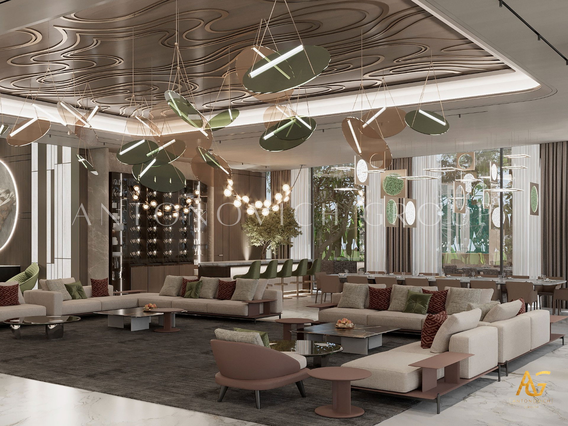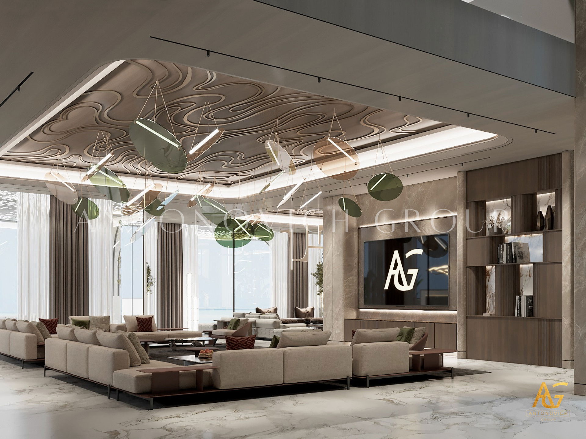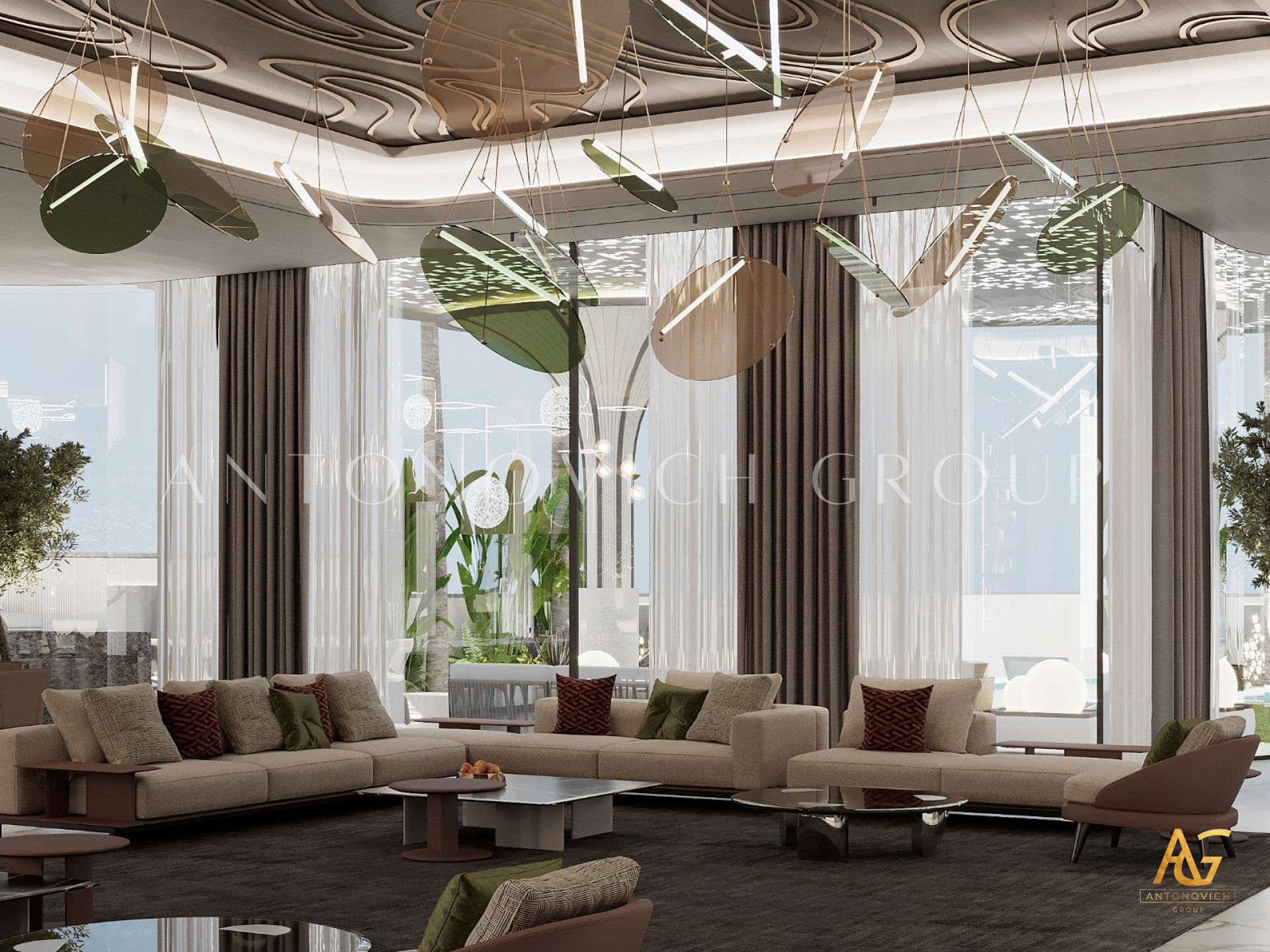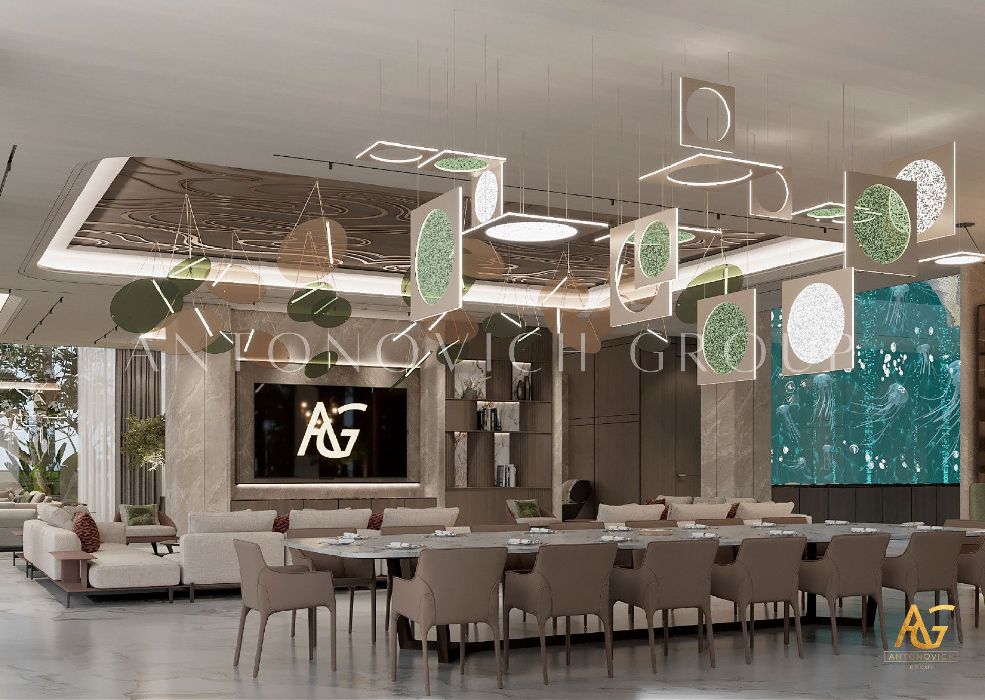 The interior design Dubai Luxury Antonovich Design is a wonderful opportunity for our customers to get really bright and unique interior, which is always comfortable, luxurious and warm. And no matter what the style of the interior is, it remains unchanged in each author's project in perfect harmony, perfection and aesthetic perfection. The living room design in a contemporary style is complemented with ornate accents of art deco. In the living room a nice range of warm shades of beige, chocolate and cream is dominated. These shades are cute diluted with turquoise accents of silk cushions on the sofas. The windows have curtains with noble silk of two hues. Shining surface of precious marbles in bright colors outlined rectangle of brown marble. This combination is present in the windows decoration. Against the background of bright silk brown silk curtains that are picked up by turquoise ribbons, looks bright. Glow of the marble decor enhances the ceiling with an abundance of stylish lighting of author's chandelier with tender curls. Living room interior design is in harmony with the dining area design. These two space are separated with stylish columns and elements of the LED backlight. Elegant and stylish table is surrounded by chairs with graceful forms. Interior design Dubai from Luxury Antonovich Design always features spectacular design techniques and exclusive solutions. Living room interior design always has a pleasant feeling of warmth comfort and absolute comfort.