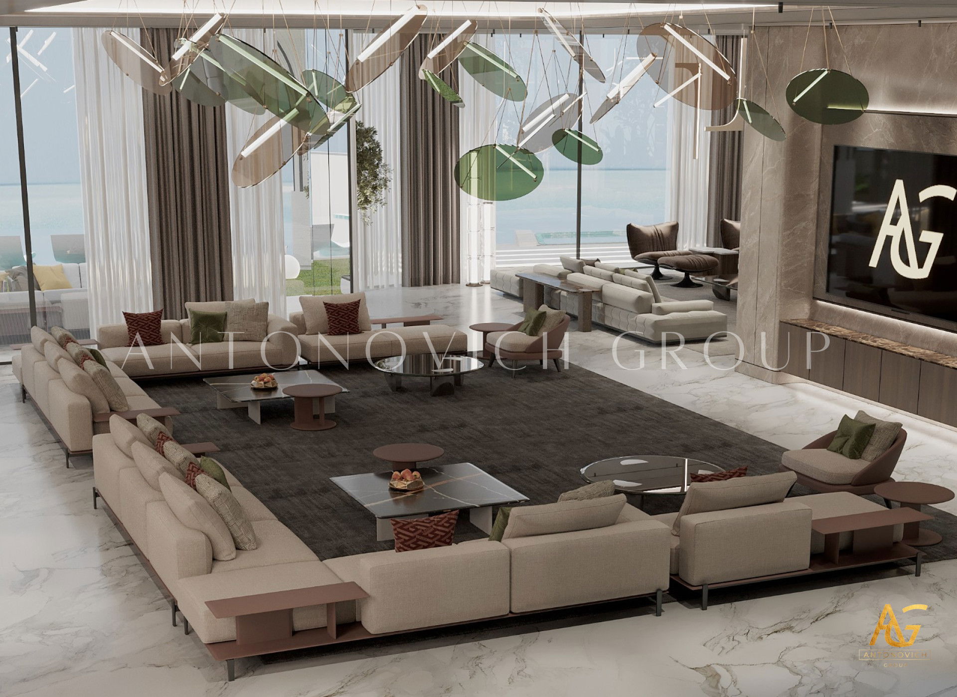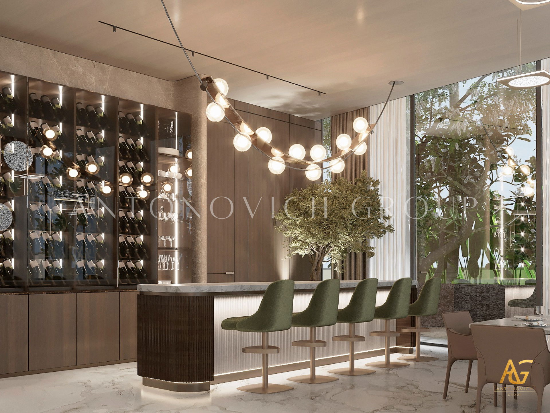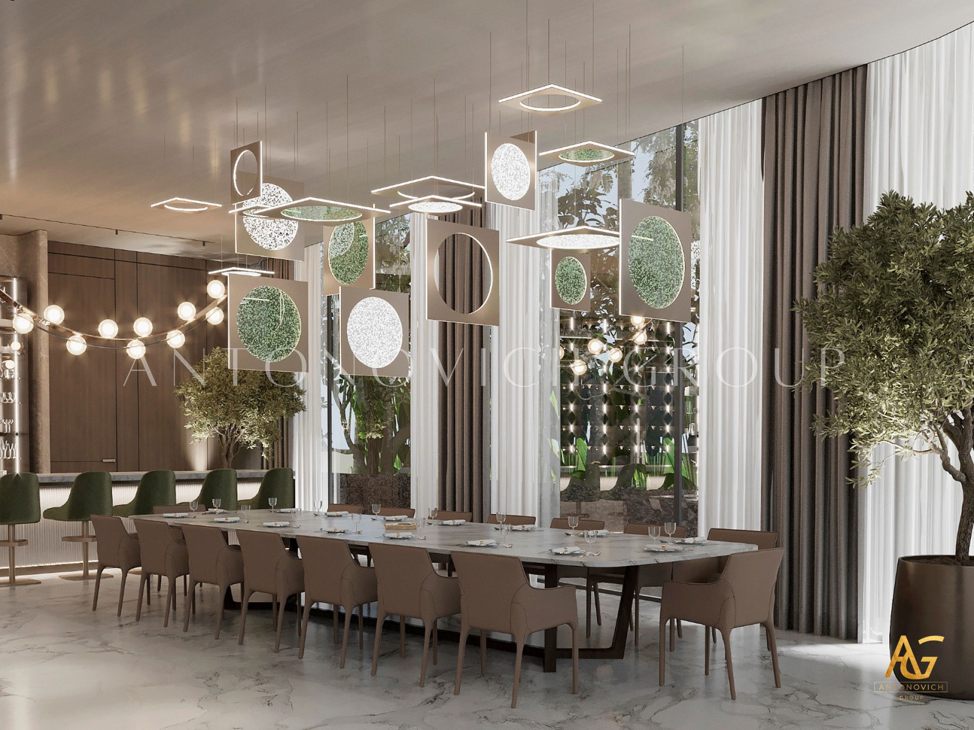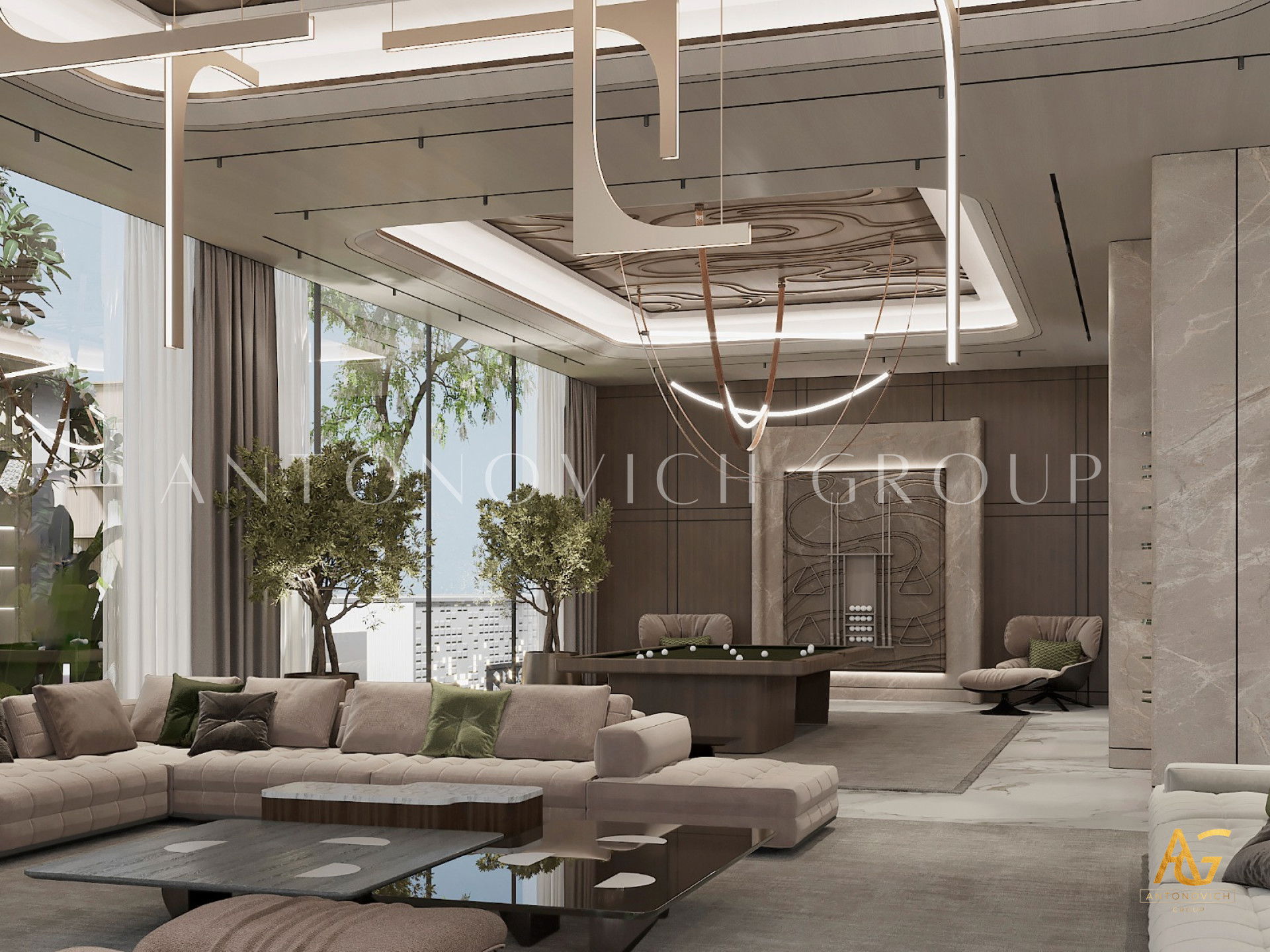 The interior design Dubai Luxury Antonovich Design is a wonderful opportunity for our customers to get really bright and unique interior, which is always comfortable, luxurious and warm. And no matter what the style of the interior is, it remains unchanged in each author's project in perfect harmony, perfection and aesthetic perfection. The living room design in a contemporary style is complemented with ornate accents of art deco. In the living room a nice range of warm shades of beige, chocolate and cream is dominated. These shades are cute diluted with turquoise accents of silk cushions on the sofas. The windows have curtains with noble silk of two hues. Shining surface of precious marbles in bright colors outlined rectangle of brown marble. This combination is present in the windows decoration. Against the background of bright silk brown silk curtains that are picked up by turquoise ribbons, looks bright. Glow of the marble decor enhances the ceiling with an abundance of stylish lighting of author's chandelier with tender curls. Living room interior design is in harmony with the dining area design. These two space are separated with stylish columns and elements of the LED backlight. Elegant and stylish table is surrounded by chairs with graceful forms. Interior design Dubai from Luxury Antonovich Design always features spectacular design techniques and exclusive solutions. Living room interior design always has a pleasant feeling of warmth comfort and absolute comfort.