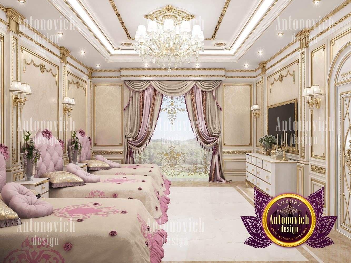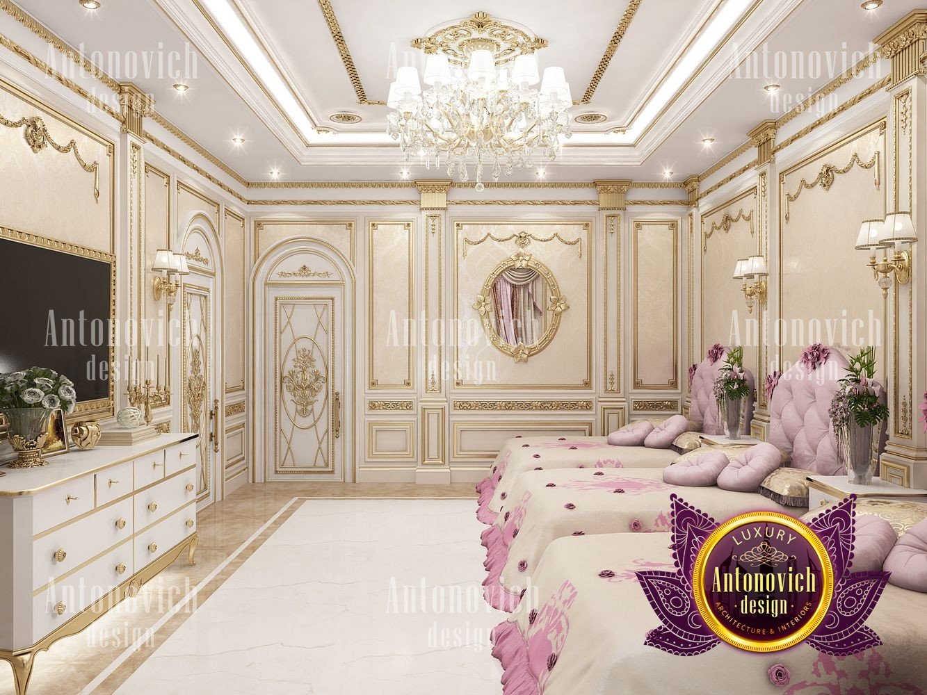 This luxurious bedroom interior design for girls is part of an expensive villa design project in Lagos. The entire house is filled with the most glamorous and expensive decoration and furniture set up as it has a classical interior design concept. Even this bedroom is being required to have feminine touches of style, Luxury Antonovich Design still manages to create very luxurious details of gypsum, walls, ceiling, and even every selection of lighting, chandeliers, and decorations to sustain a consistent interior design mood for the expensive villa design which has a classical concept. There is a three single bed in this room which has been perfectly arranged in the right and balance alignment having an equally beautiful and stylish bed arrangement. A very stylish gold detail has been performed as a very special accent towards the walls and ceiling which perfectly matches with the lighting and chandelier design. Luxury Antonovich Design has selected the finest fabrics which are made up of premium class materials and design for the linens and bedsheets as well as for the curtain and shades.