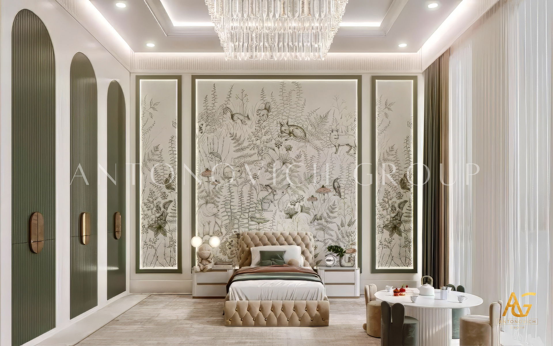In every villa interior design project, Antonovich Group ensures that children’s spaces align with the home’s overall theme while maintaining their own identity. The modern kids’ bedroom with dressing room embodies this philosophy—uniting elegance with functionality. High-quality fabrics, sustainable materials, and bespoke finishes come together to create a luxurious yet child-friendly environment. The firm’s design team pays close attention to air quality, lighting balance, and acoustic comfort—ensuring that every room supports both play and peaceful rest.