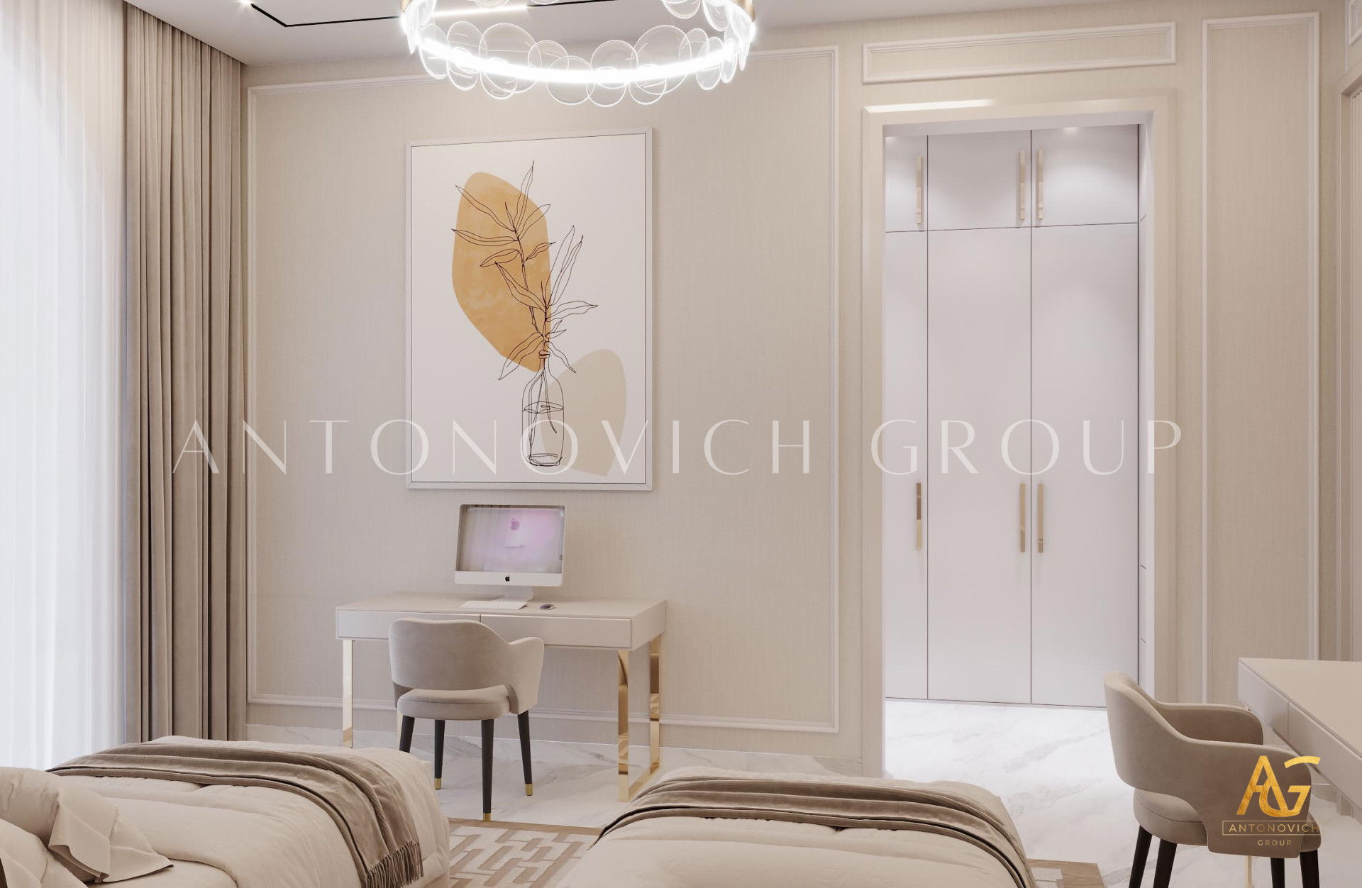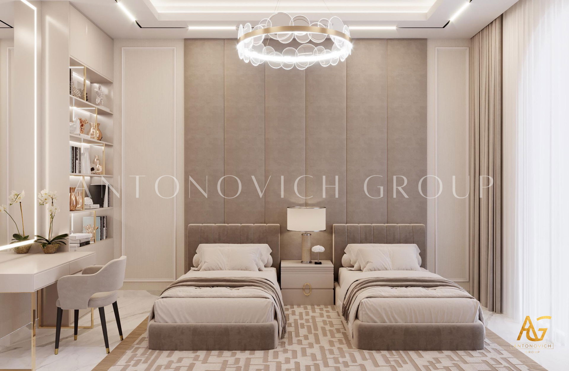 The fantastic television rack is one of the most distinctive characteristics of this luxury childrens bedroom interior design. The TV rack is triangular in the middle with little triangles on each edge. The illusion adds a lovely atmosphere to the luxury childrens bedroom interior design. It also includes a lovely and soothing sofa in the middle and tiny seats alongside it. The arrangement is thoughtfully constructed, so relaxing here is wonderful.