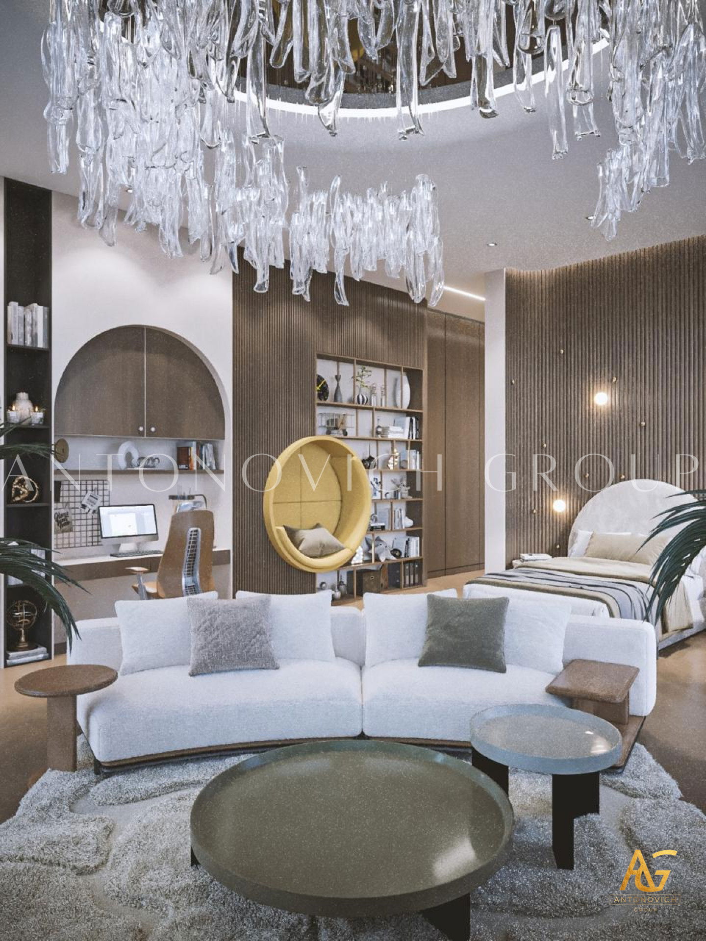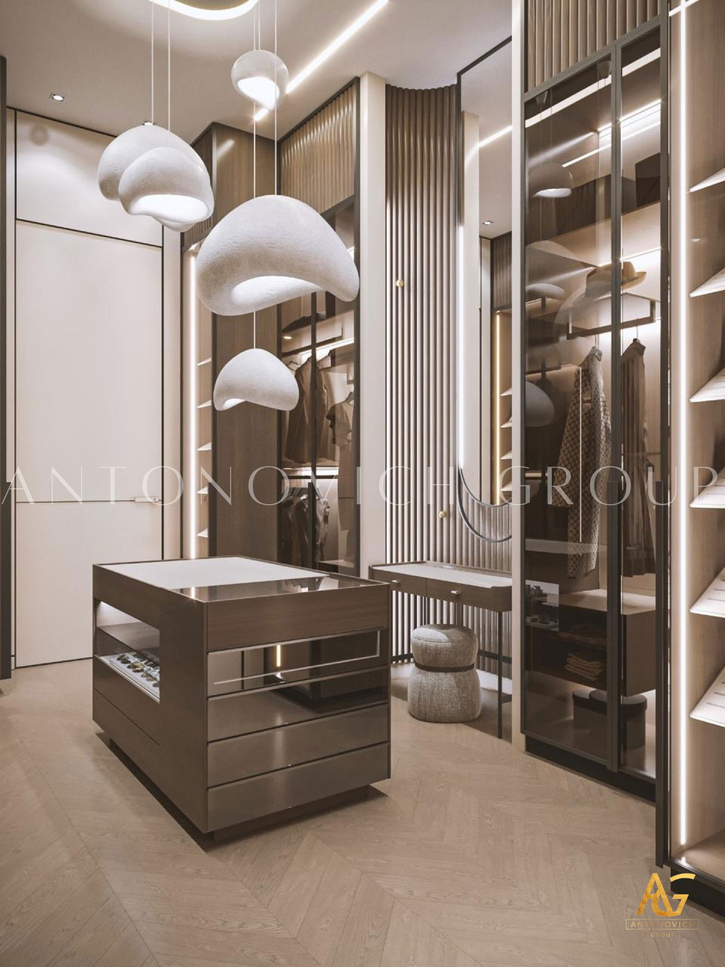 The Luxury Antonovich Designs designers suggested creating a room in which everything obeys the laws of absolute happiness in this project of a childrens room in an elite apartment. The interior has a unique functionality and ergonomics. Designers had to use the maximum imagination so that everything younger son of the apartment owners likes, his favorite toys, books, and souvenirs became an integral part of the cozy interior of the childrens room. A very interesting, practical and quite cozy solution was offered by designers for window decoration. Furniture in the English style became as an extension of the window opening and the walls. Here you can comfortably store all things, and the window-sill it is a desk with all the necessary attributes. The light color of furniture close to ash-gray contrasts very beautifully with curtains made of dark green silk. A small space is very comfortable, cozy and reflects the character and hobbies of the child. Other walls interior designers suggested decorating with special wallpaper from a new collection designed for childrens rooms. The world map on the wall in gentle shades fills the room with the beautiful romantic and dreams. Comfortable looks natural parquet from light wood and a carpet with a light geometric ornament. The main colors of the interior are the pastel. With such a background, the ceiling in the form of a starry night sky with special LED lights looks very rich and bright.