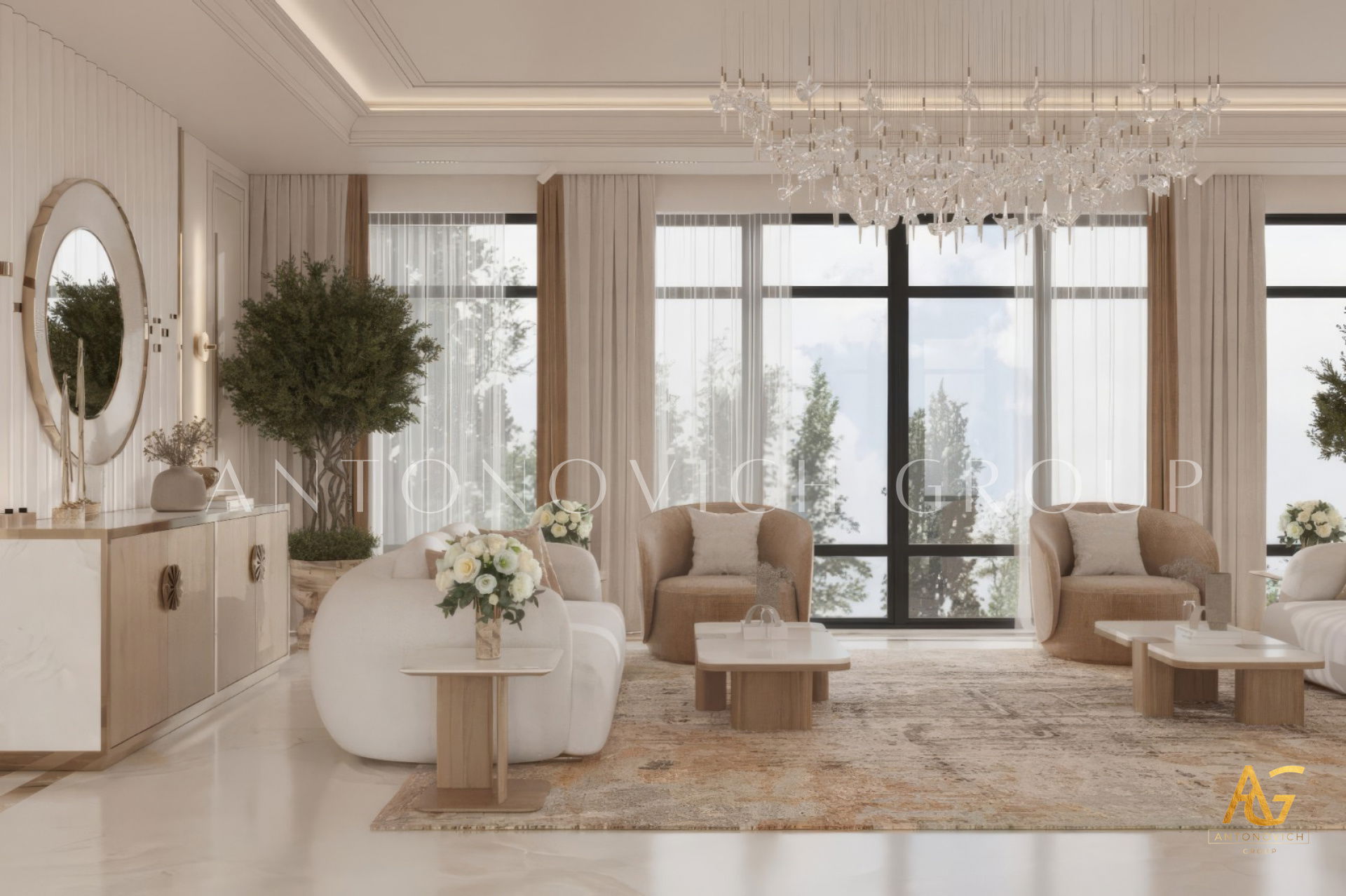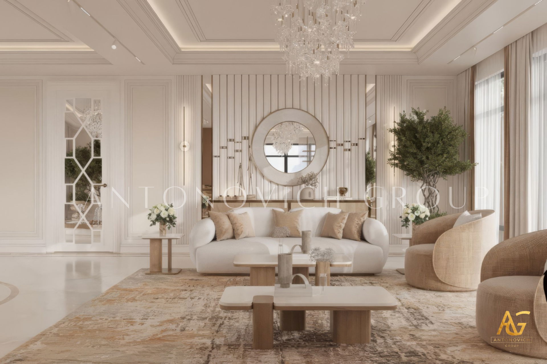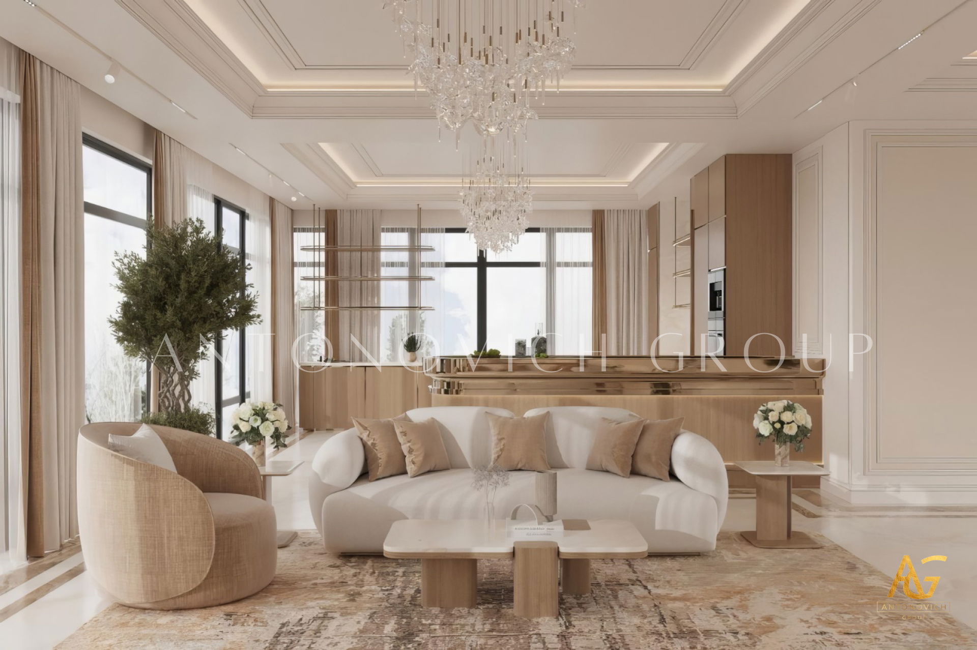 Antonovich Group’s living room projects stand out due to their meticulous planning and execution. From the initial concept to the final installation, every element is carefully curated to achieve a balance of luxury, comfort, and aesthetics.