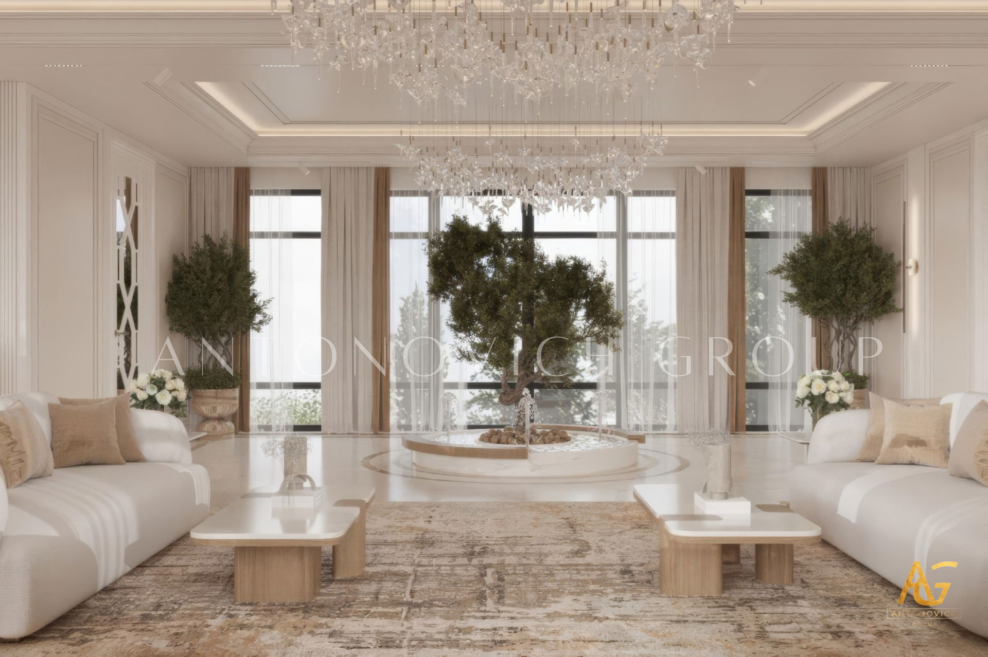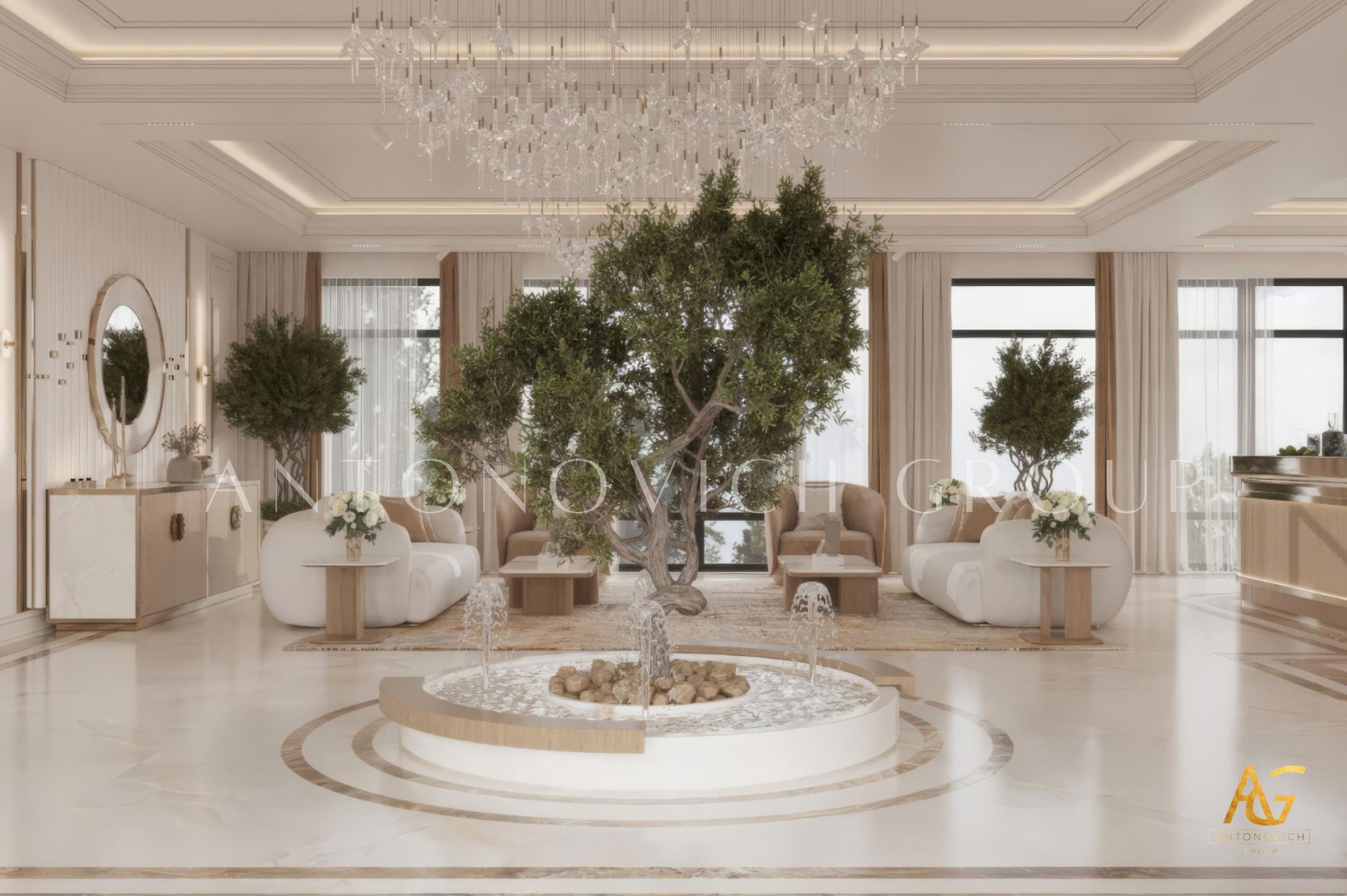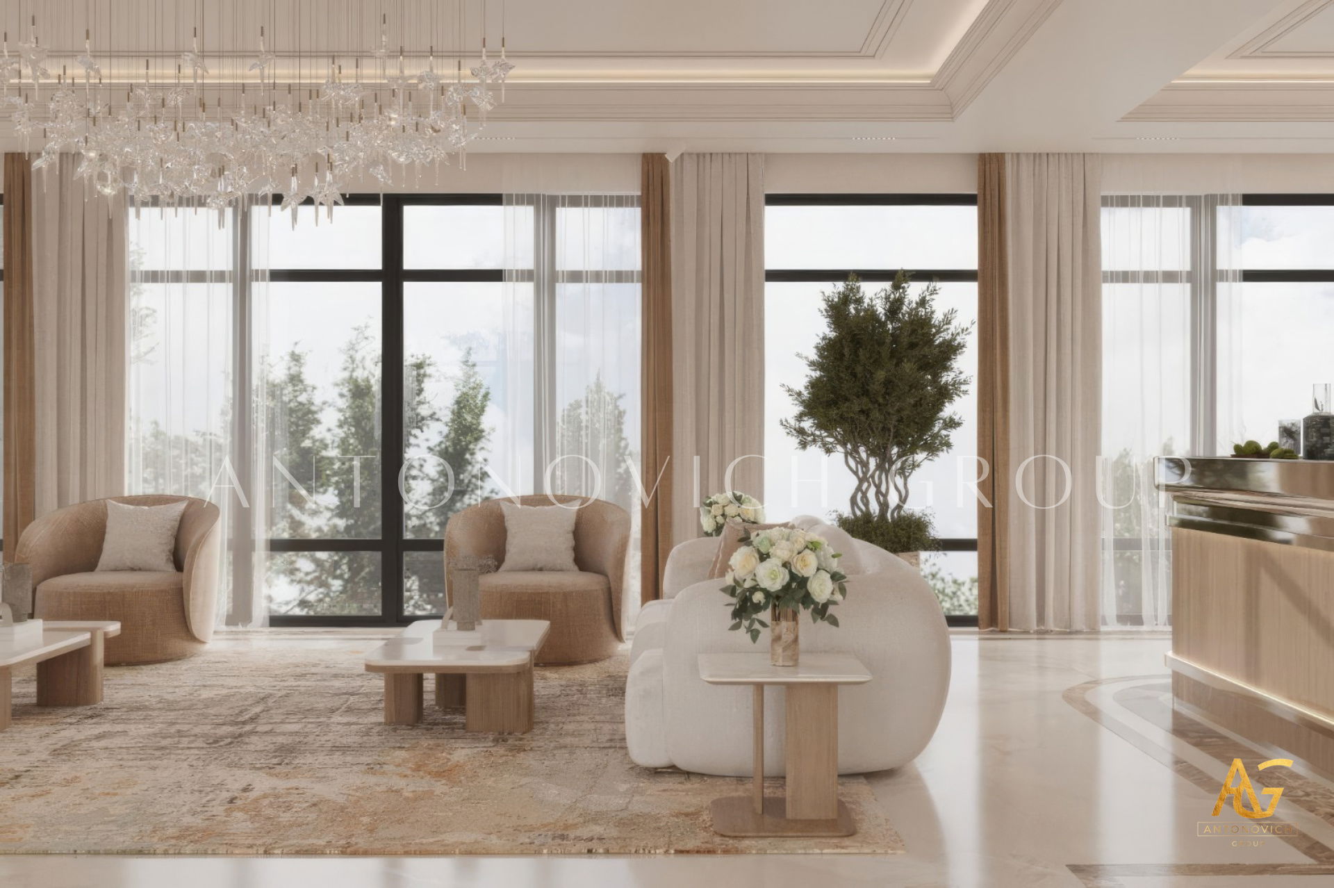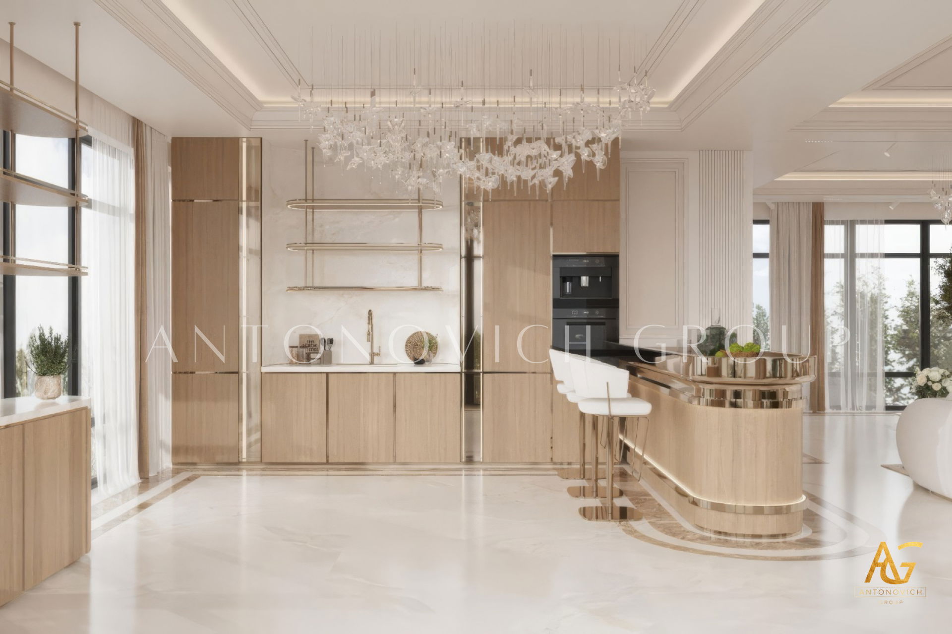 Antonovich Group’s living room projects stand out due to their meticulous planning and execution. From the initial concept to the final installation, every element is carefully curated to achieve a balance of luxury, comfort, and aesthetics.