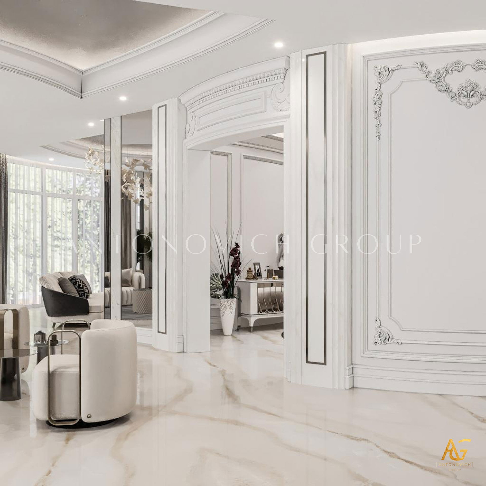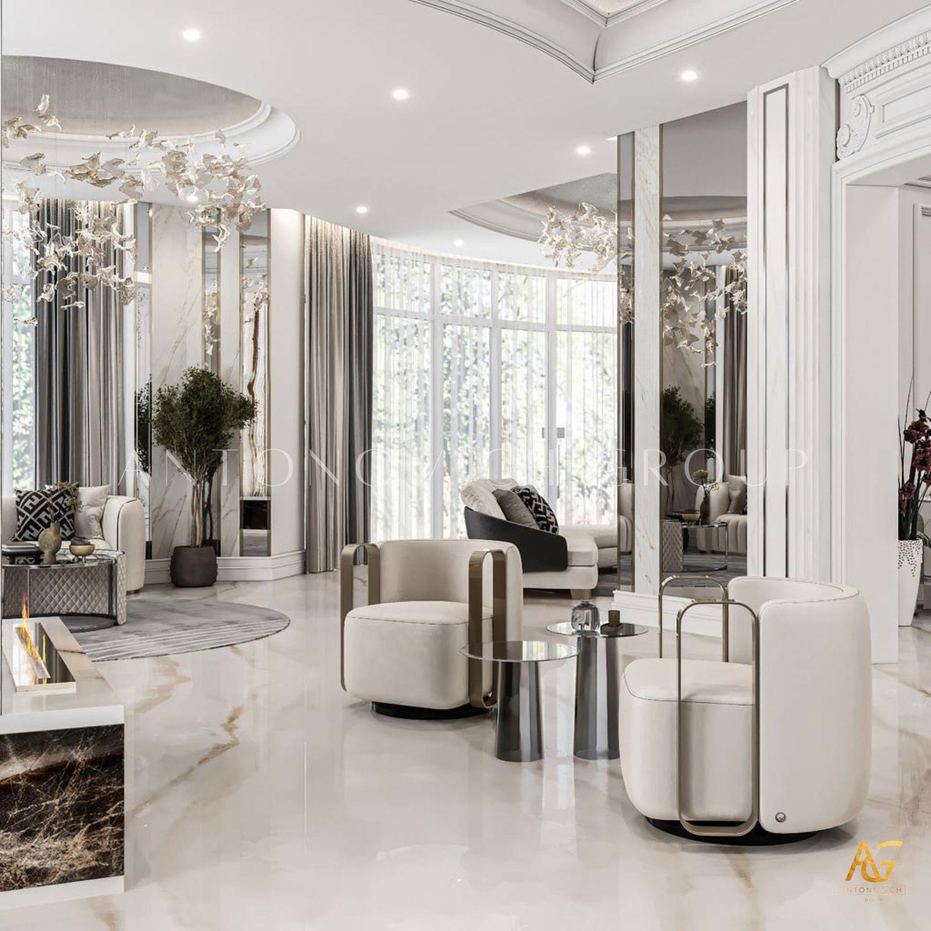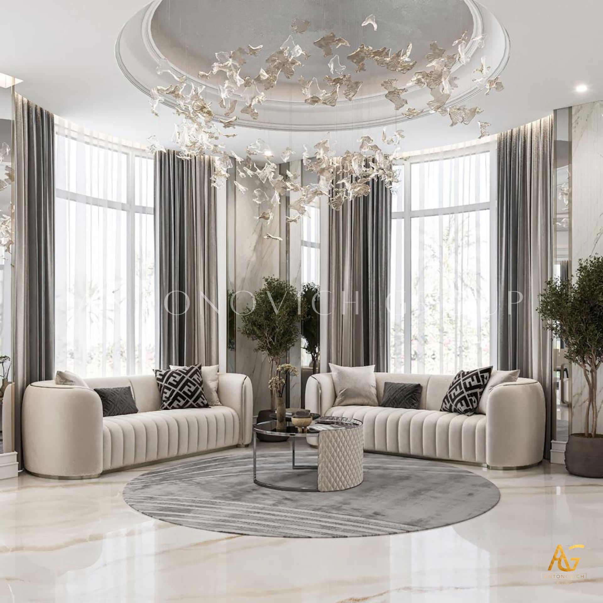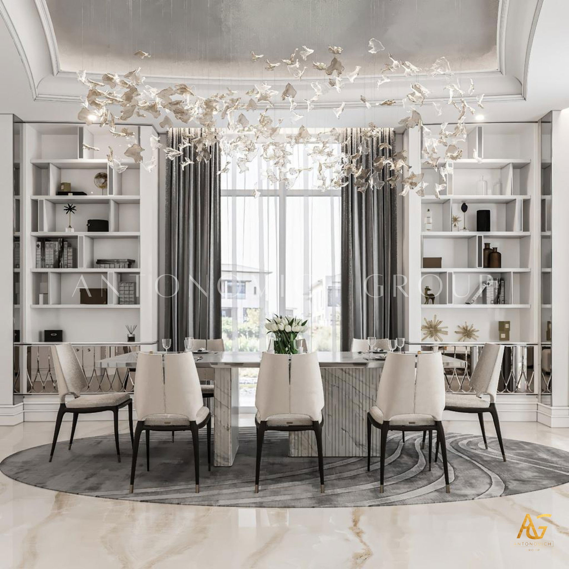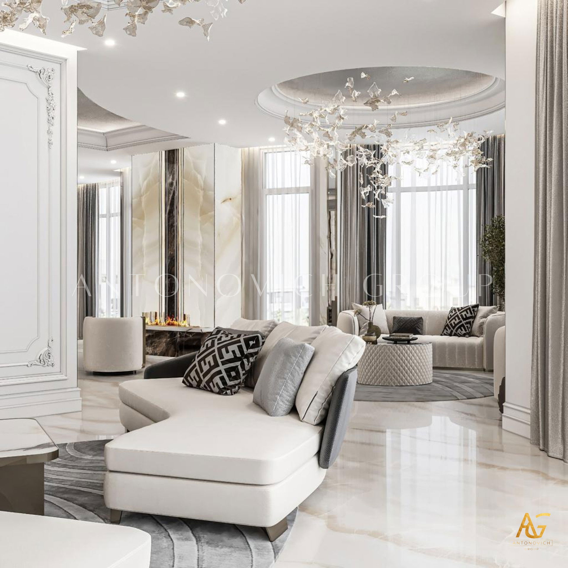 Living room interior design of the studio design in Dubai Luxury Antonovich Design filled the luxury apartment with cozy and warm mood with a touch of laconism. Nice shades, from light beige to brown, prevail in the living room interior. The complex geometry of space, thanks to a spectacular design techniques looks very harmonious. In keeping with the trend towards open spaces, interior designers Dubai zoned interior with decoration of floors and ceilings. The ceiling is divided into niche of regular geometric shapes. Every niche is filled with tension ceilings of light brown colour. The glossy ceiling reflected charmingly stylish chandeliers. The fact that each chandelier’s pendant is attached to a separate subtlest rope, creating a beautiful effect of floating in space. This gentle and refined ceiling decor is continued with laconic floors. Luxury interior design involves the use of luxury materials. There on the floor natural marble of light shade is complemented with darker marble. With exquisite carvings authors of the project outlined the boundaries of each zone of the interior. Furniture is upholstered in noble creamy silk. To give the interior expressiveness, interior designers Dubai used in the decoration of the walls wood of valuable species, which is covered with a special varnish. The living room design is a unified with the design of the kitchen and dining room. The kitchen is more inclined to a minimalist style. Smooth glossy facades modestly and elegantly highlight the luxurious look of the living room.